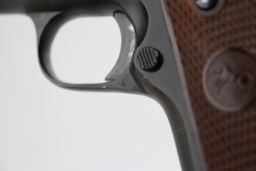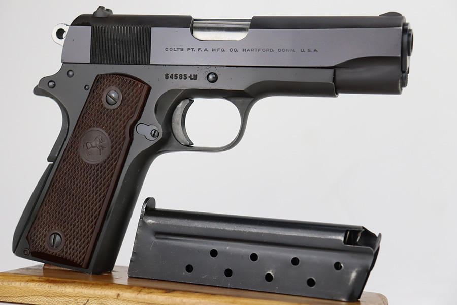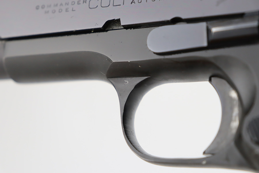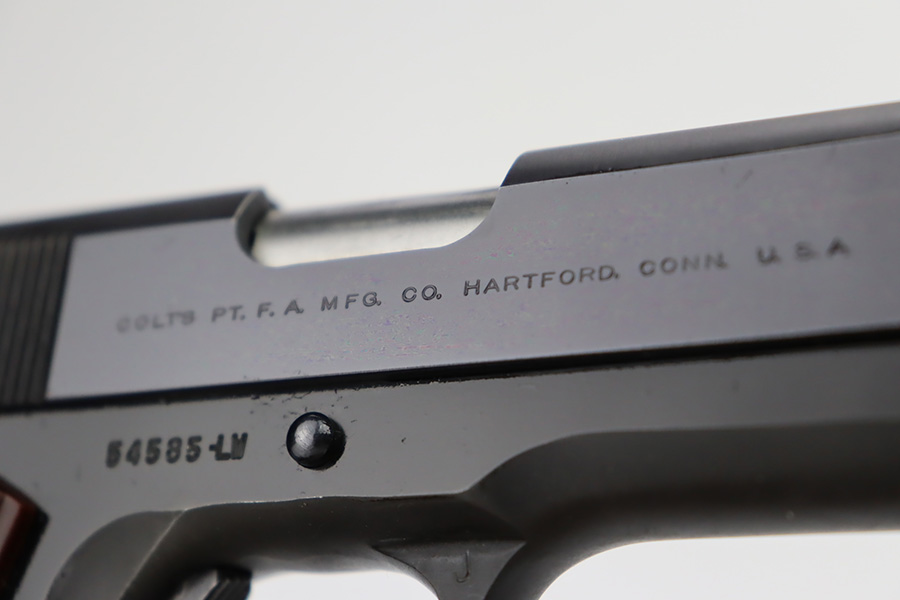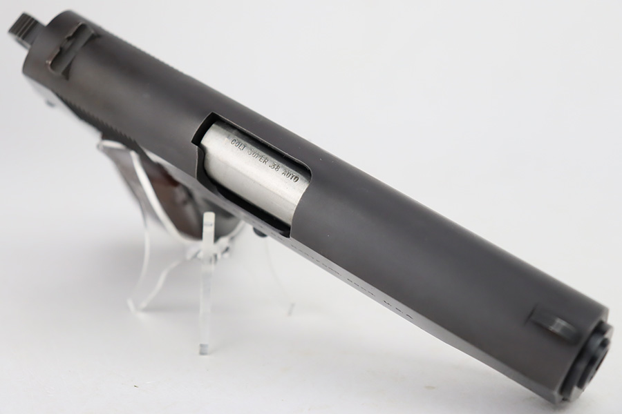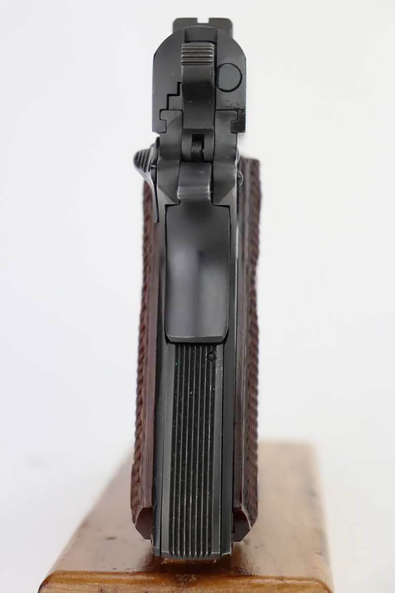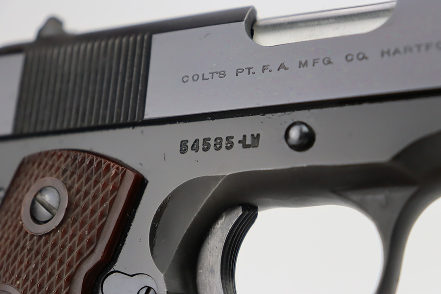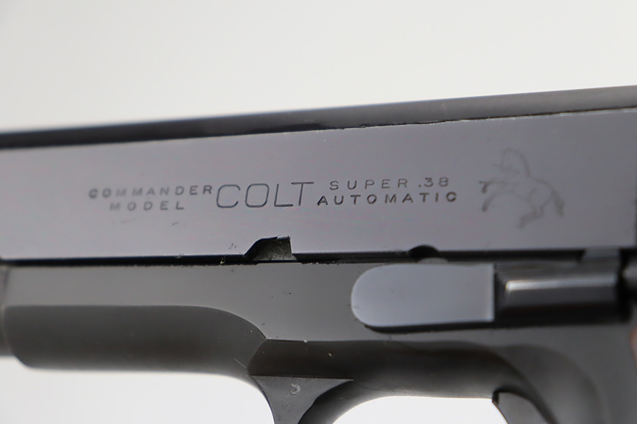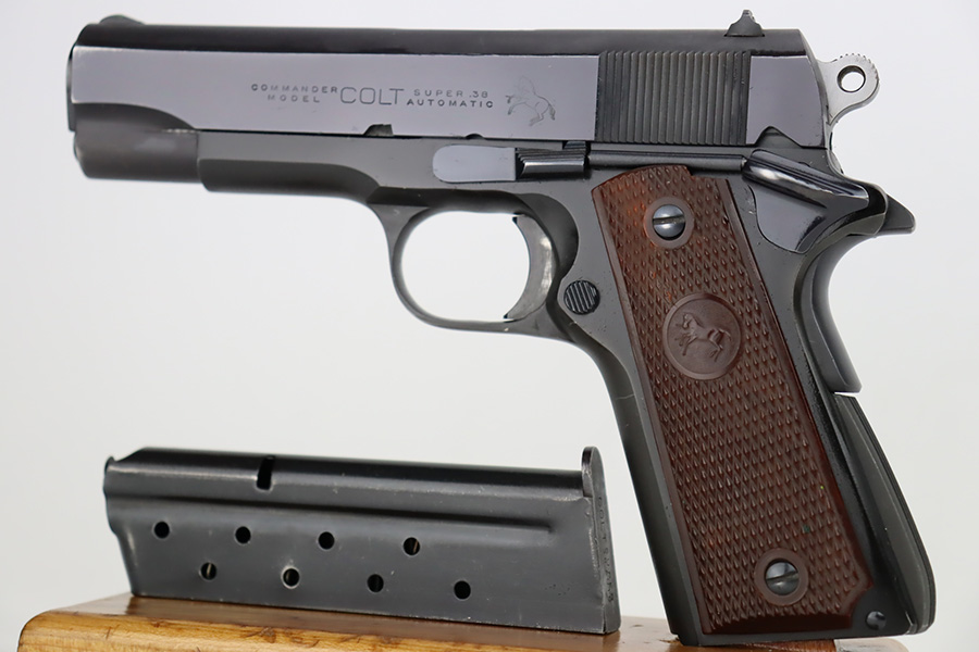 9/27/23 – This is a minty example of a scarce Colt Commander Lightweight that is chambered in .38 Super. Made in 1968. All matching with a lightweight aluminum alloy frame. It has retained about 98% of its original finish with minor wear on the front left edge of the slide. Fitted with excellent period-correct brownish plastic grips and comes with one magazine. Mint bore.