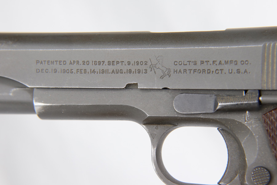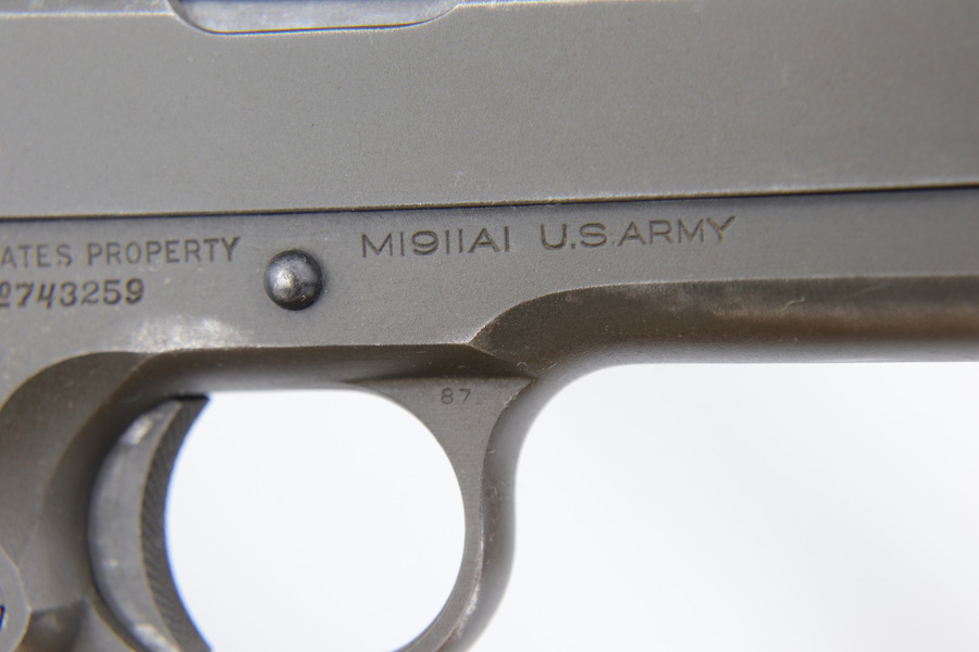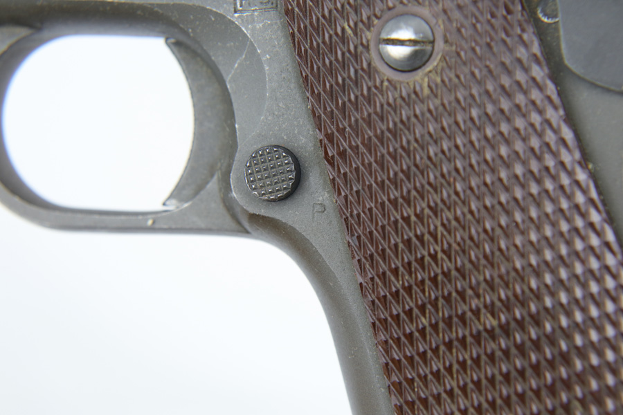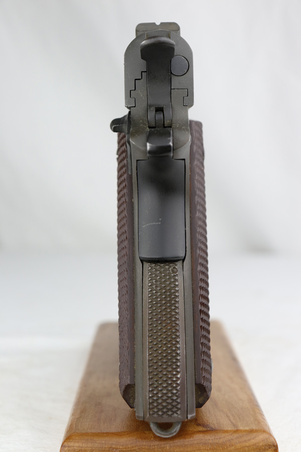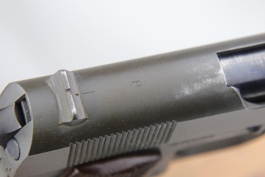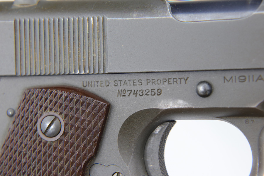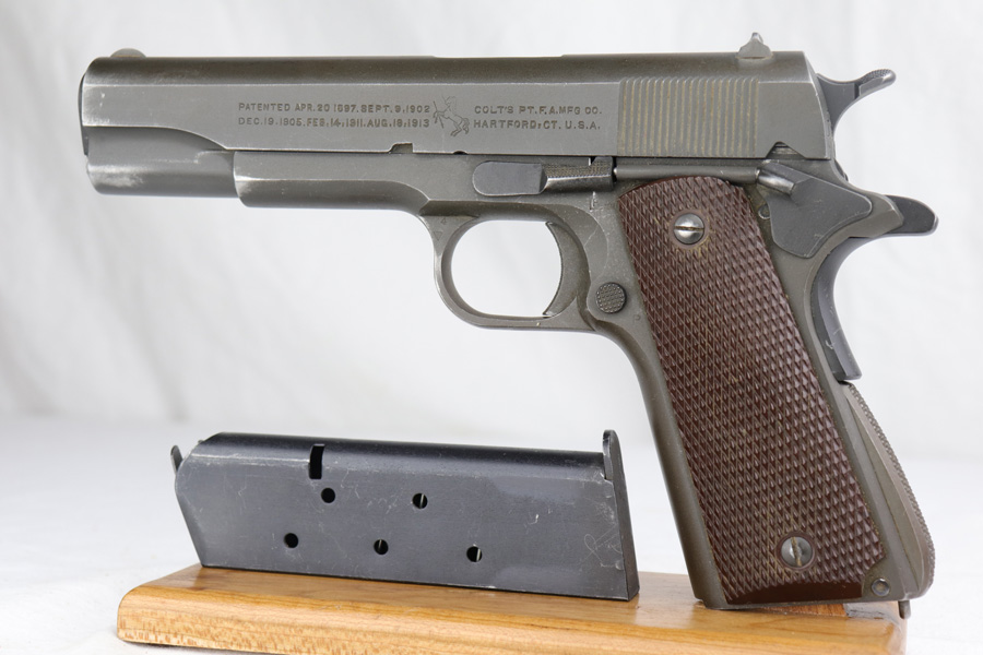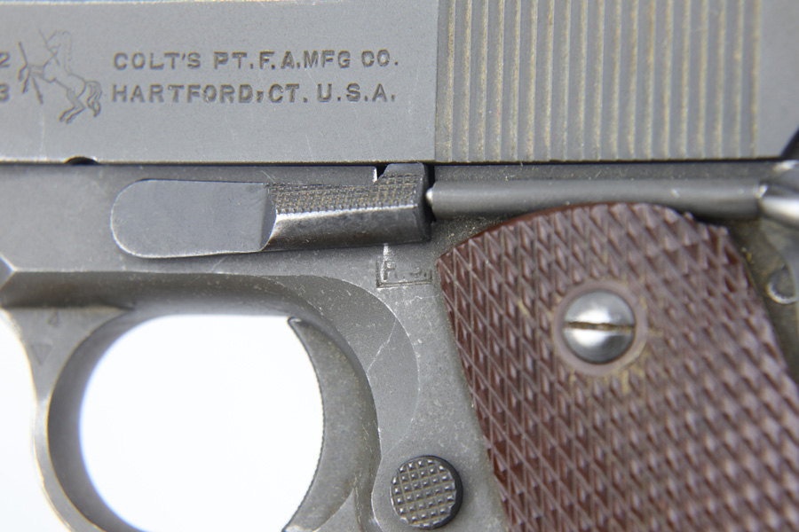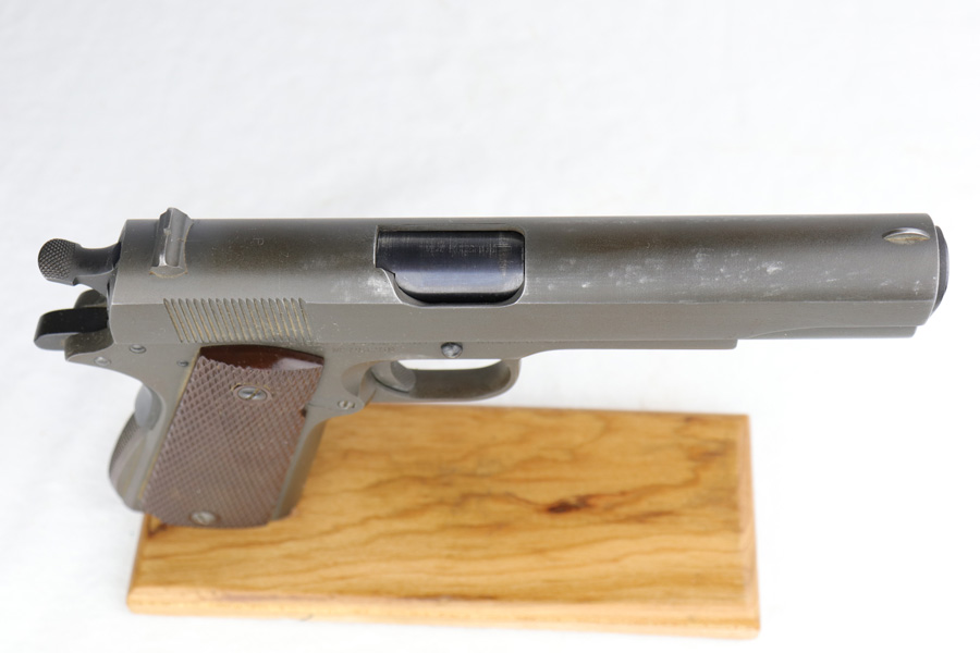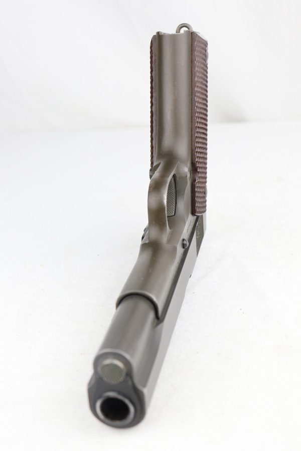 1/11/21 – This is a scarce, original example of a Colt M1911A1 that was manufactured in 1941. There were only ~35,000 produced that year, fewer than the production numbers of the Union Switch & Signal 1911A1’s, for example. The pistol has proper RS inspector mark on frame, both internally and externally. The slide is matching numbered the frame and the barrel is a proper Colt example with large ‘G’ under lug. Excellent grips. Bore shows minor frost but mostly shiny with good rifling. Original parkerized finish rates at about 95% with muzzle and edge wear, as well as some thinning on the top of the slide.