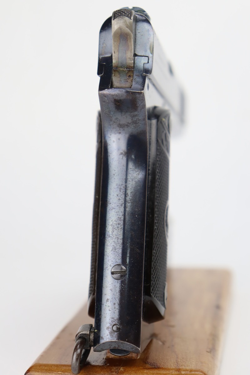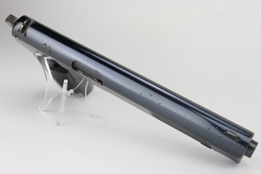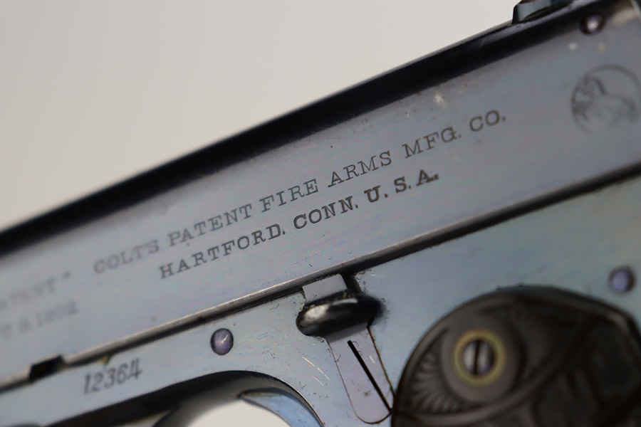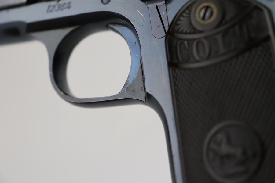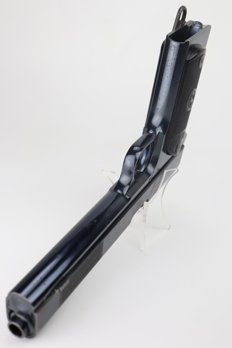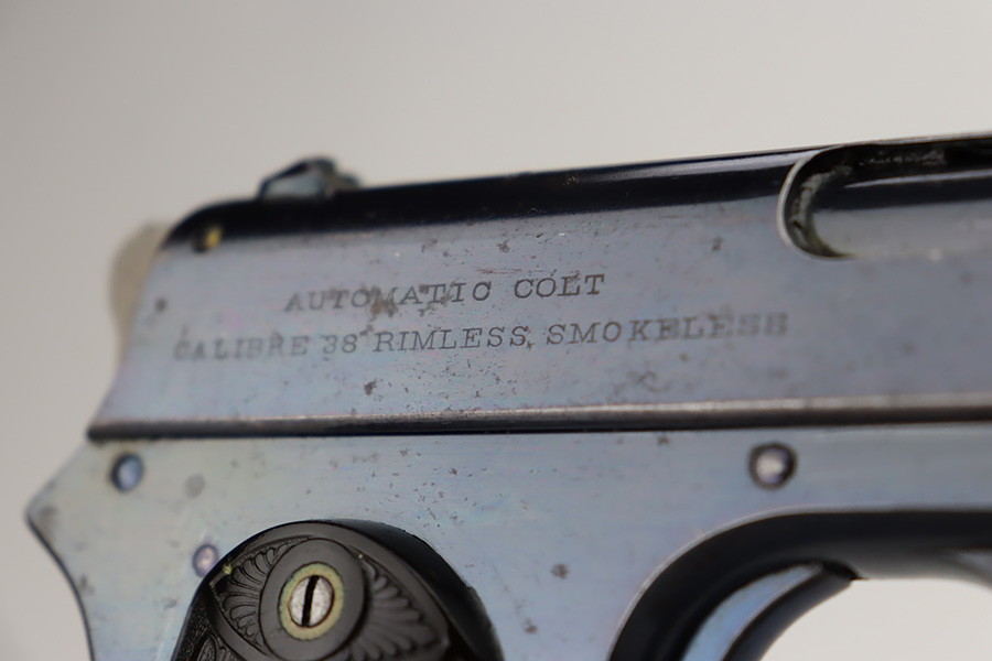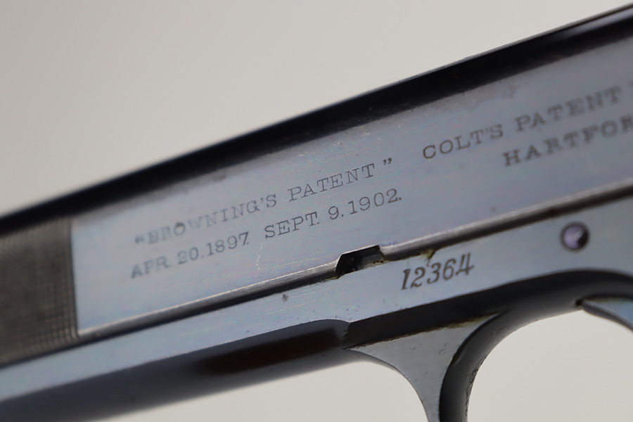 9/25/23 – This is an original example of an early and desirable Colt Model 1902 pistol, that was manufactured in 1905. There were only ~18,000 of this model produced, all between 1902 and 1928. The military model can be distinguished by the rectangular shape to the frame, swivel lanyard loop on frame, and the additional cartridge capacity in their magazines. This model was chambered for .38 Rimless, and is very similar in design to the innovative M1900. This particular example has retained about 95% of its bright Colt bluing. Minor wear around the muzzle. While there is very little actual finish loss, there are micro-scratches in the finish throughout and some areas of light spotty oxidation – most noticeable on the grip straps. Fitted with hard rubber Colt grips and comes with one proper magazine. Mint bore.