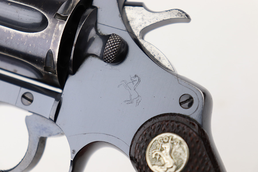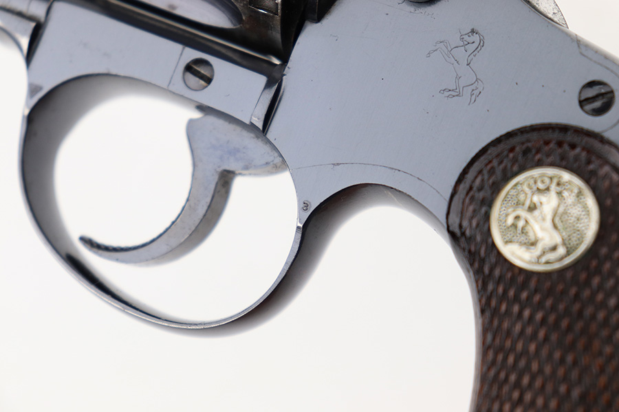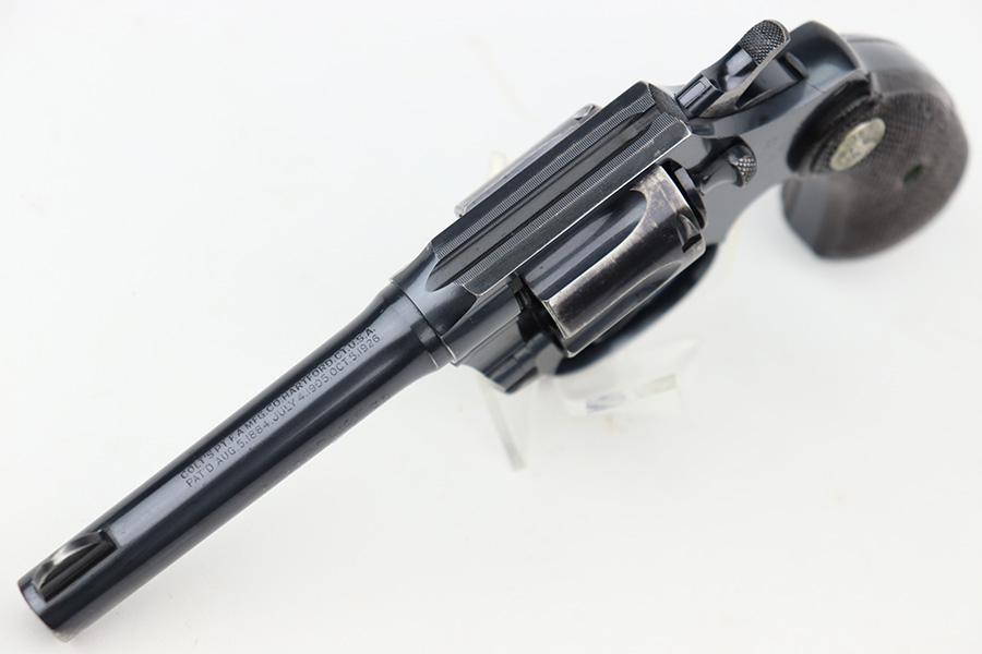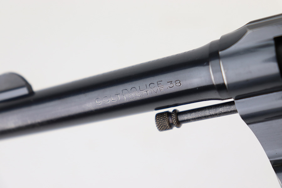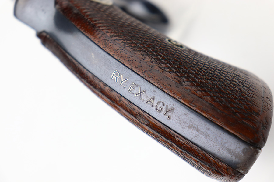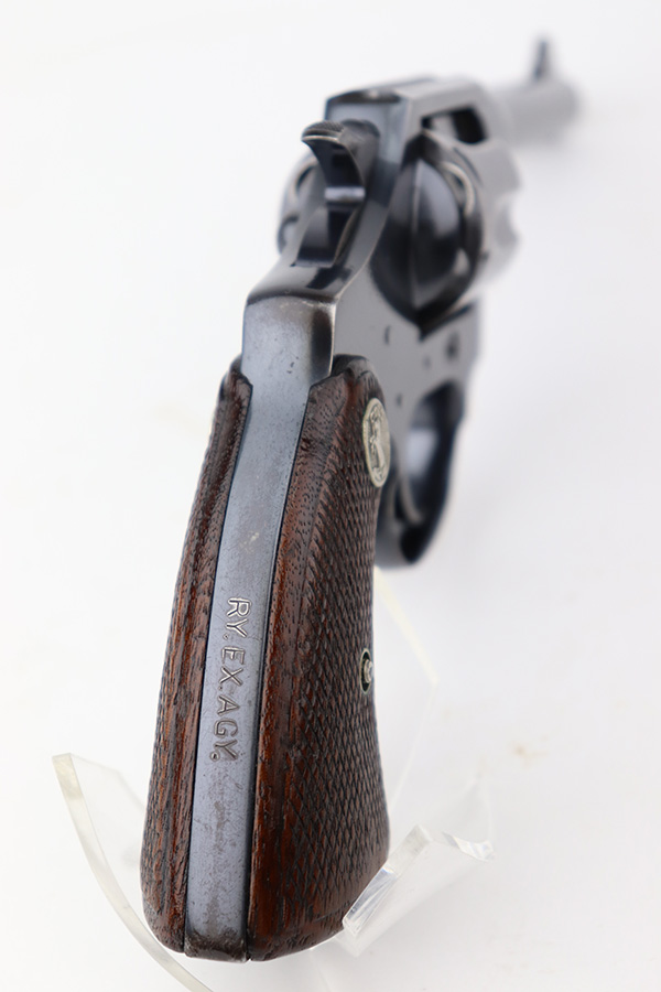 12/7/22 – This is a scarce Colt Police Positive revolver rig that was sent to the Railway Express Agency in 1930, as indicated by marking on back of frame. It is all matching and has retained about 94% of its really nice original high polish finish. The majority of the wear is around the muzzle and on the high edges of the cylinder. Light roll mark on the cylinder as well. Some very light freckling on the grip straps and on the underside of the trigger guard. Mint bore. The cylinder is tight and the action is very smooth. Fitted with very nice period-correct wood grips – slightly worn along the edges and some tiny bruises on the bottom edges.