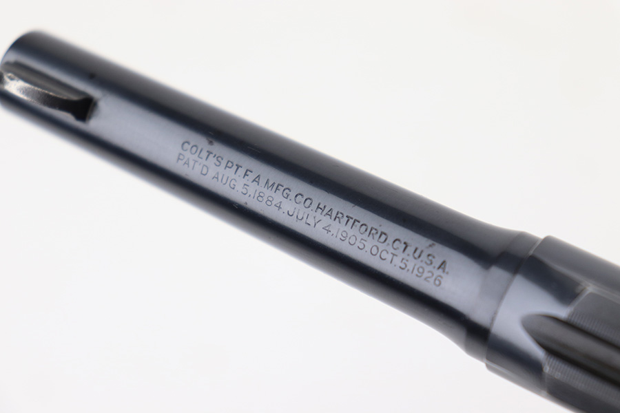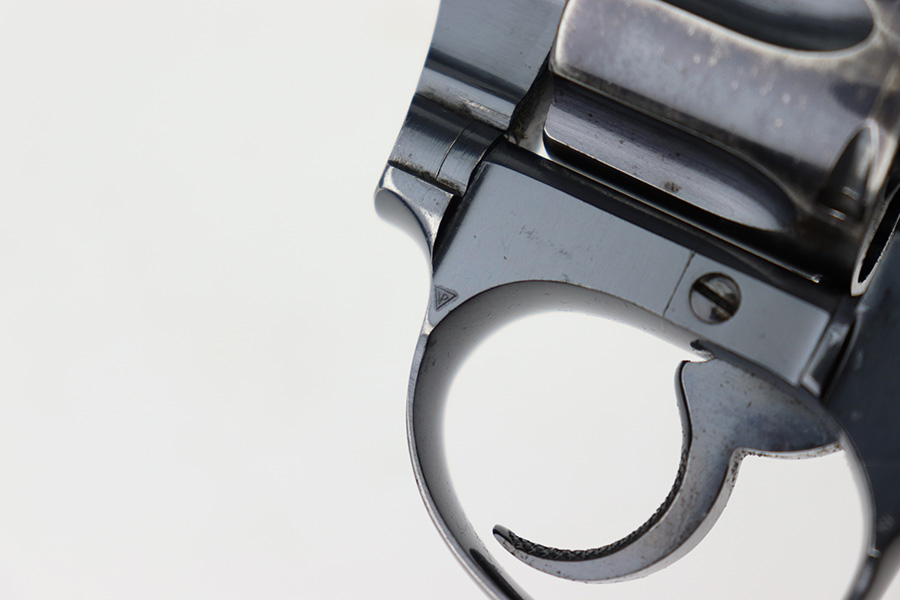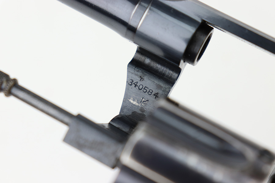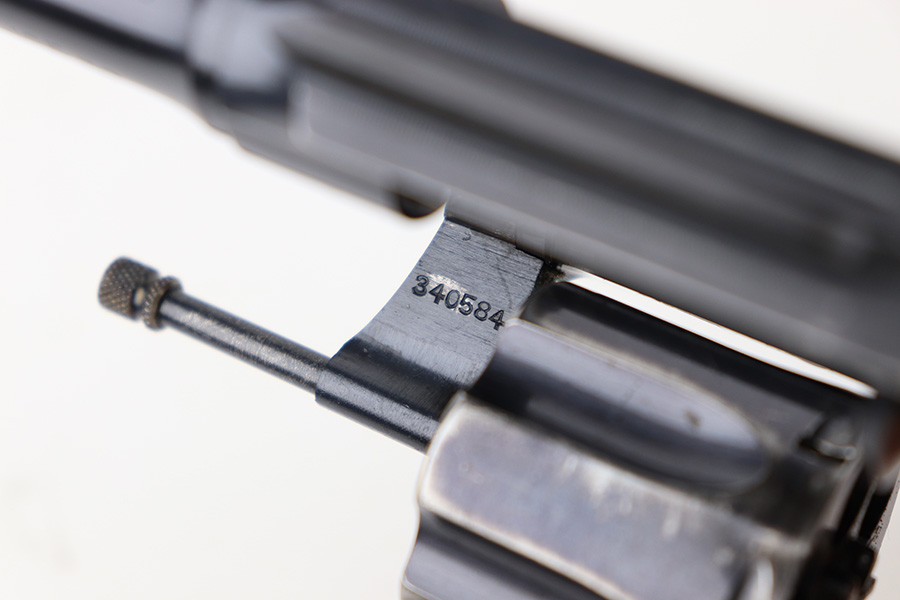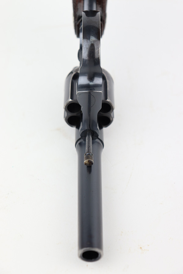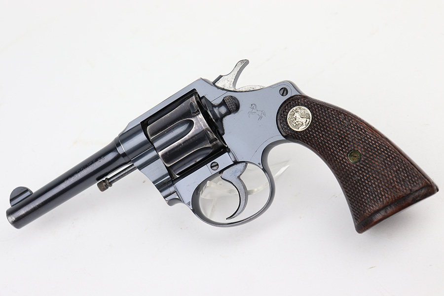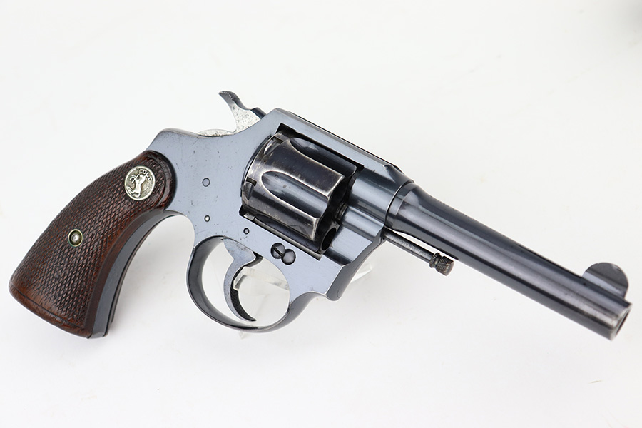 12/7/22 – This is a scarce Colt Police Positive revolver rig that was sent to the Railway Express Agency in 1930, as indicated by marking on back of frame. It is all matching and has retained about 94% of its really nice original high polish finish. The majority of the wear is around the muzzle and on the high edges of the cylinder. Light roll mark on the cylinder as well. Some very light freckling on the grip straps and on the underside of the trigger guard. Mint bore. The cylinder is tight and the action is very smooth. Fitted with very nice period-correct wood grips – slightly worn along the edges and some tiny bruises on the bottom edges.