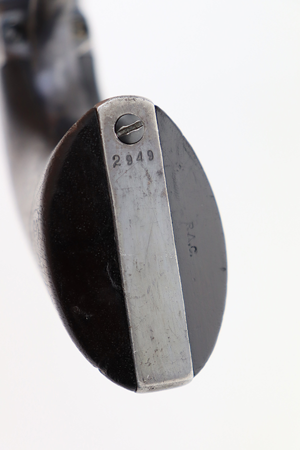 2/27/24 – This is a very nice all original Colt US single action artillery model. The action is tight as a drum and works perfectly on all 4 clicks. The frame is “US” property marked with various mixed military numbers. Overall, it is in very nice condition for its age. There is light scratchy wear on the barrel and noticeable finish loss on the frame. Fitted with “RAC” marked grips with military cartouches – the left side is dated 1902. Excellent, shiny bore with spectacular rifling.