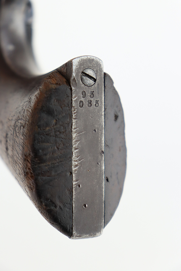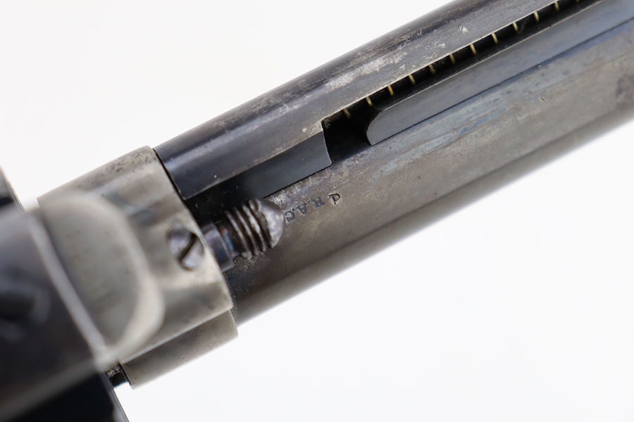 2/28/24 – This is a very nice all original Colt US single action artillery model. The action is tight as a drum and works perfectly on all 4 clicks. The frame is “US” property marked with various mixed military numbers. Overall, it is in very nice condition for its age. There is light spotty wear and patina on the barrel and noticeable finish loss on the frame. Most of the original bluing is intact on the cylinder. Fitted with “RAC” marked grips with a military cartouche on the right side – dated 1903. There are small chips in the bottom corners of the grips, and the bottom edges are dinged. Also, the butt of the frame has a series of dings. The majority of the bore is shiny with very strong rifling, but there are a few small spots of minor oxidation.