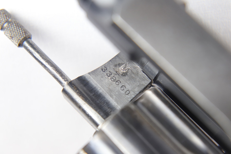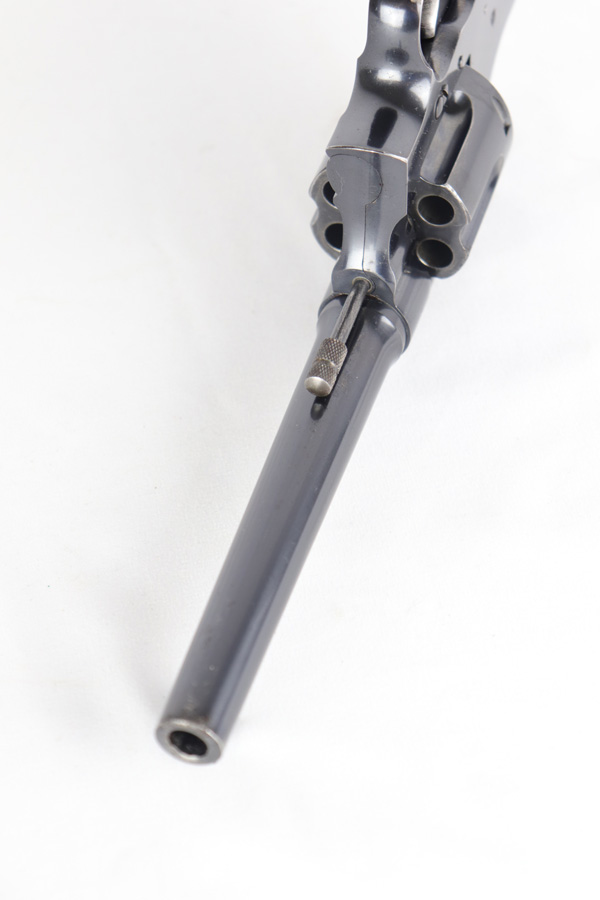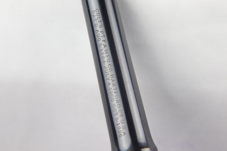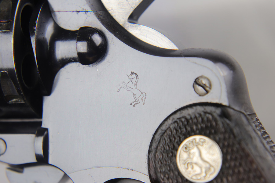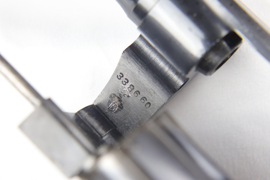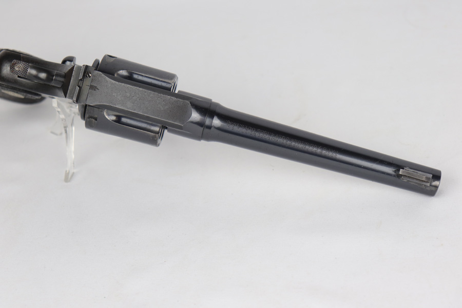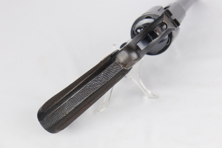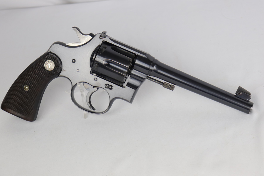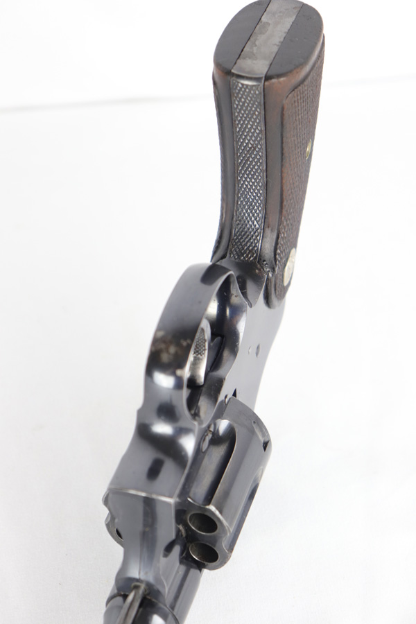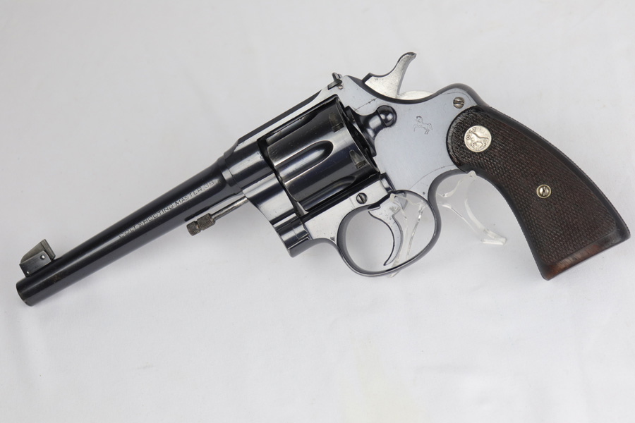 1/14/19 – This is a beautiful and very hard to find Colt New Service Shooting Master revolver. There were only approximately 3,500 of this revolver produced, with five different caliber variants involved, likely meaning there are only <1000 of this particular variation. The Colt Shooting Master revolver was introduced as a .38 Special target revolver for NRA match competition. It was shown privately to the top marksmen at the August 1931 National Matches at Camp Perry, Ohio and was unveiled to the public with the Colt Ace .22 LR model in a 1931 issued of American Rifleman magazine. The Shooting Master uses the Colt New Service Target frame except the Shooting Master has a slightly narrower and rounded butt and a parkerized finish is used on the top of the frame and extended to the grip just above the checking on the rear grip. The top of the hammer is also parkerized, but the rear of the hammer is blue. This particular revolver shows only some finish loss on the cylinder and barrel/muzzle, as well as a small area of surface pitting on the trigger guard. Terrific bore and proper timing/action. The original wood grips are minty and matching numbered to the gun.
