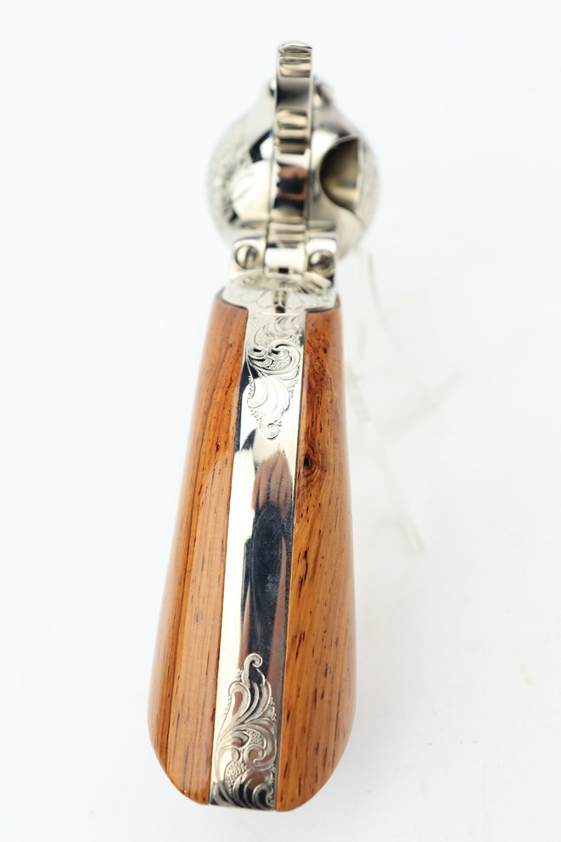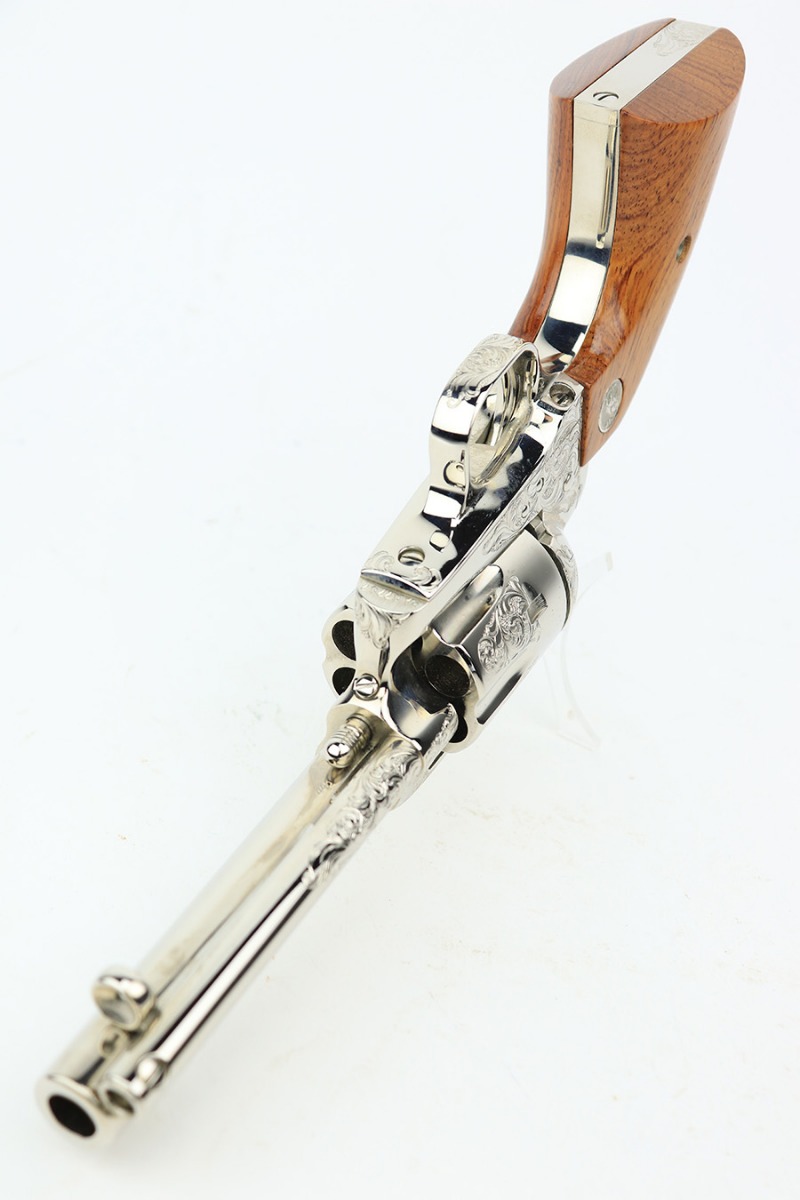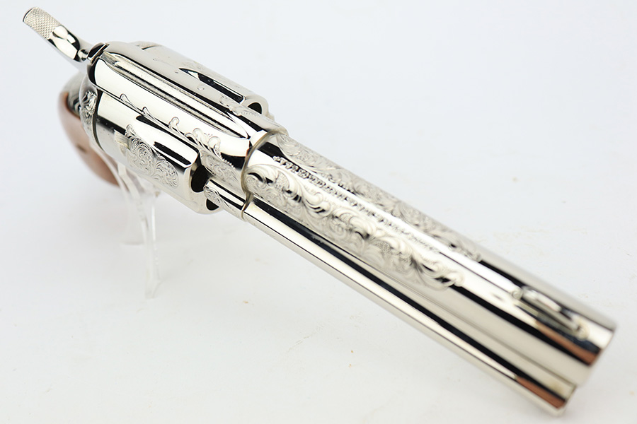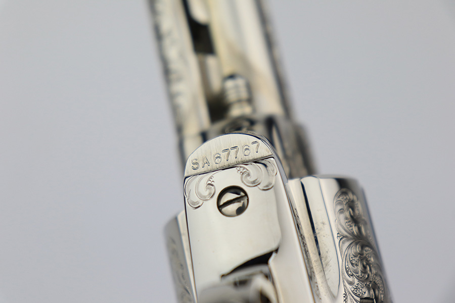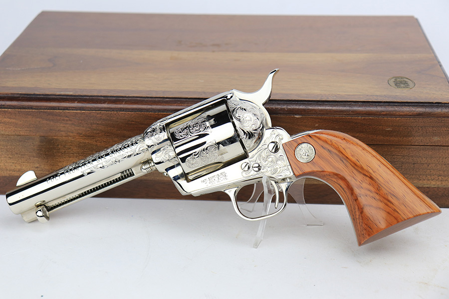 5/31/23 – This is a factory engraved Colt Single Action Army revolver from 1986. We have received confirmation from Colt that this gun was factory engraved, and shipped with factory nickel finish and 4.75in barrel. Rosewood grips with silver medallions. The gun has class B standard engraving, and is in mint condition with no turn line on the cylinder. Comes with the original Colt custom shop display case. We will forward the Colt letter to the buyer once we receive the physical copy.