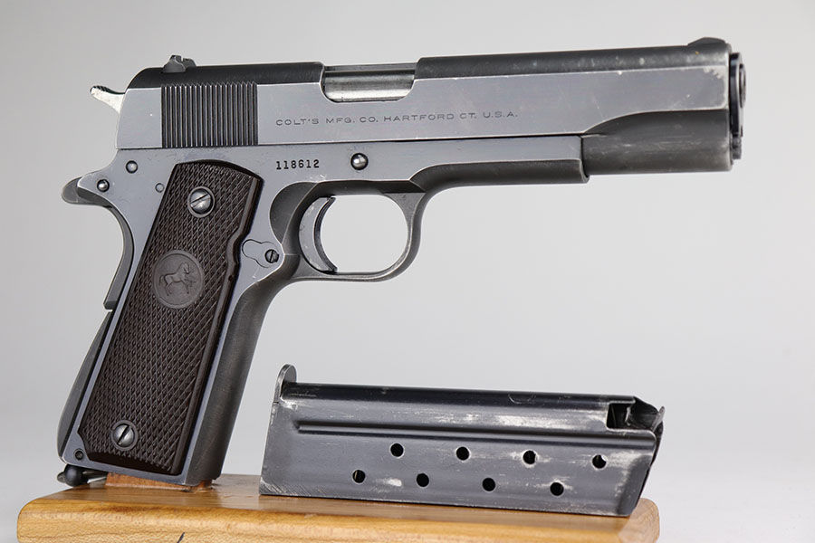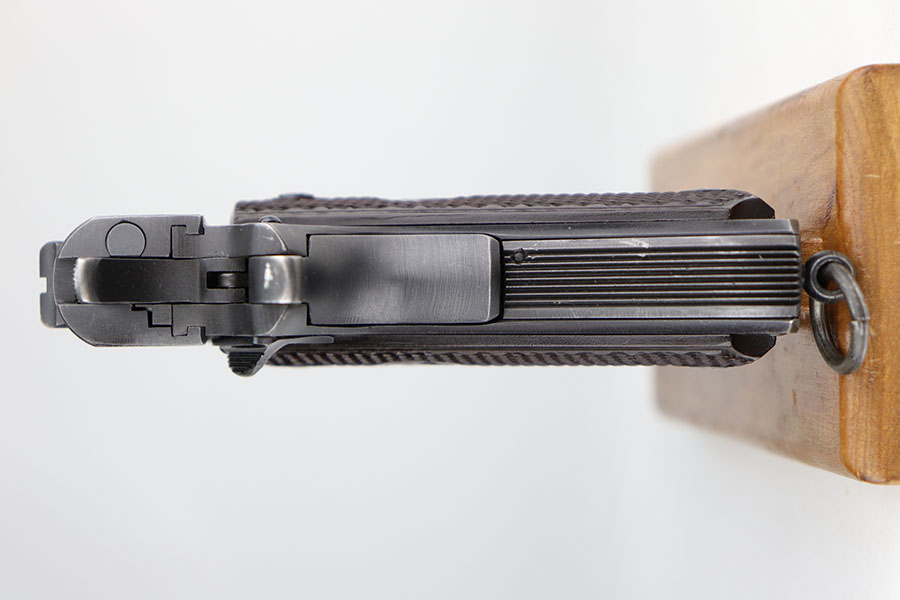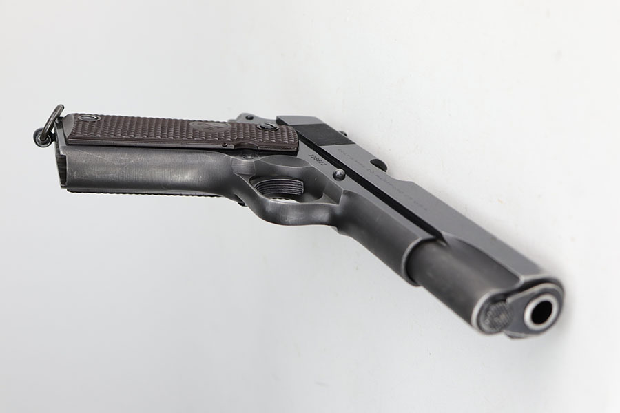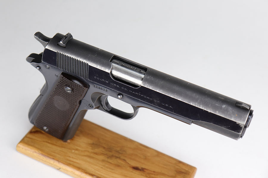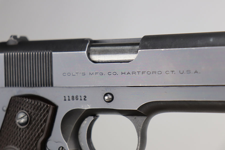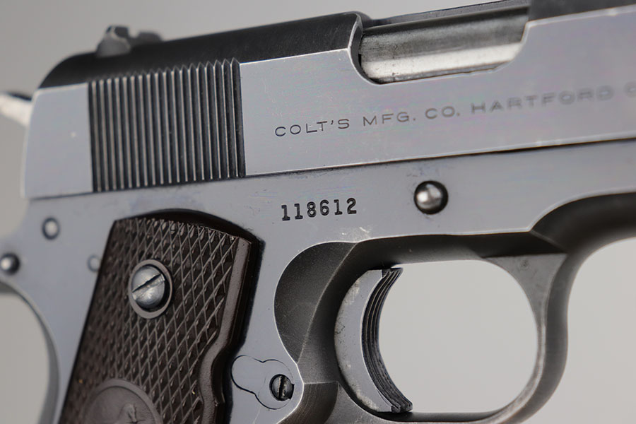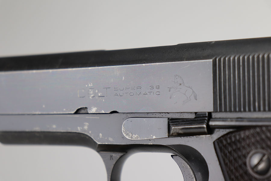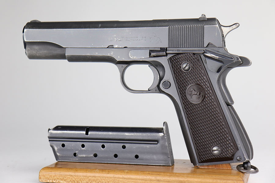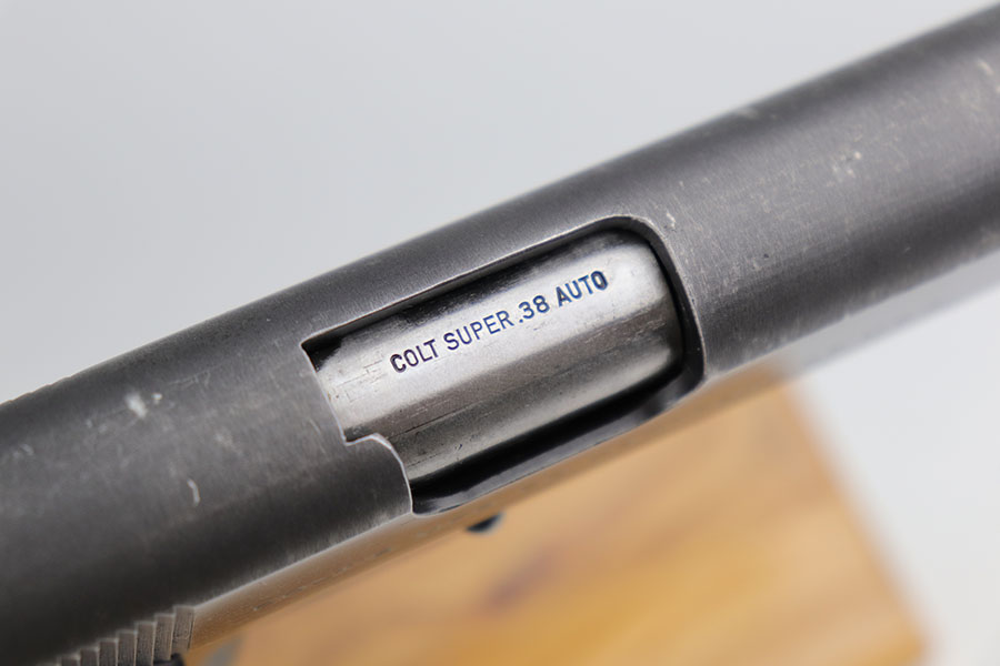 12/9/20 – This is a somewhat hard-to-find Colt Super .38 from 1955. It’s original and correct with maybe 85% blue remaining. Most of the wear is along the muzzle and top of the slide, but there’s also some freckling on each side. Minty bore. Excellent grips. Original magazine that’s marked COLT SUPER .38 AUTO on the base. Frame has a lanyard ring installed, unsure if this was a factory option or done later.