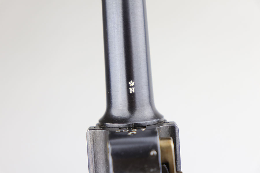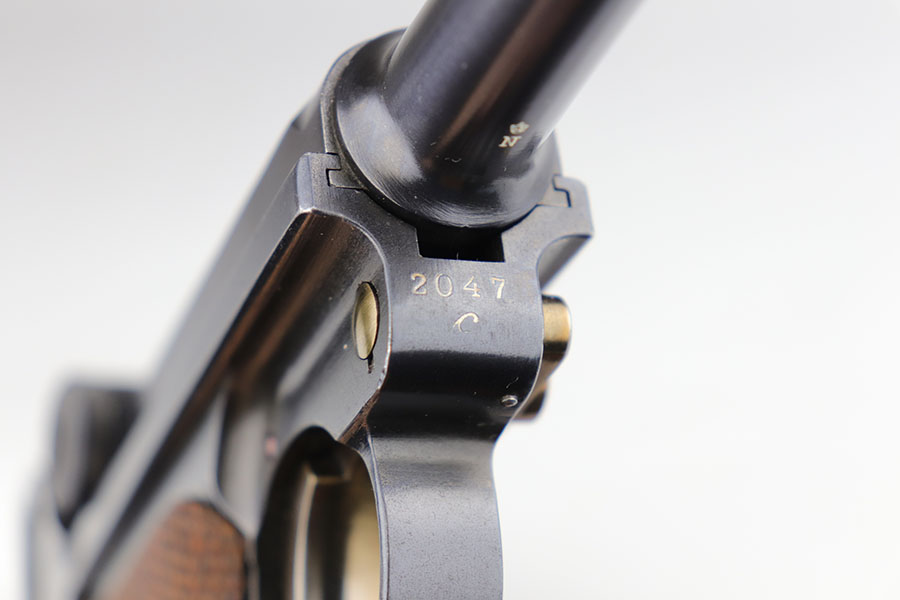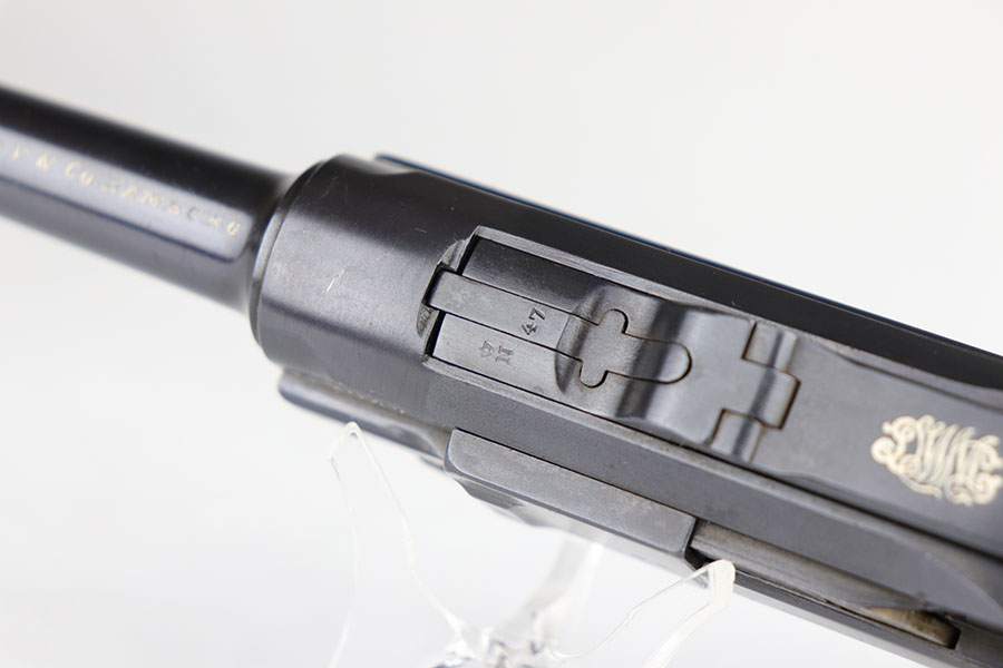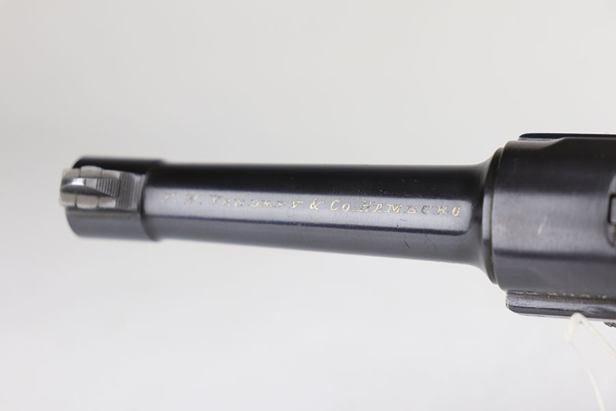 6/16/20 – Unlike most of the Lugers of this period that were produced for export, this very rare example is German retailer marked to F.W. Vandry & Co. Hamburg, so it was commercially sold in Germany which is extremely uncommon. Lugers reworked and proofed in this style are considered by some Luger experts to have been the products of Krieghoff in Suhl. The pistol is in terrific condition with 98-99% blue remaining. Tiny bits of high edge wear are present but it’s minimal. Beautifully strawed small parts. Mint bore, chambered for .30 Luger. Mint, unmarked grips. Commercial magazine with unnumbered wood bottom.