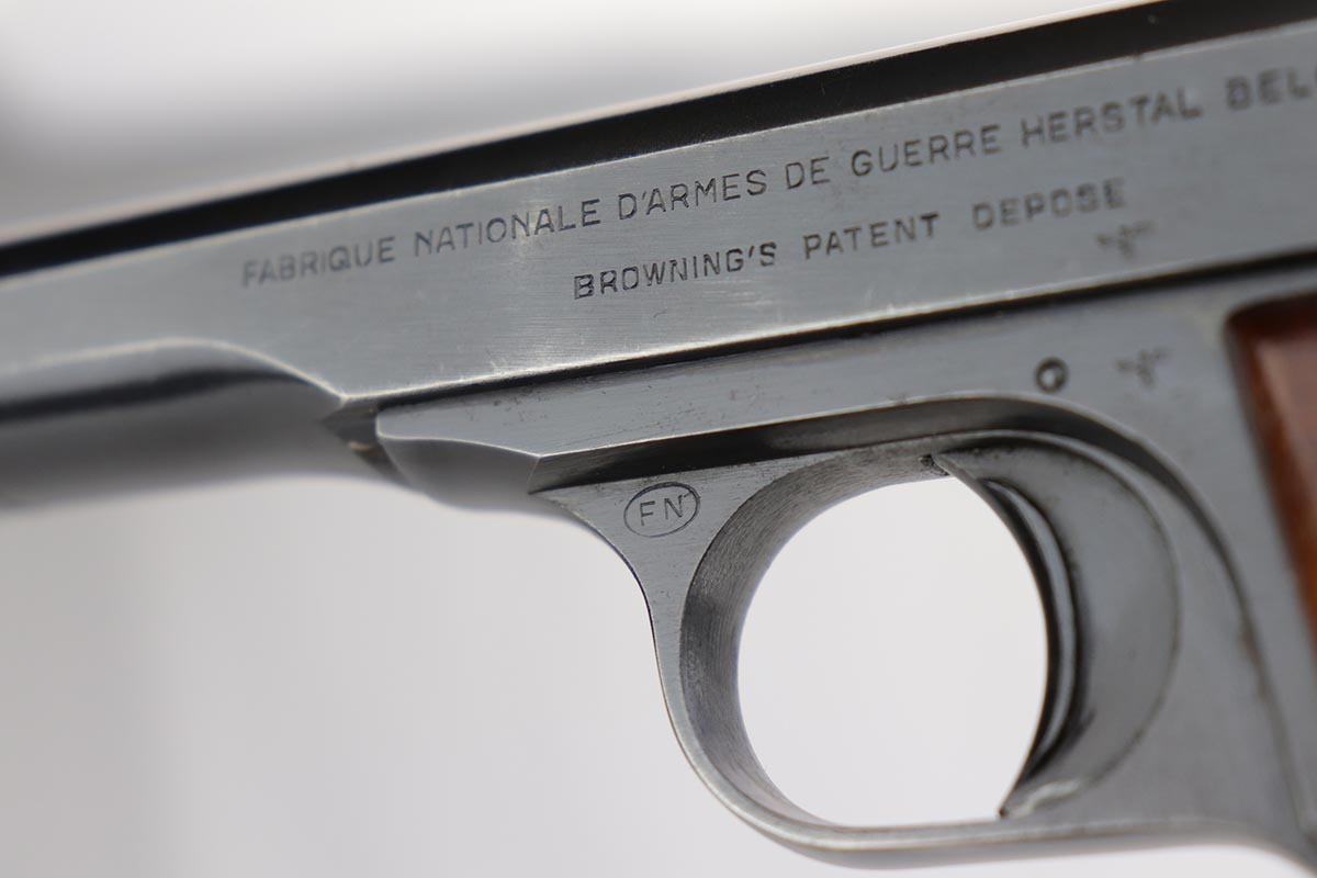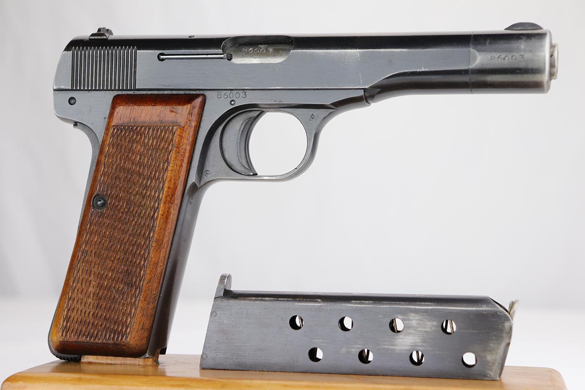 10/25/19 – This is a fairly rare Model 1922 FN pistol made during the Nazi occupation. Best estimate is 1943. It is rare as it is a commercial gun. It has several Nazi test eagles, but no waffenamts. The condition is excellent with an excellent bore. All matching serial numbers. Correct wood grips and magazine. It comes in 32 caliber or 7.65. A commercial gun during the Nazi era when no civilian could legally buy a gun (especially in Belgium) would mean this gun was most likely a special order for a Nazi official. Or private purchase by a military officer.