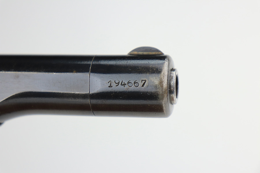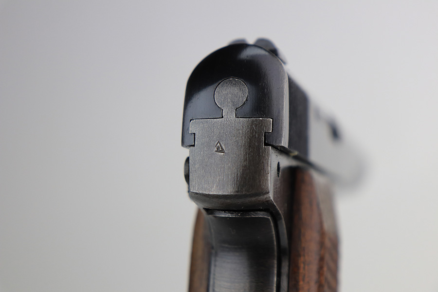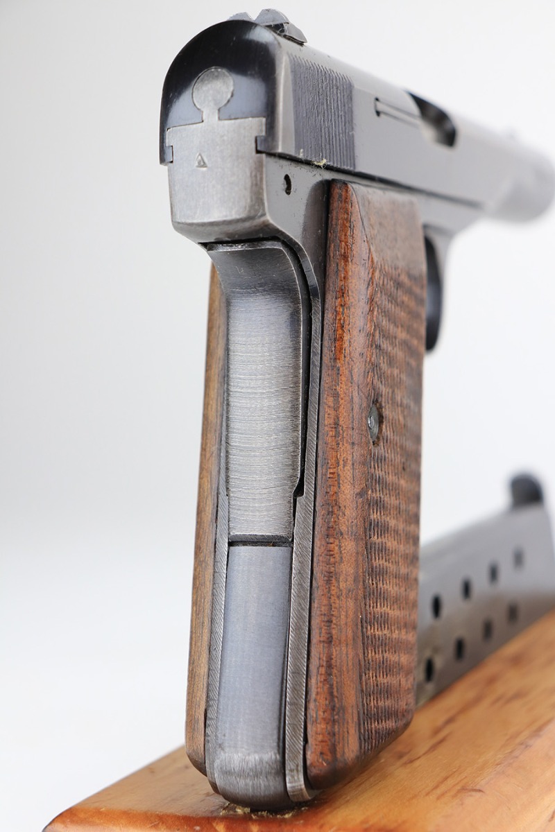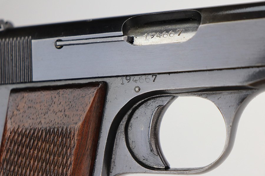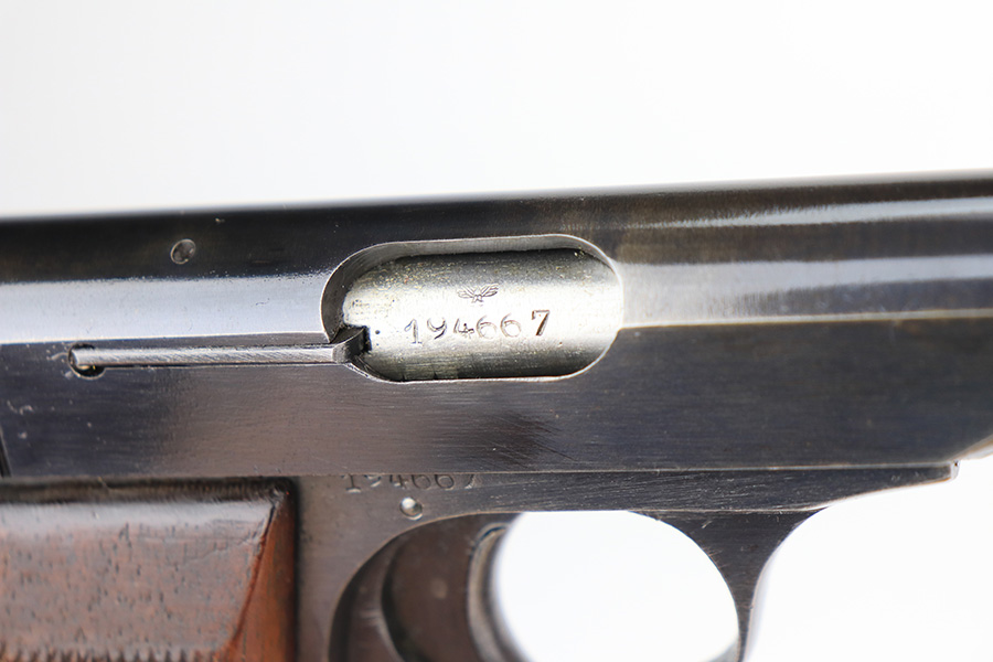 2/22/22 – This is an excellent example of a scarce FN Browning Model 1922 pistol sold in the commercial market during the Nazi occupation. It is all matching and has commercial “Crown N” proofs on the frame, slide, and in the ejection port. There is a triangle marking on the tang. It has retained about 94% of its original finish. Most of the wear is around the muzzle from the holster. There is also minor wear around the high edges of the slide and hints of thinning on the grip straps. There is some minor discoloration along the top of the slide. Comes with nice wood grips (some small bruises on the right side) and a proper commercial magazine. The bore is mint.
