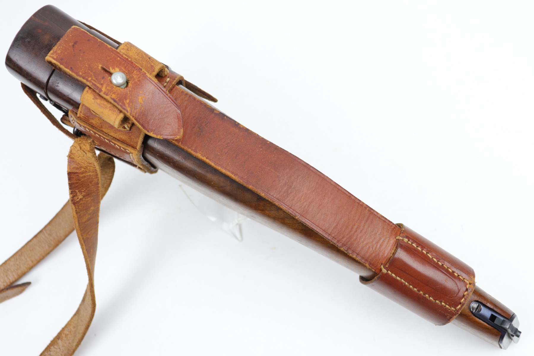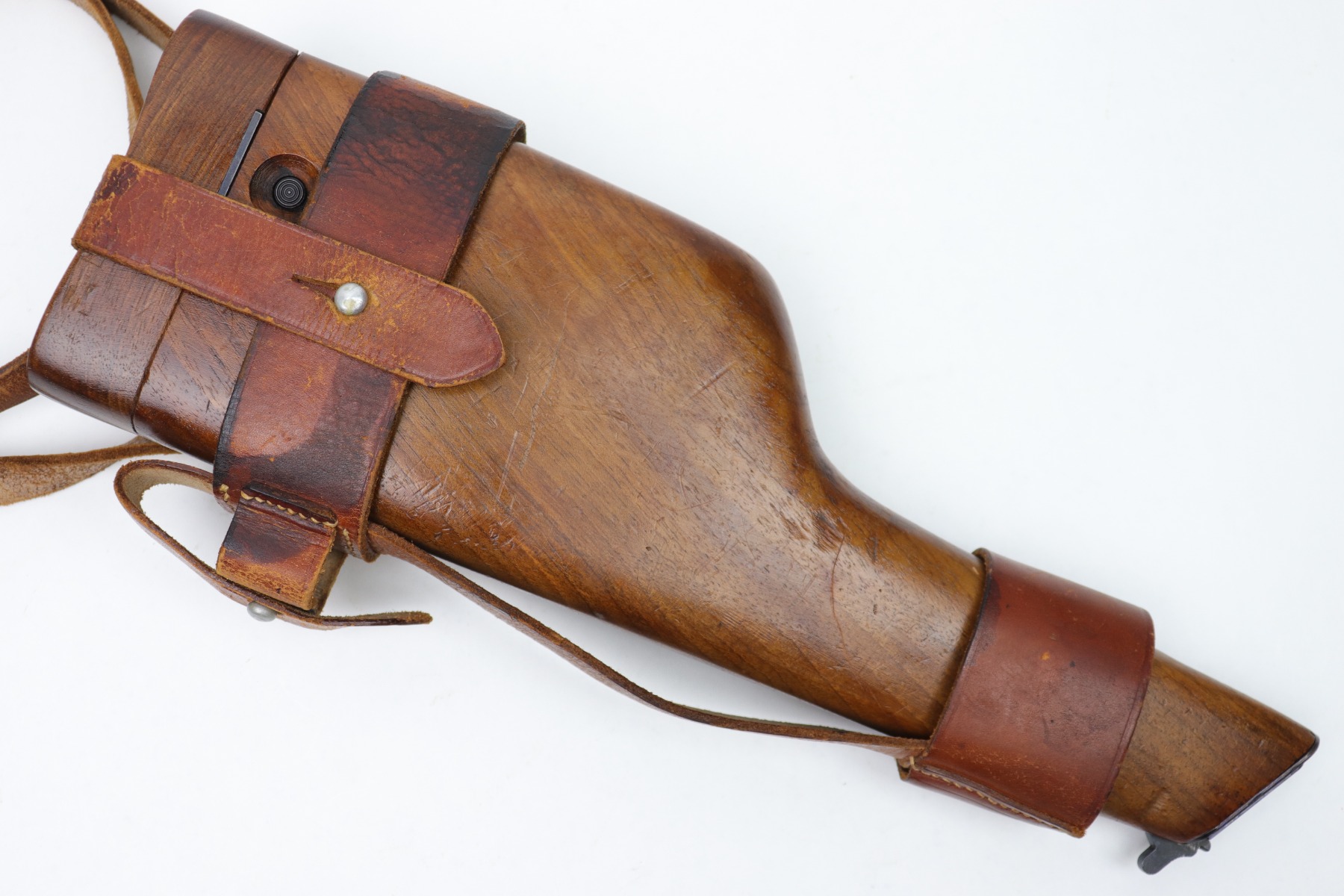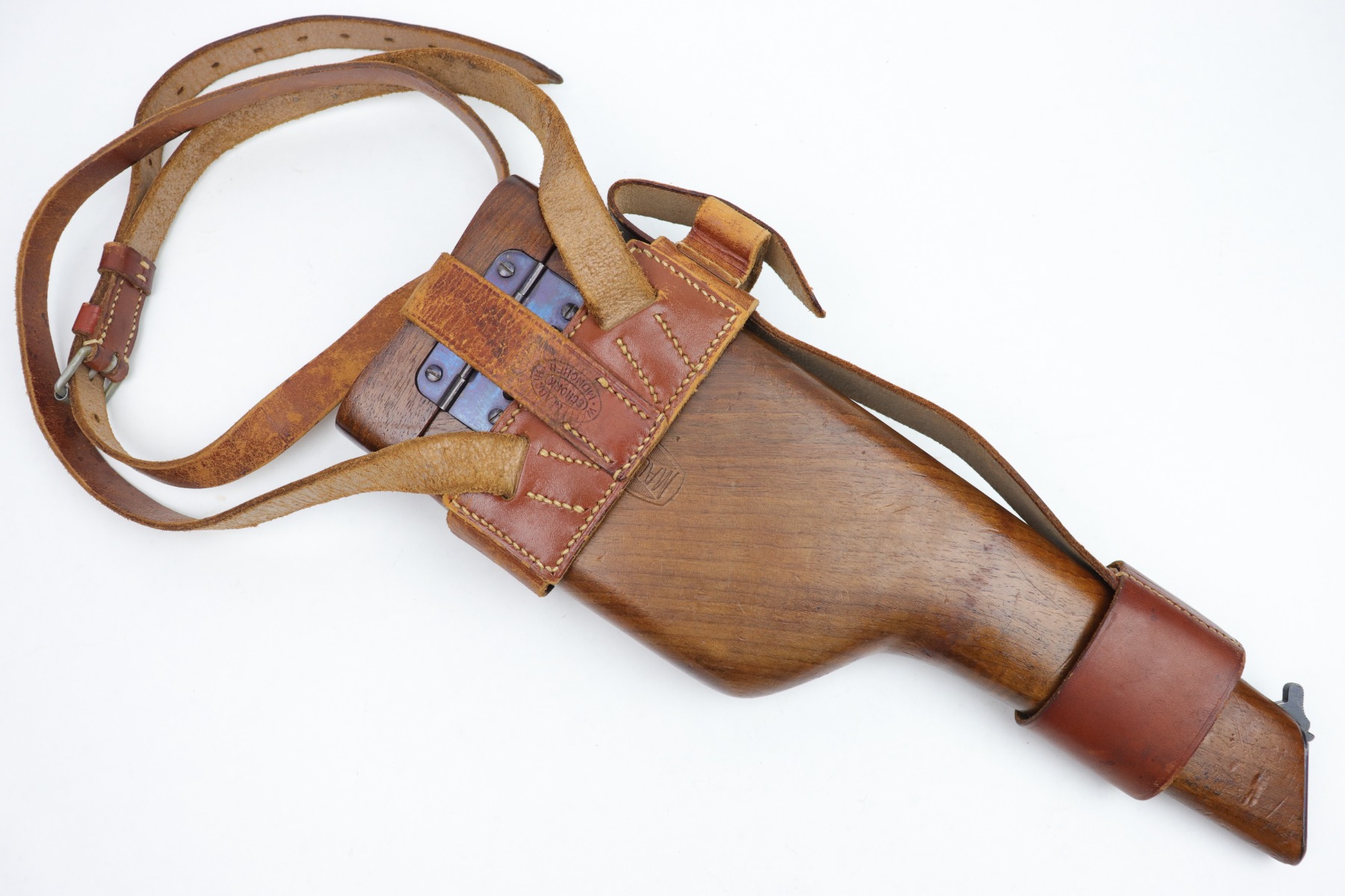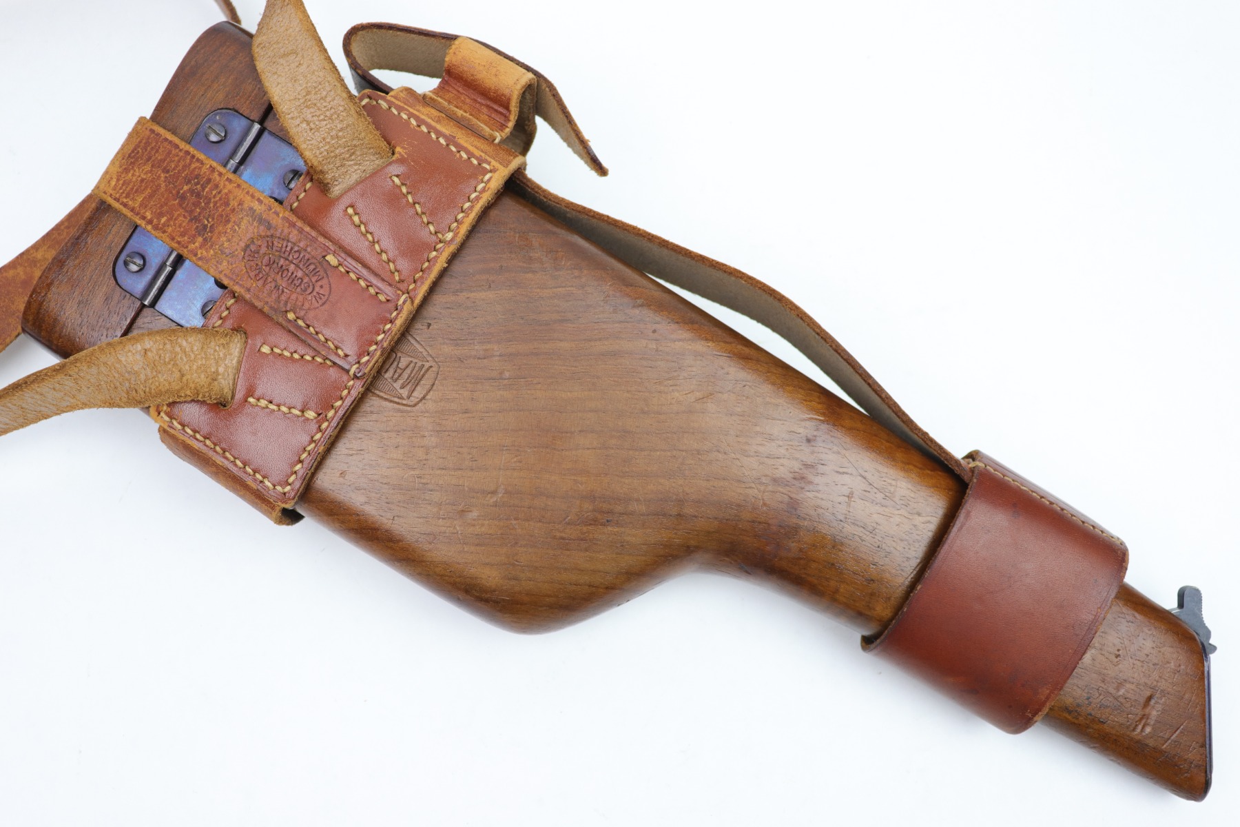 1/13/23 – This is an excellent example of a hard-to-find and original commercial Mauser C96 broomhandle stock with original holster. The stock is properly marked with the commercial Mauser banner and has no major defects. There is a very slight surface crack, about an inch long, on the side where the pistol grip would stick out but it doesn’t go through. The harness is also in good condition with minor cracking in some areas. It is marked with the retailer (WAFFENFABRIK SCHORK MUNCHEN) and is fully intact.