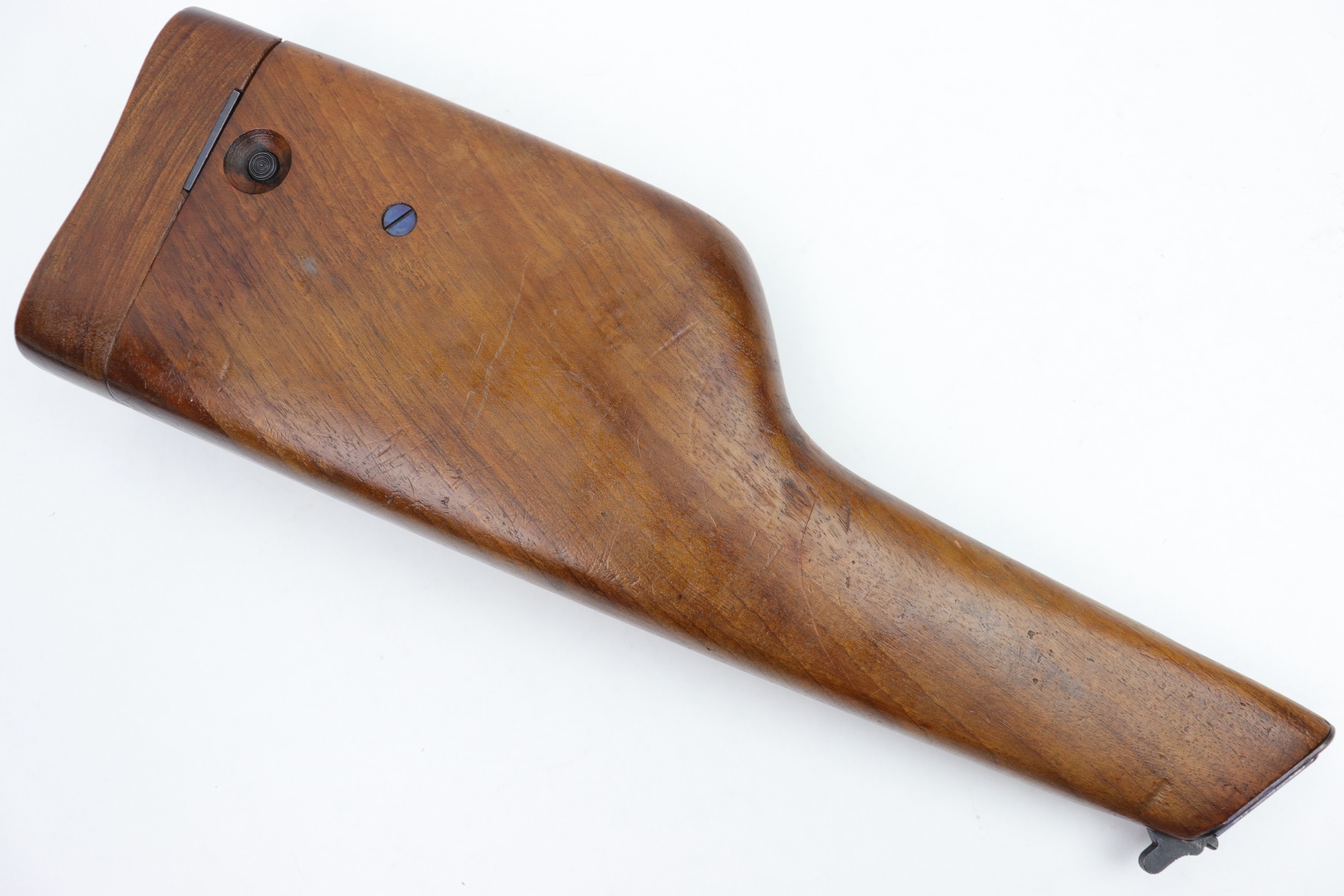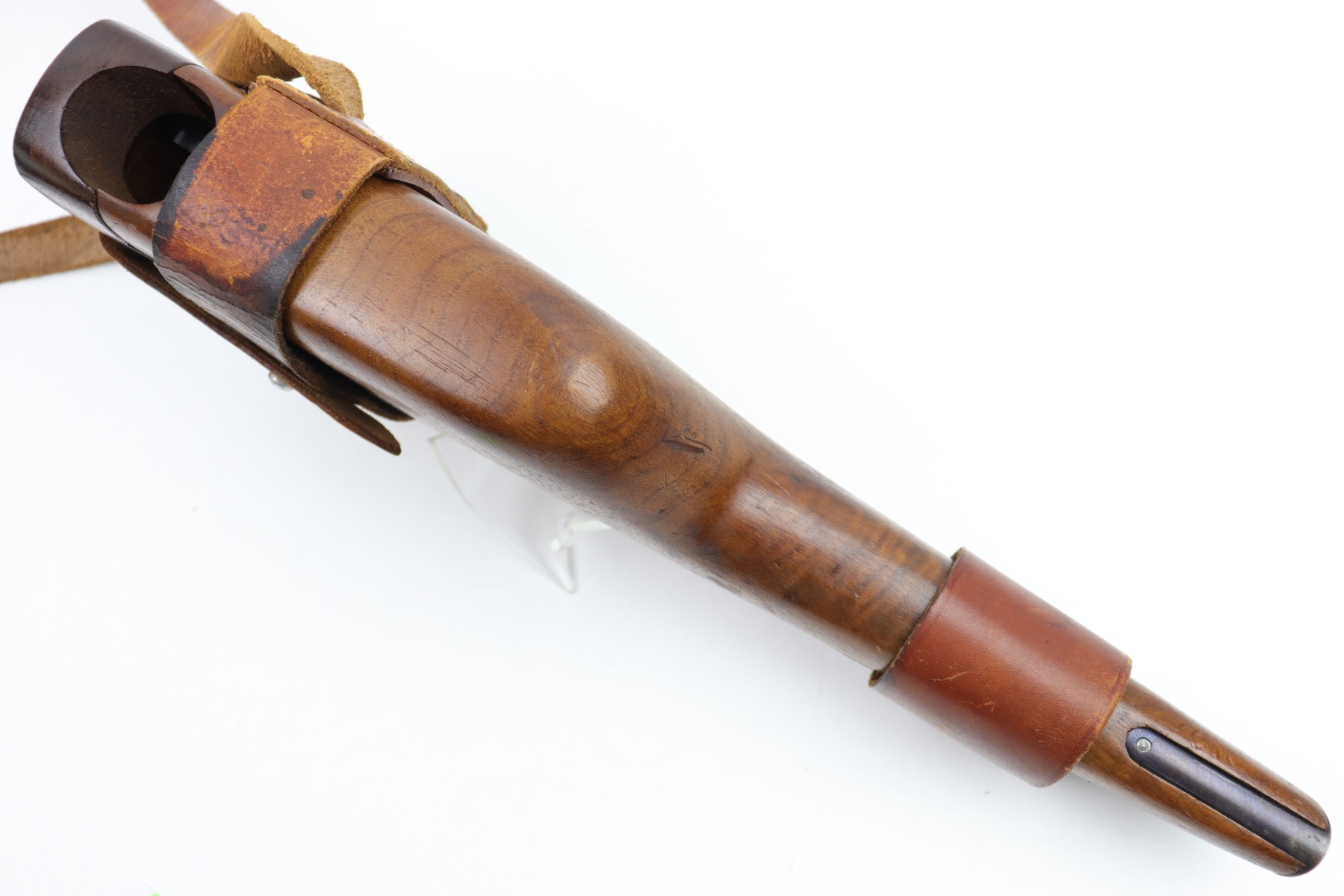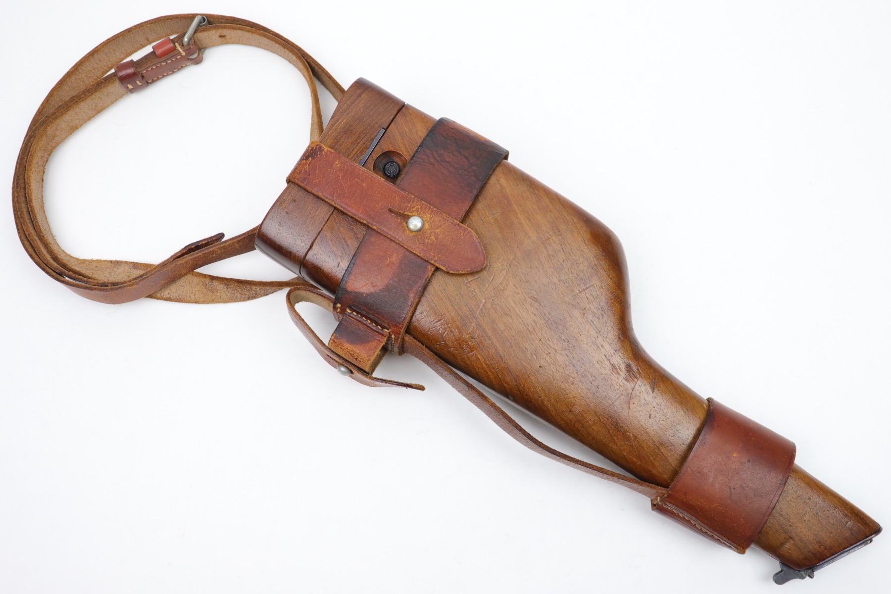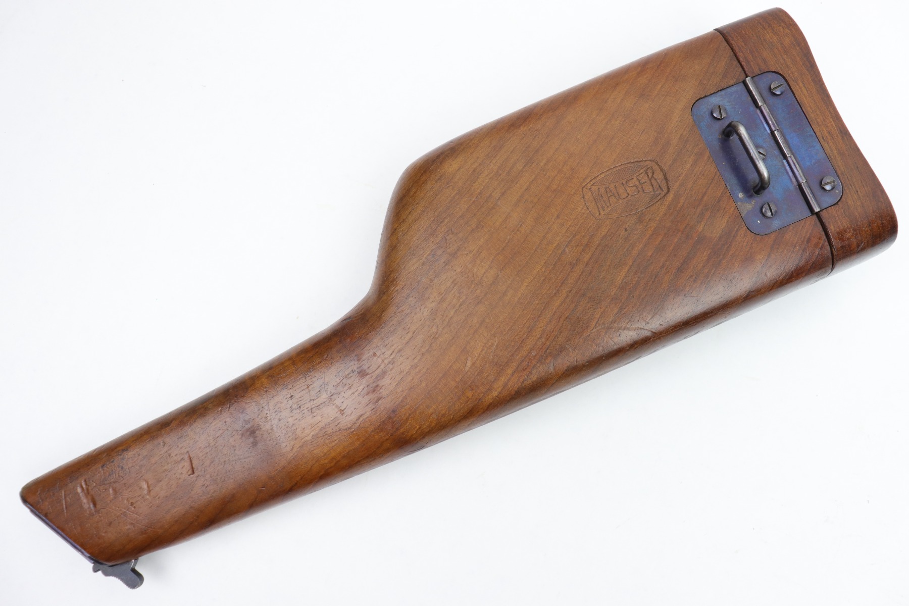 1/13/23 – This is an excellent example of a hard-to-find and original commercial Mauser C96 broomhandle stock with original holster. The stock is properly marked with the commercial Mauser banner and has no major defects. There is a very slight surface crack, about an inch long, on the side where the pistol grip would stick out but it doesn’t go through. The harness is also in good condition with minor cracking in some areas. It is marked with the retailer (WAFFENFABRIK SCHORK MUNCHEN) and is fully intact.