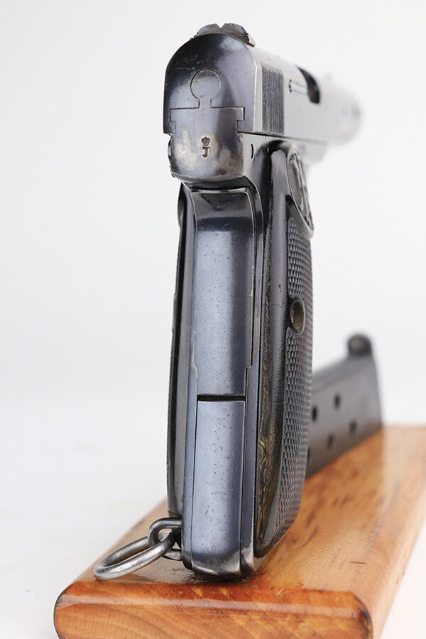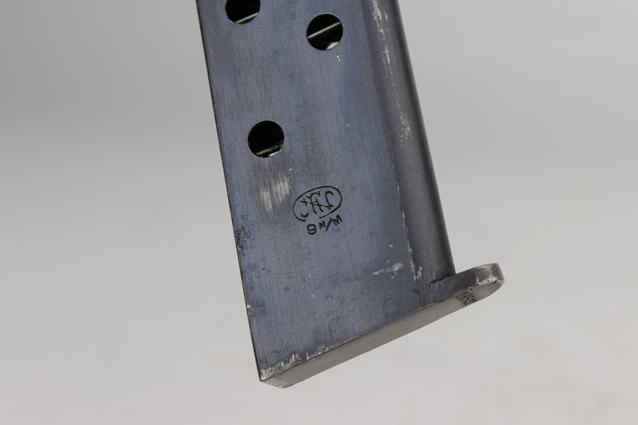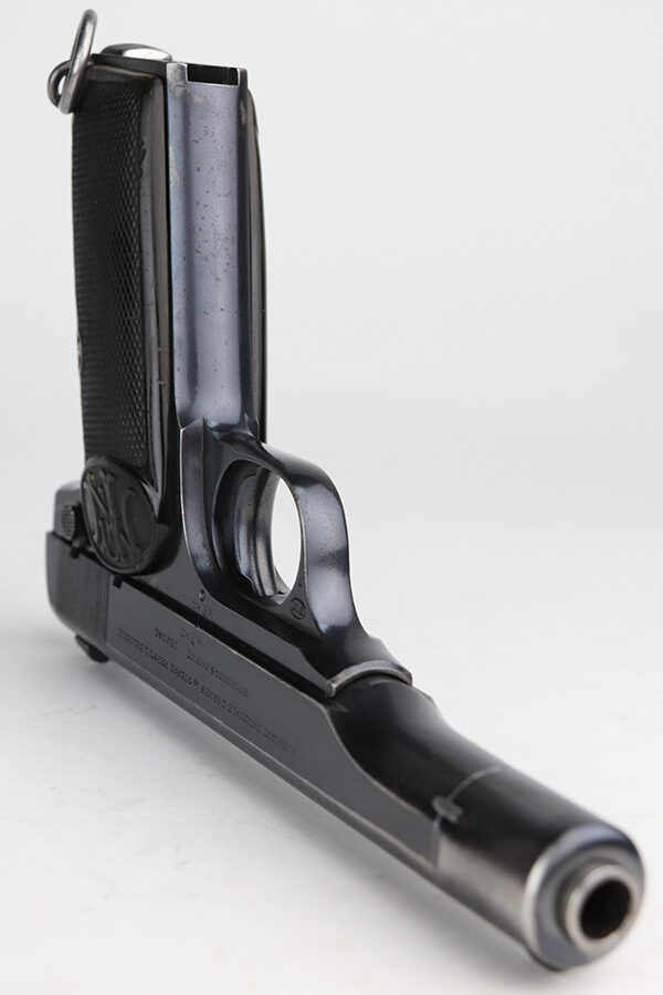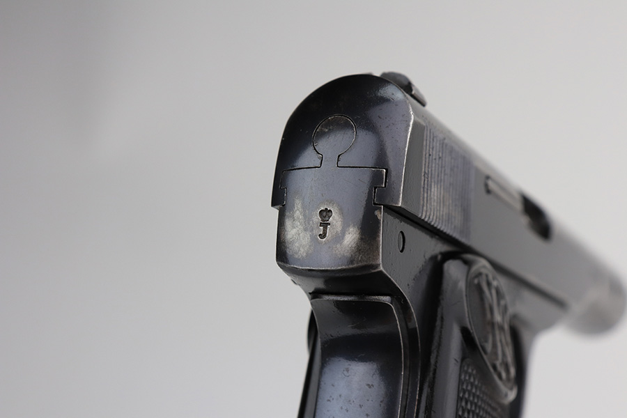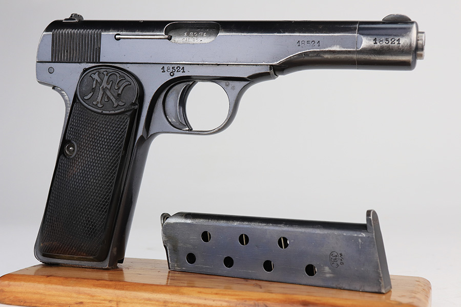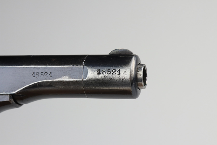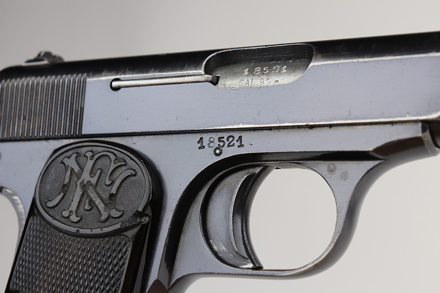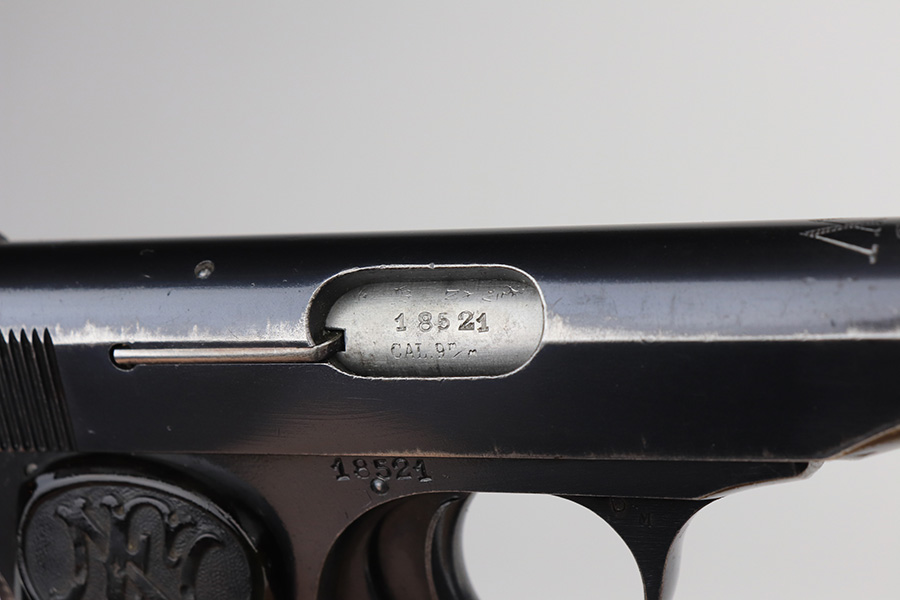 1/25/22 – This is a very nice example of a Dutch-contract FN Browning Model 1922 rig. Between 1926 and May of 1940, nearly 60,000 FN Browning M1922 pistols were shipped to the Netherlands and designated Pistool M25 No.2 by the Koninklijke Landmacht. These pistols feature a large Crown/W proof on the slide for Queen Wilhelmina. While 60,000 would suggest a somewhat common pistol, the survival rate on these is relatively low as we only receive one or two per year. This one is all matching and has the proper Belgian proofs. It comes as a rig with one original matching-numbered magazine, numbered cleaning rod (not matching), and a proper Dutch holster (not numbered). The gun also comes with a signed not from the American GI who captured the gun at the end of WW2. The gun has retained about 90% of its original finish. Most of the wear is around the muzzle, but there is also minor wear on the high edges of the slide and on the tang. Very minor freckling on both grip straps. Comes with nice period-correct grips – some tiny bore holes here and there. The bore is minty.