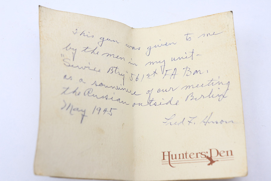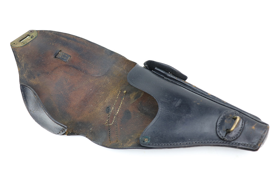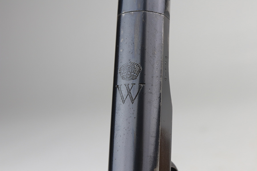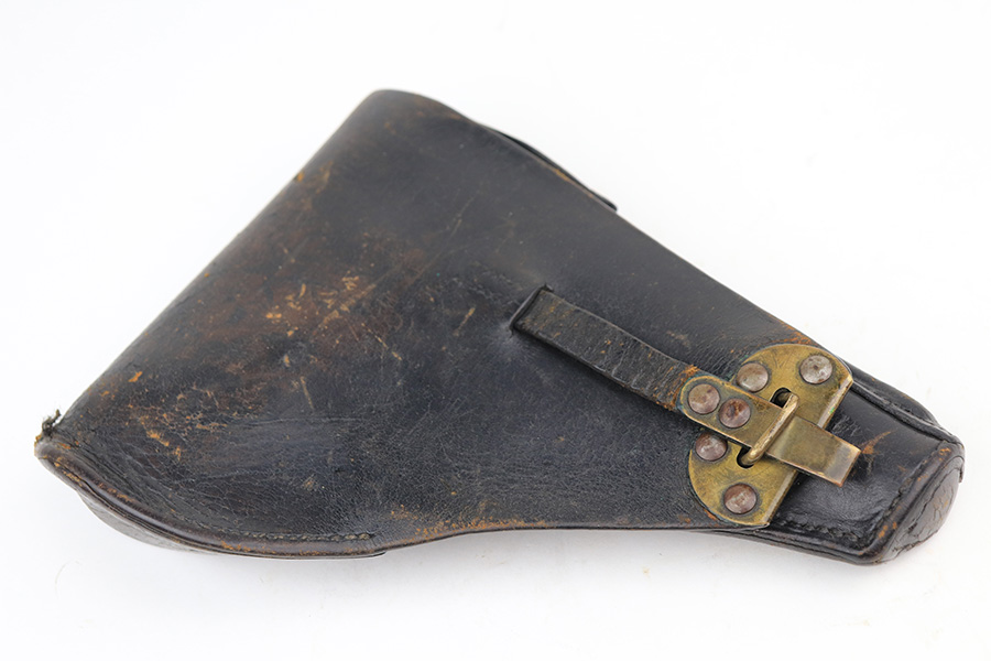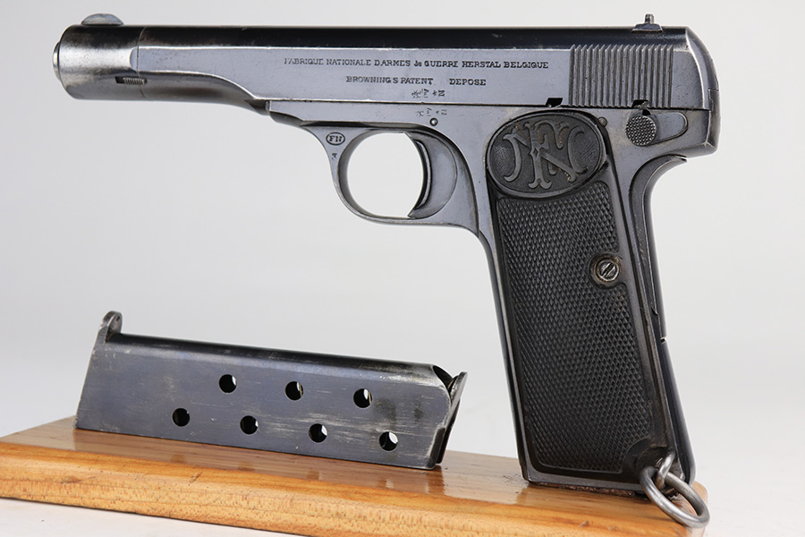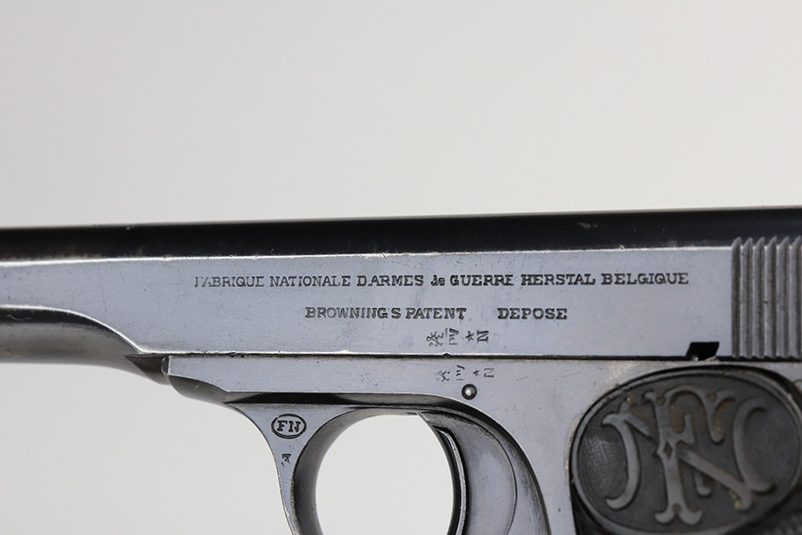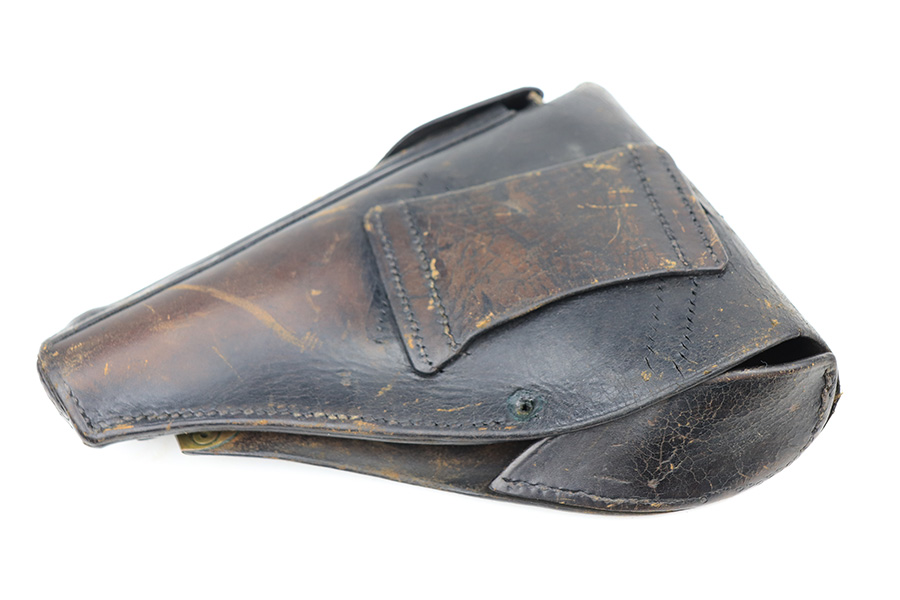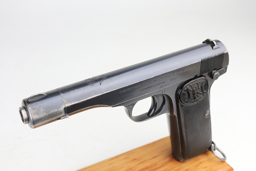 1/25/22 – This is a very nice example of a Dutch-contract FN Browning Model 1922 rig. Between 1926 and May of 1940, nearly 60,000 FN Browning M1922 pistols were shipped to the Netherlands and designated Pistool M25 No.2 by the Koninklijke Landmacht. These pistols feature a large Crown/W proof on the slide for Queen Wilhelmina. While 60,000 would suggest a somewhat common pistol, the survival rate on these is relatively low as we only receive one or two per year. This one is all matching and has the proper Belgian proofs. It comes as a rig with one original matching-numbered magazine, numbered cleaning rod (not matching), and a proper Dutch holster (not numbered). The gun also comes with a signed not from the American GI who captured the gun at the end of WW2. The gun has retained about 90% of its original finish. Most of the wear is around the muzzle, but there is also minor wear on the high edges of the slide and on the tang. Very minor freckling on both grip straps. Comes with nice period-correct grips – some tiny bore holes here and there. The bore is minty.