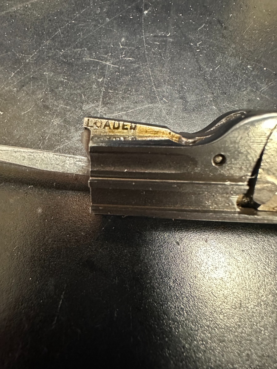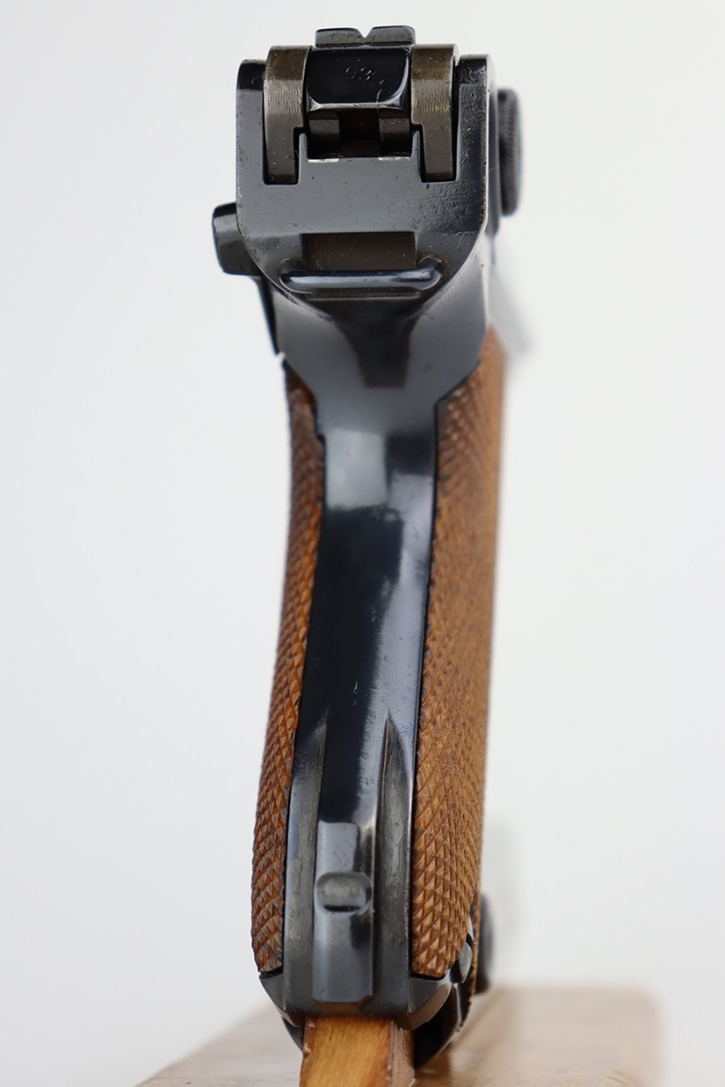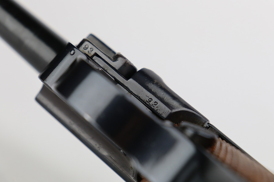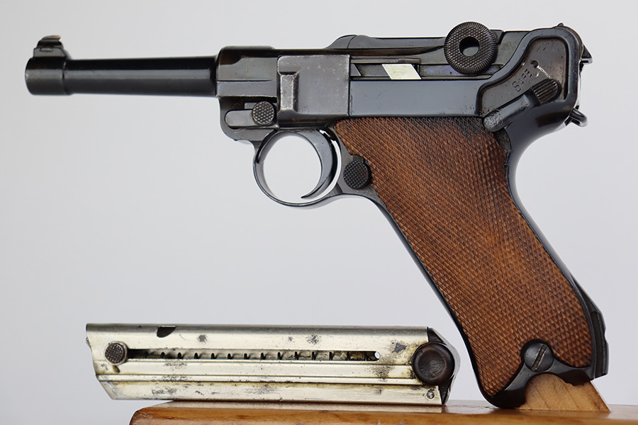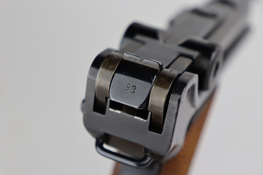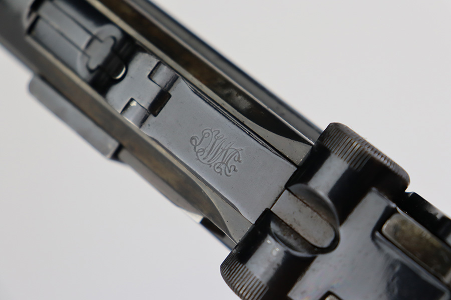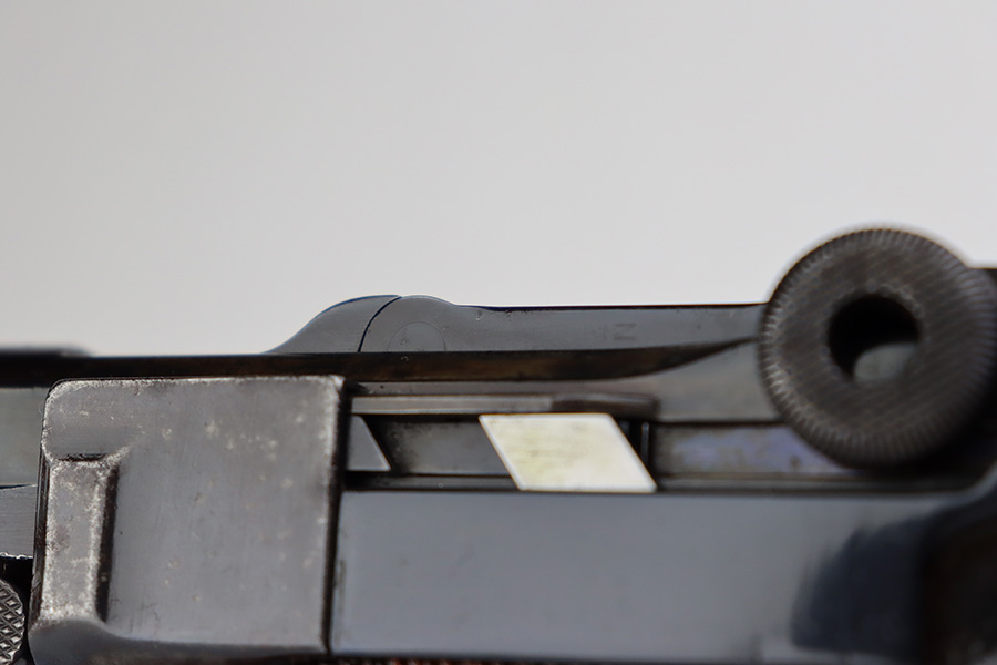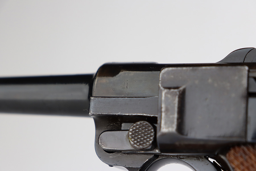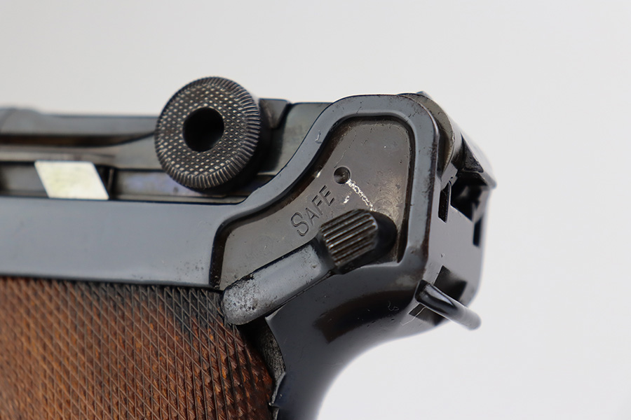 6/22/23 – This is a rare and unique DWM Commercial Luger with “safe” and “loaded” marked frame, indicating it was made specifically for the American commercial market. Chambered in .30 Luger and has the proper commercial “Crown N” proofs. It is all matching and has been completely re-blued. There is splotchy discoloration on both sides of the slide, some pin-pricking on the side plate, and some minor pitting around the safety lever. Modified front sight. Fitted with replacement wood grips – small chip in the upper corner of the left panel. Comes with a mismatched wood-bottom magazine. The bore has pretty good rifling, but there is pin-pricking throughout.