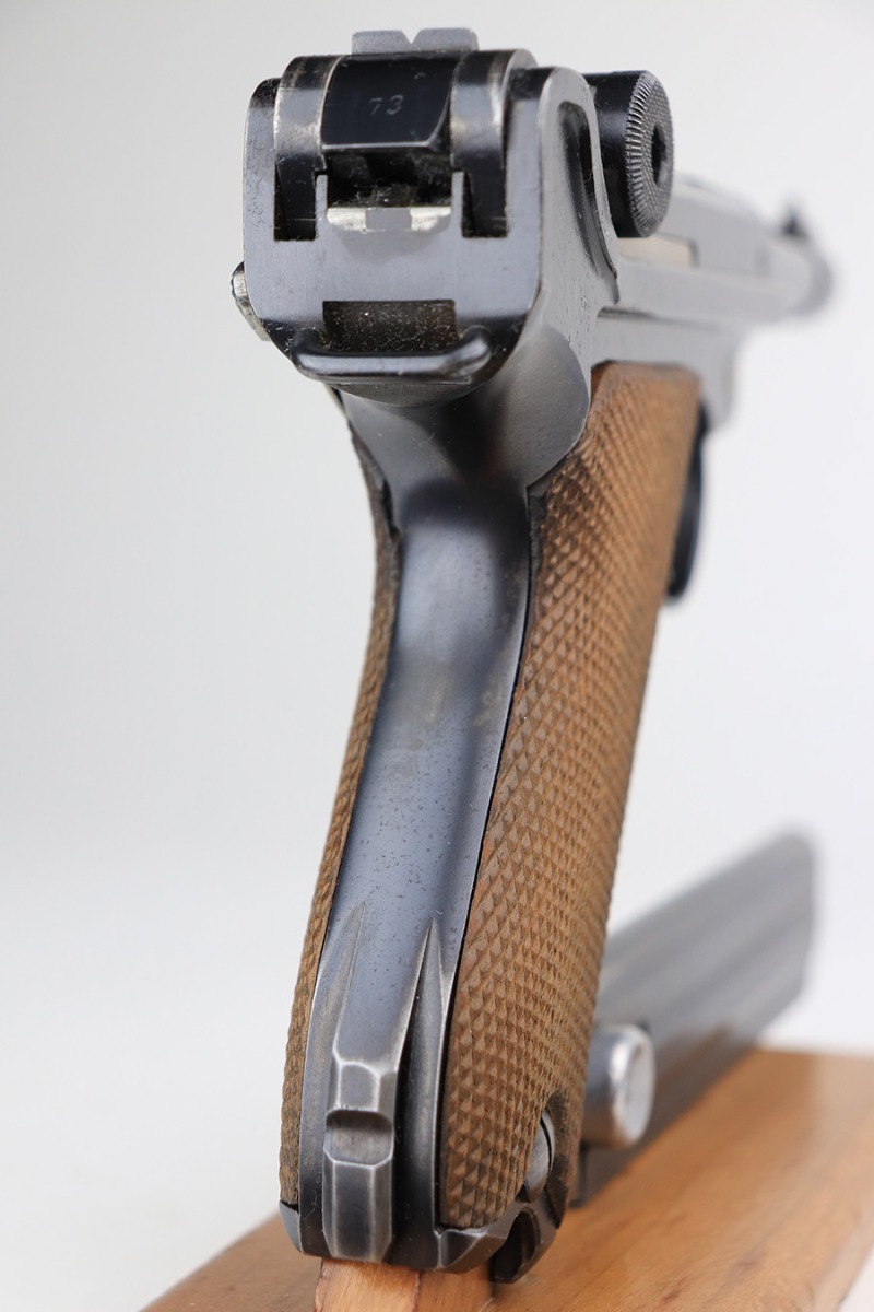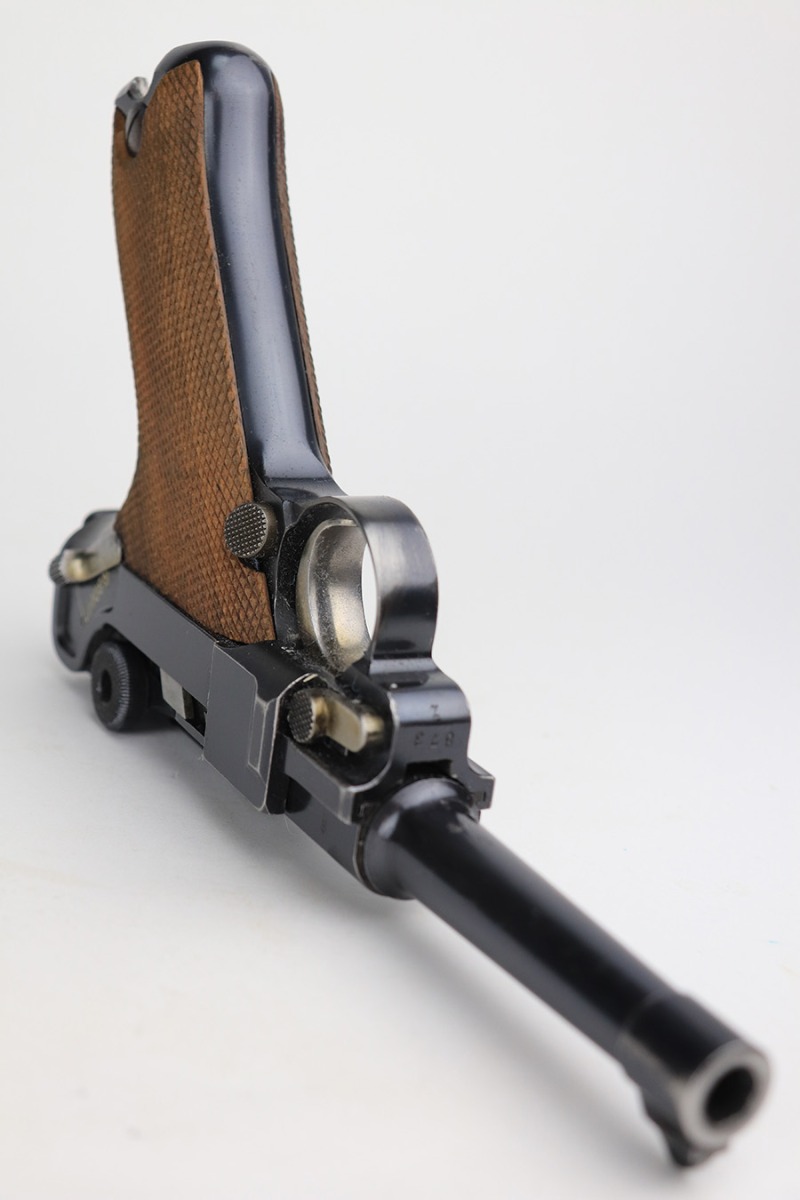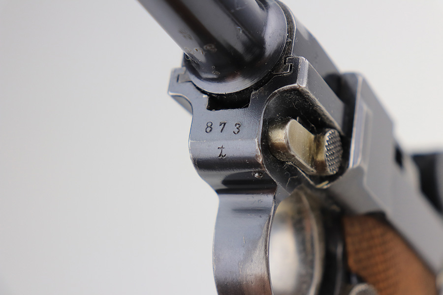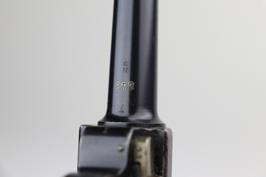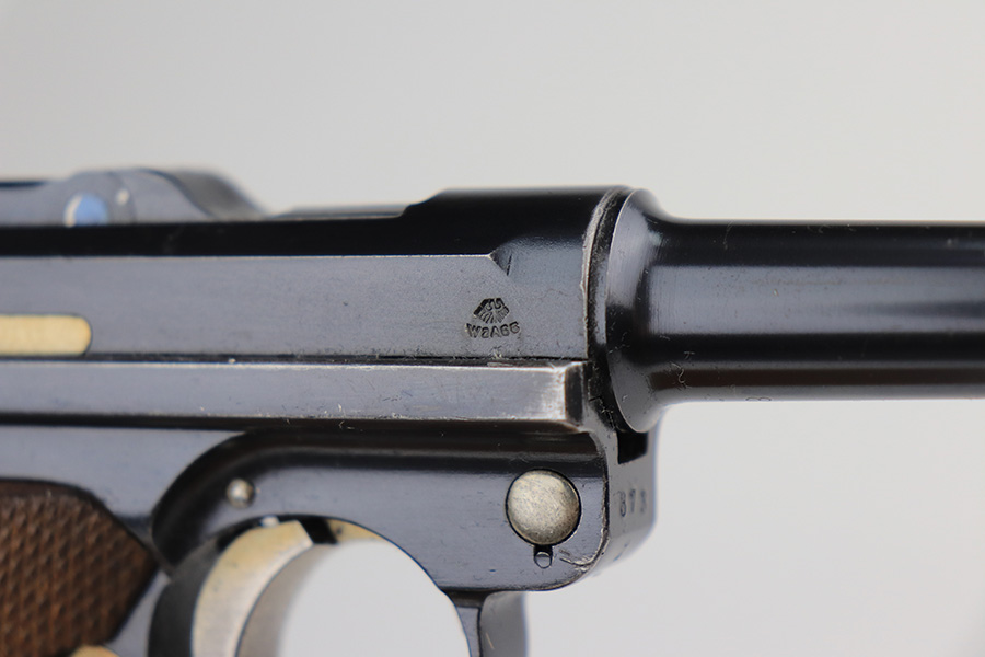 2/14/22 – This is a scarce DWM military “sneak” Luger from the Weimar period in excellent condition. These are typically termed Sneak Lugers based on the lack of any identifying manufactures markings and proof marks, which the Nazis did to disguise their early rearmament efforts. This example has the correct blank chamber, but still retains the DWM marked front toggle assembly. The right side of the barrel extension has the early single “WaA66” Waffenamt proof indicating rework at the Mauser factory in 1929/30 along with the single “Crown/N” commercial proof on the left side, which is also duplicated on the breechblock and underside of the barrel. Every other example we have encountered has had police attributes but this one does not. No unit marking ever applied to the grip frame, no port for a sear safety, etc. The pistol is correctly in the ‘t’ serial block and based on the lack of police indicators, this one was like intended for the military. This one is in great condition with 95-96% of the blue remaining. Minor finish loss on the trigger guard, sideplate, around the muzzle and a little on the straps. Excellent, sharply checkered grips. Unmarked Haenel magazine.