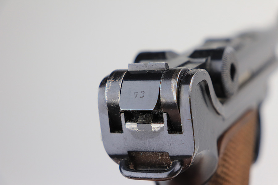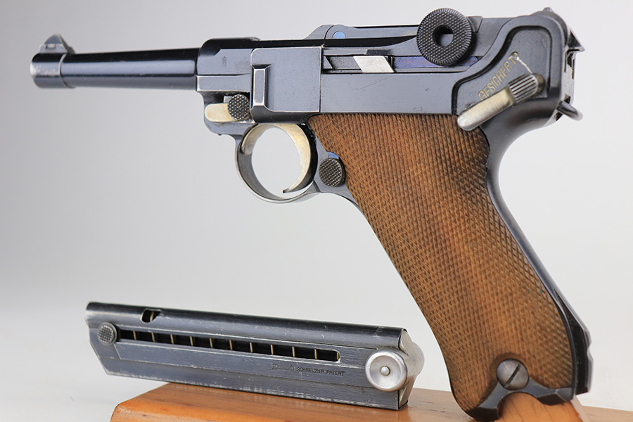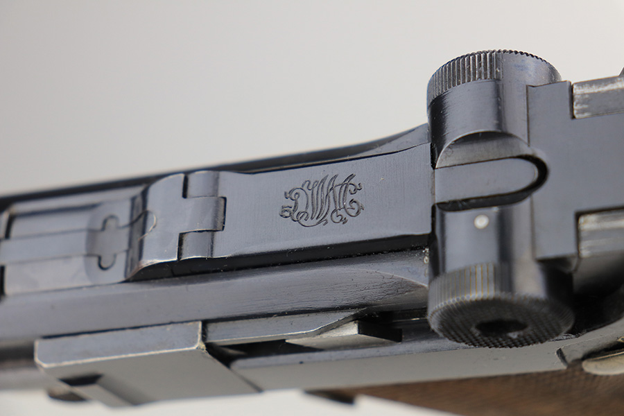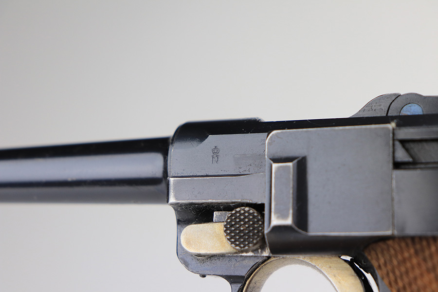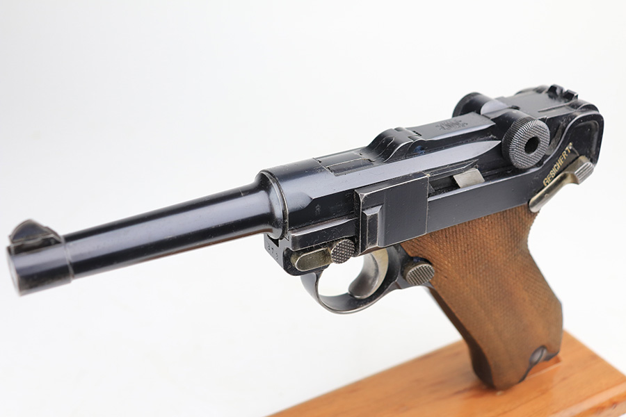 2/14/22 – This is a scarce DWM military “sneak” Luger from the Weimar period in excellent condition. These are typically termed Sneak Lugers based on the lack of any identifying manufactures markings and proof marks, which the Nazis did to disguise their early rearmament efforts. This example has the correct blank chamber, but still retains the DWM marked front toggle assembly. The right side of the barrel extension has the early single “WaA66” Waffenamt proof indicating rework at the Mauser factory in 1929/30 along with the single “Crown/N” commercial proof on the left side, which is also duplicated on the breechblock and underside of the barrel. Every other example we have encountered has had police attributes but this one does not. No unit marking ever applied to the grip frame, no port for a sear safety, etc. The pistol is correctly in the ‘t’ serial block and based on the lack of police indicators, this one was like intended for the military. This one is in great condition with 95-96% of the blue remaining. Minor finish loss on the trigger guard, sideplate, around the muzzle and a little on the straps. Excellent, sharply checkered grips. Unmarked Haenel magazine.