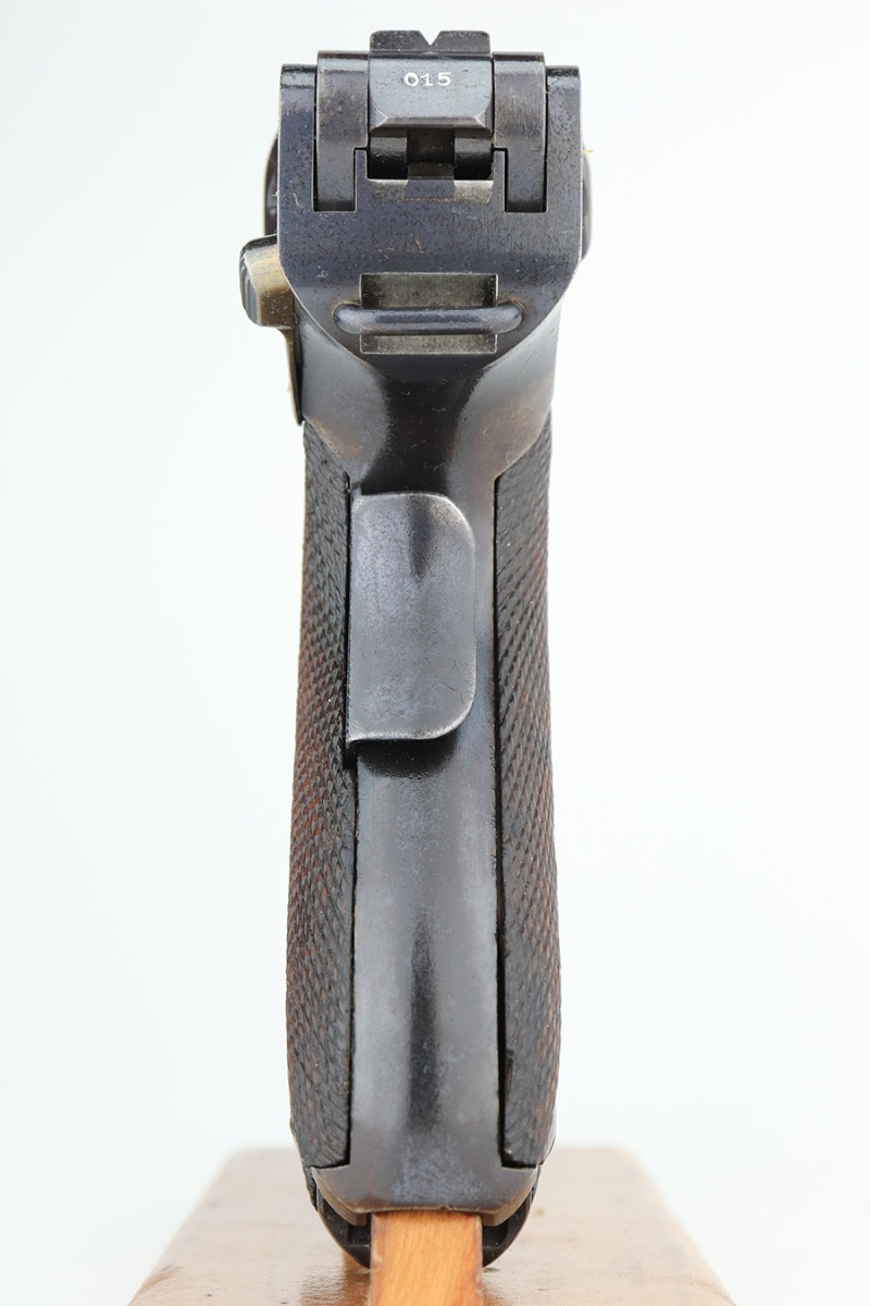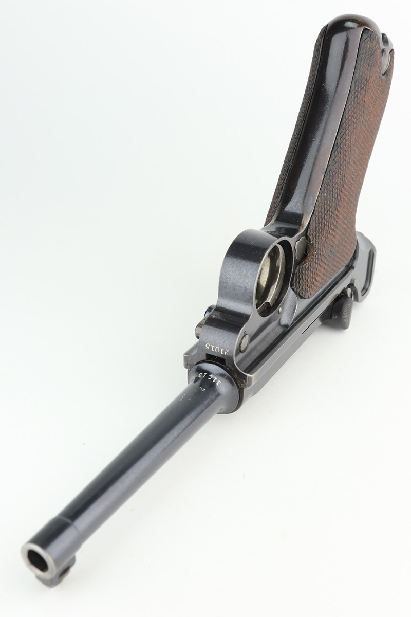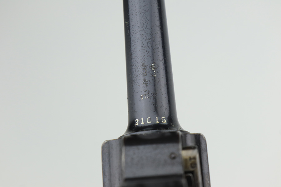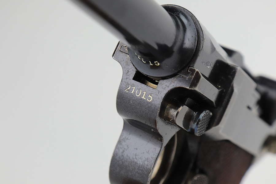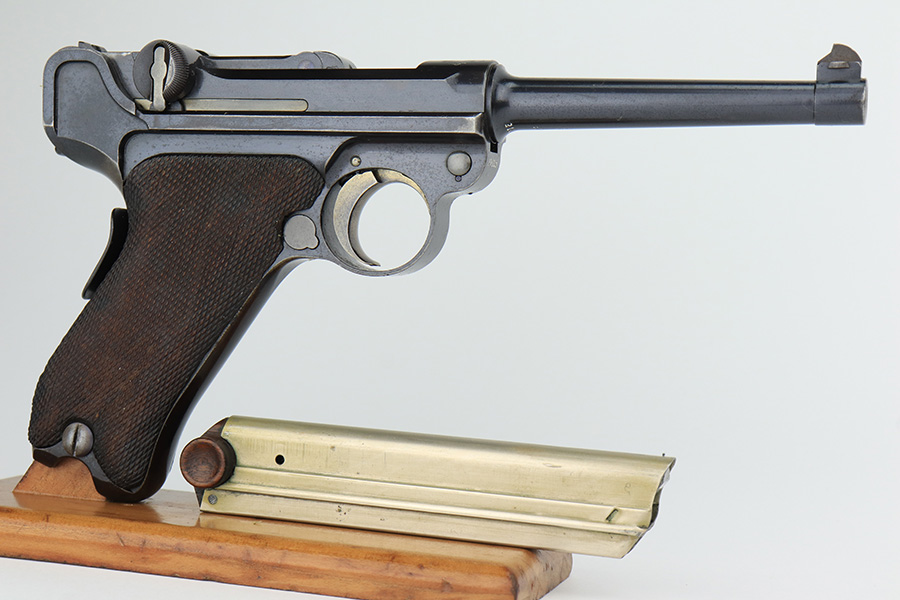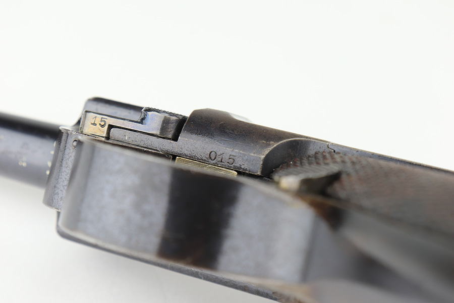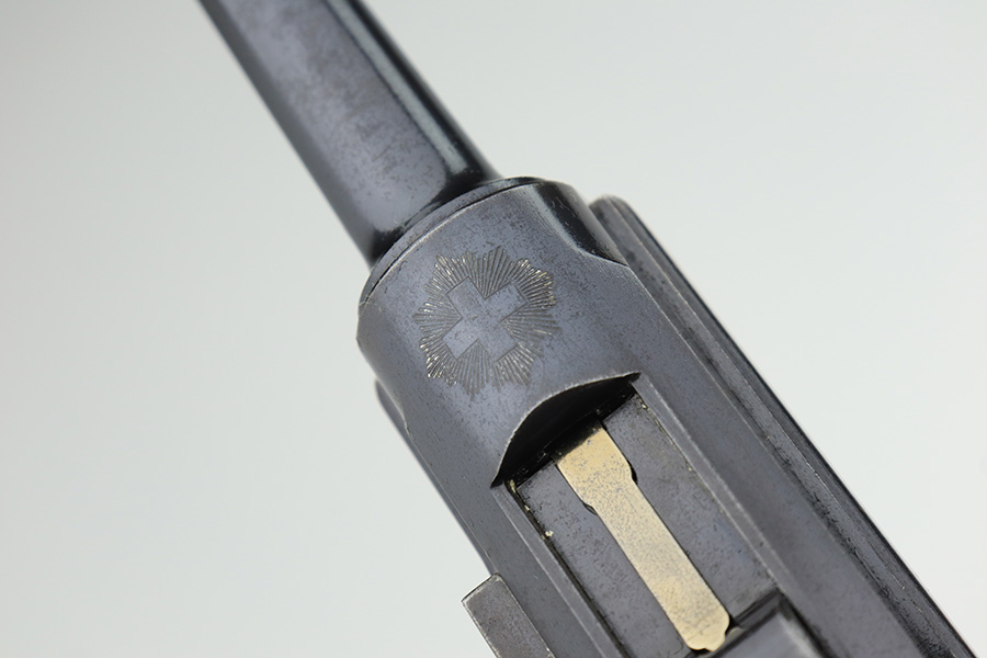 3/2/23 – This is a very nice example of an early production 1900 Swiss Contract Luger of which an estimated 2,000 commercial and 3,000 military pistols were produced. These pistols were the real first contract by the Swiss government for the Luger pistol produced in a specific serial number range with both the military and commercial sales being in this range. These pistols have the early features such as the dished toggles with toggle lock, the flat/recessed breech bolt, no stock lug, grip safety, flat main springs, and fast taper barrel that is 4 3/4″ long. This pistol also has fixed blade and “V” notch sights, standard Swiss cross in sunburst on the chamber, and “DWM” scroll toggle marking. It is all matching and has the proper “Crown BUG” proofs. It has retained about 97% of its finish with just minor wear on the high edges. While there isn’t much actual finish loss, there is noticeable brown patina on the straps and some noticeable freckling on the left side of the frame. Fitted with nice un-numbered wood grips – there is a hairline crack on the right side (really only visible from the inside). Comes with a mismatched military magazine. The bore has good rifling with minor pin-pricking throughout.
