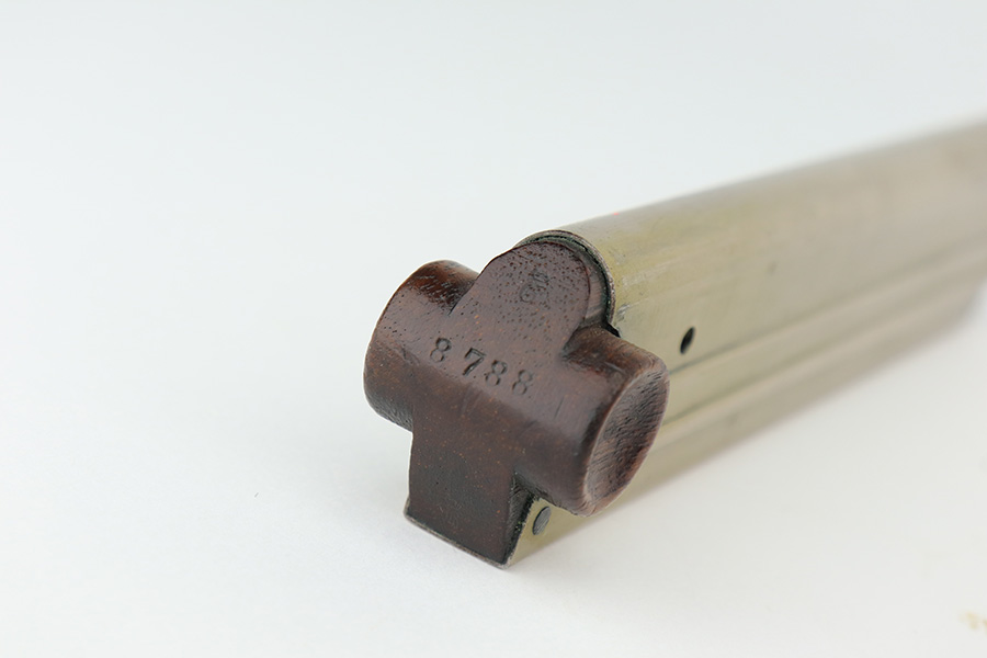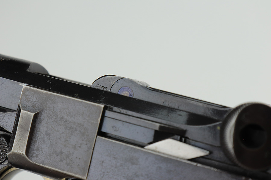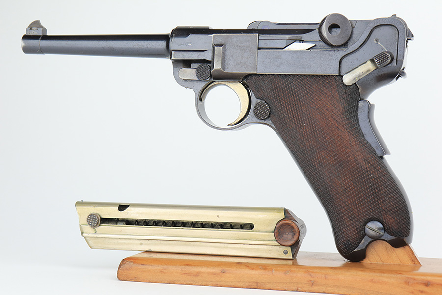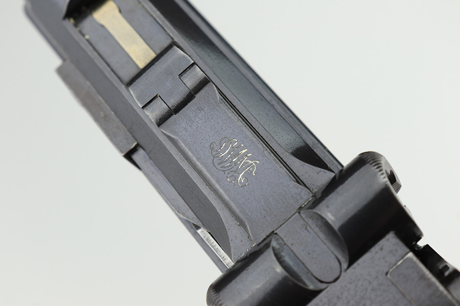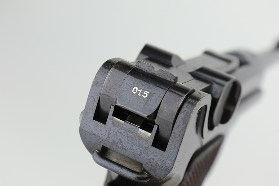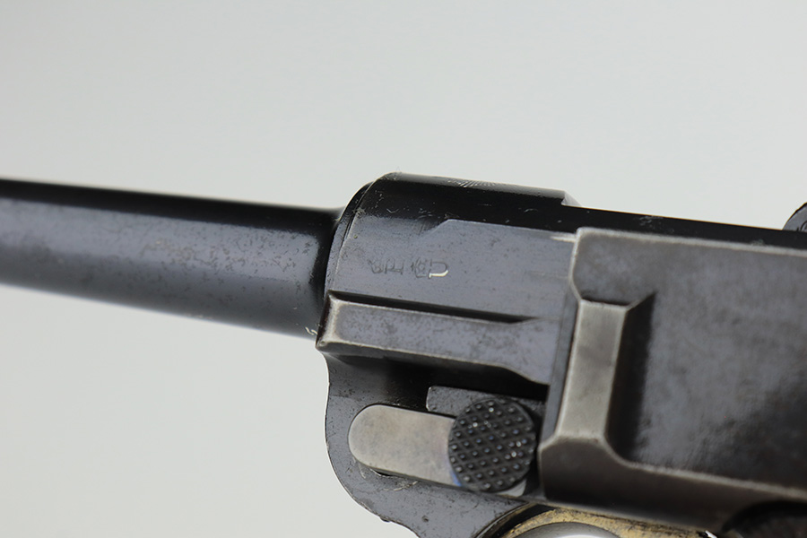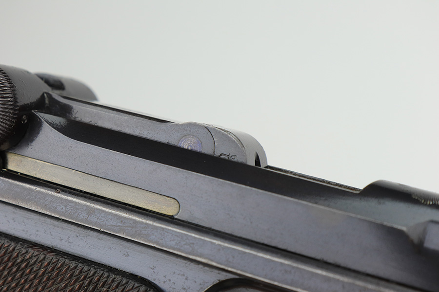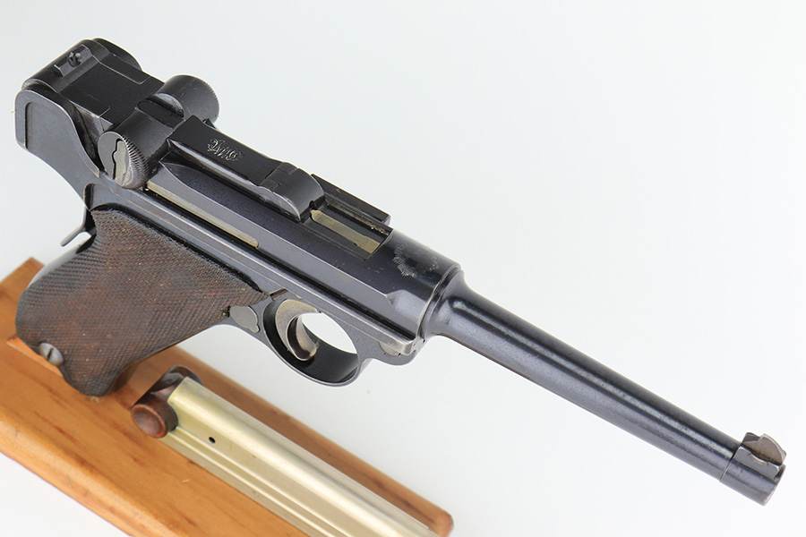 3/2/23 – This is a very nice example of an early production 1900 Swiss Contract Luger of which an estimated 2,000 commercial and 3,000 military pistols were produced. These pistols were the real first contract by the Swiss government for the Luger pistol produced in a specific serial number range with both the military and commercial sales being in this range. These pistols have the early features such as the dished toggles with toggle lock, the flat/recessed breech bolt, no stock lug, grip safety, flat main springs, and fast taper barrel that is 4 3/4″ long. This pistol also has fixed blade and “V” notch sights, standard Swiss cross in sunburst on the chamber, and “DWM” scroll toggle marking. It is all matching and has the proper “Crown BUG” proofs. It has retained about 97% of its finish with just minor wear on the high edges. While there isn’t much actual finish loss, there is noticeable brown patina on the straps and some noticeable freckling on the left side of the frame. Fitted with nice un-numbered wood grips – there is a hairline crack on the right side (really only visible from the inside). Comes with a mismatched military magazine. The bore has good rifling with minor pin-pricking throughout.
