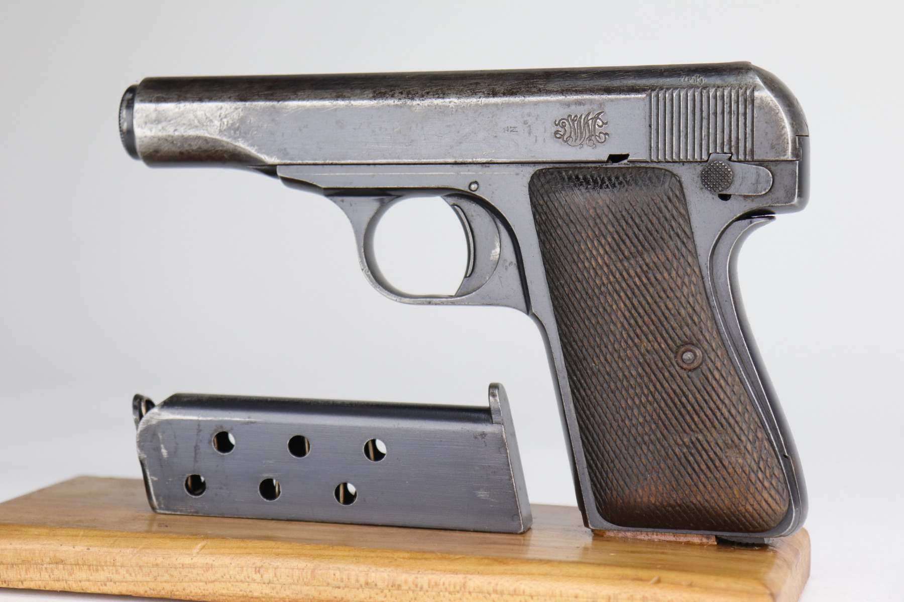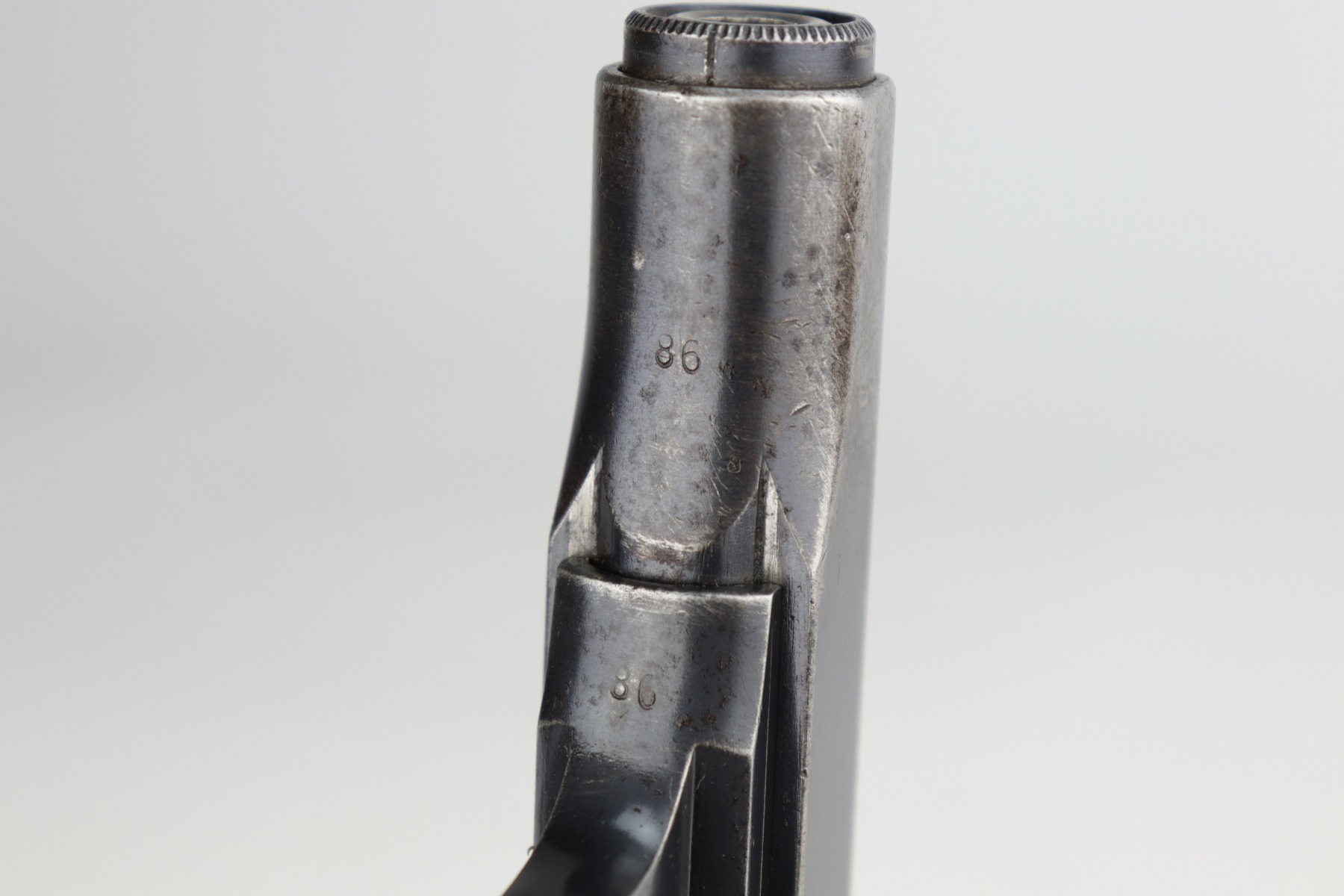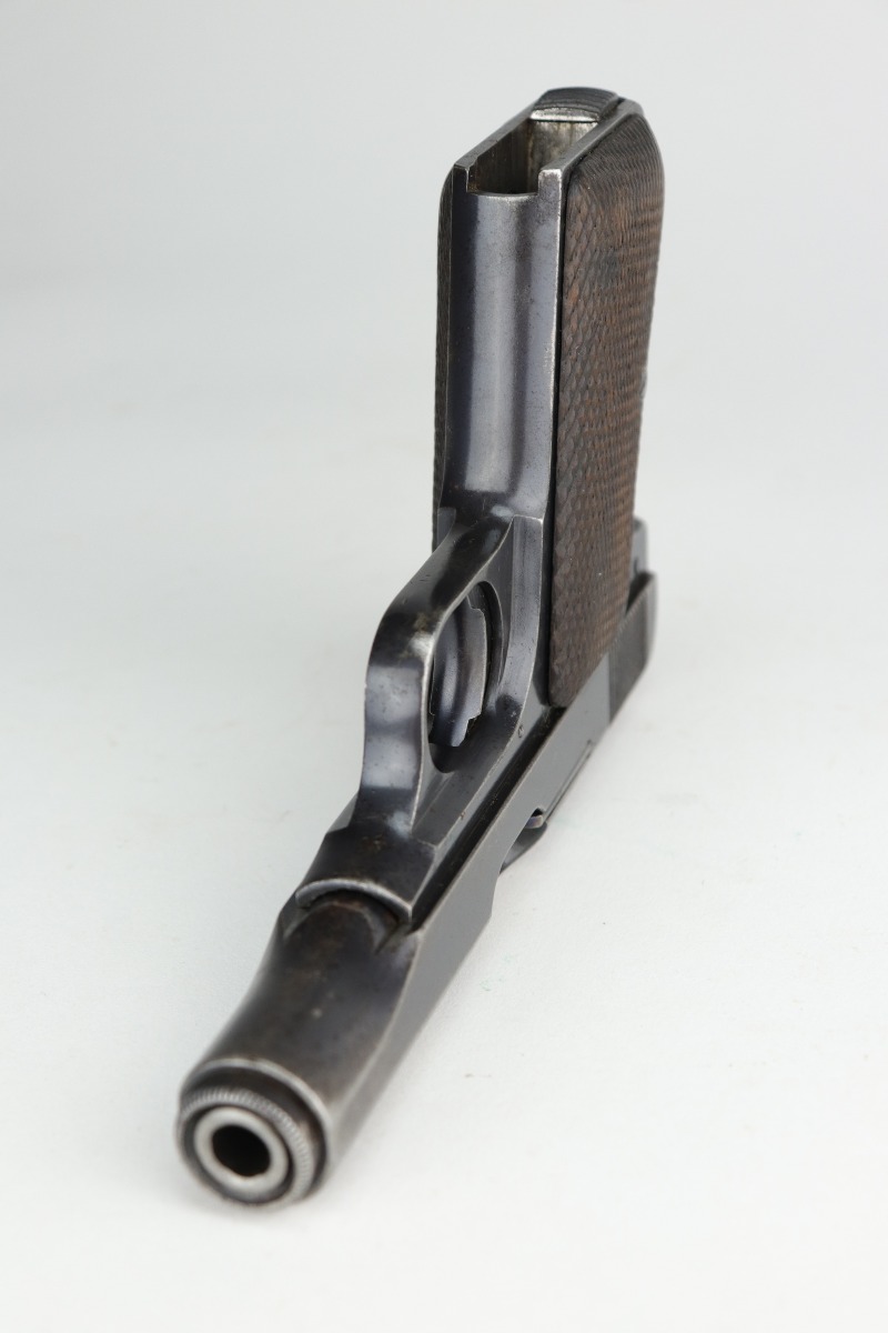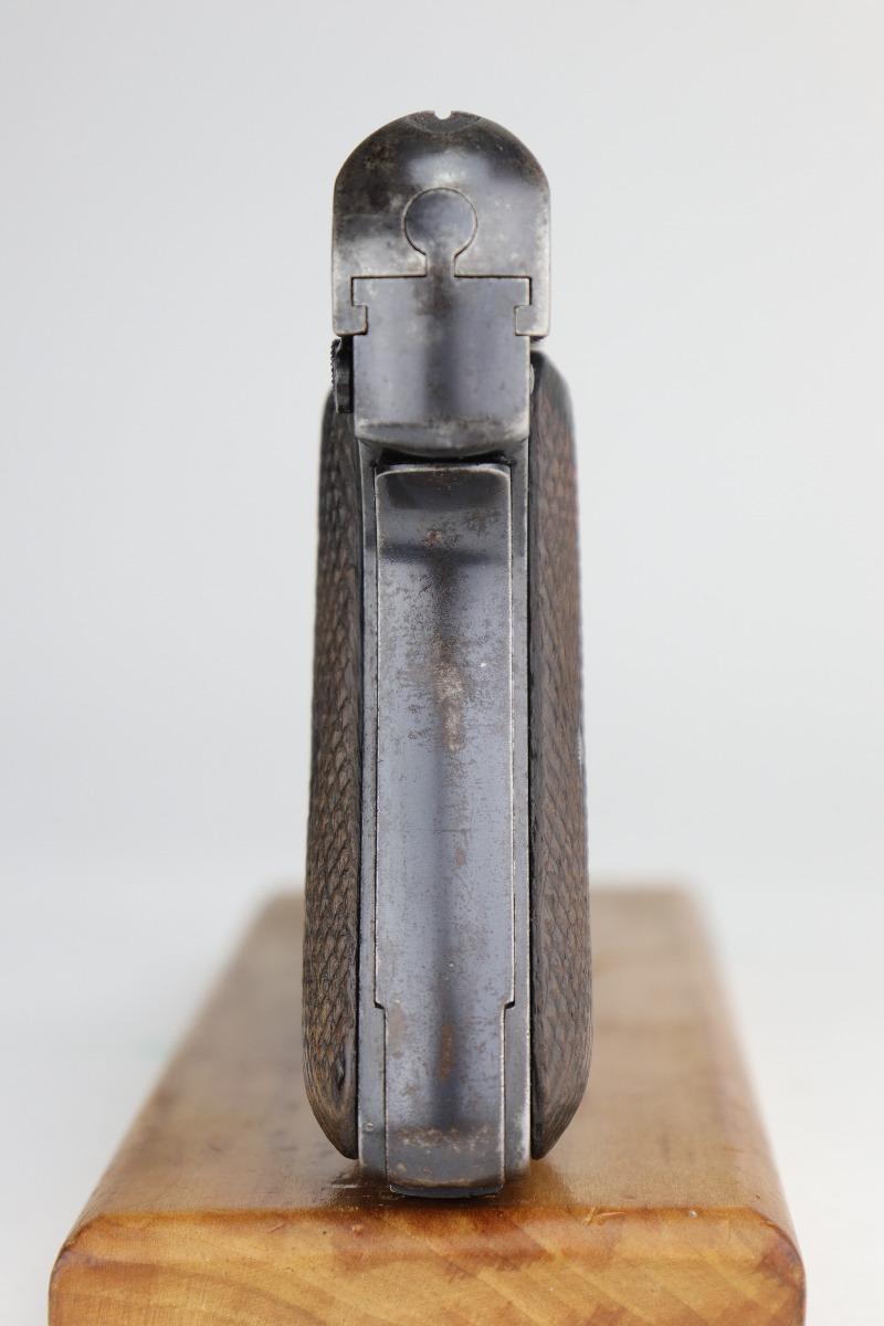 11/5/20 – This is a fairly rare DWM 7.65mm pistol manufactured between 1921 and 1931. With only around 40,000 produced total, DWM made this pistol and allegedly was sued by Browning for stealing their model 1910 patent. The pistol is a pretty unique piece of history made for commercial use. It has a very early “86” serial number. It has retained roughly 65% of its original finish. There is significant wear around the muzzle and on both sides of the slide. A couple of small areas of wear on the back strap. There are small dings and scratches along the length of the slide. There is spotty oxidation on the slide and both straps. It comes with nice grips that are slightly worn and one period-correct magazine. The bore has good rifling, but there is minor pin-pricking in the grooves.