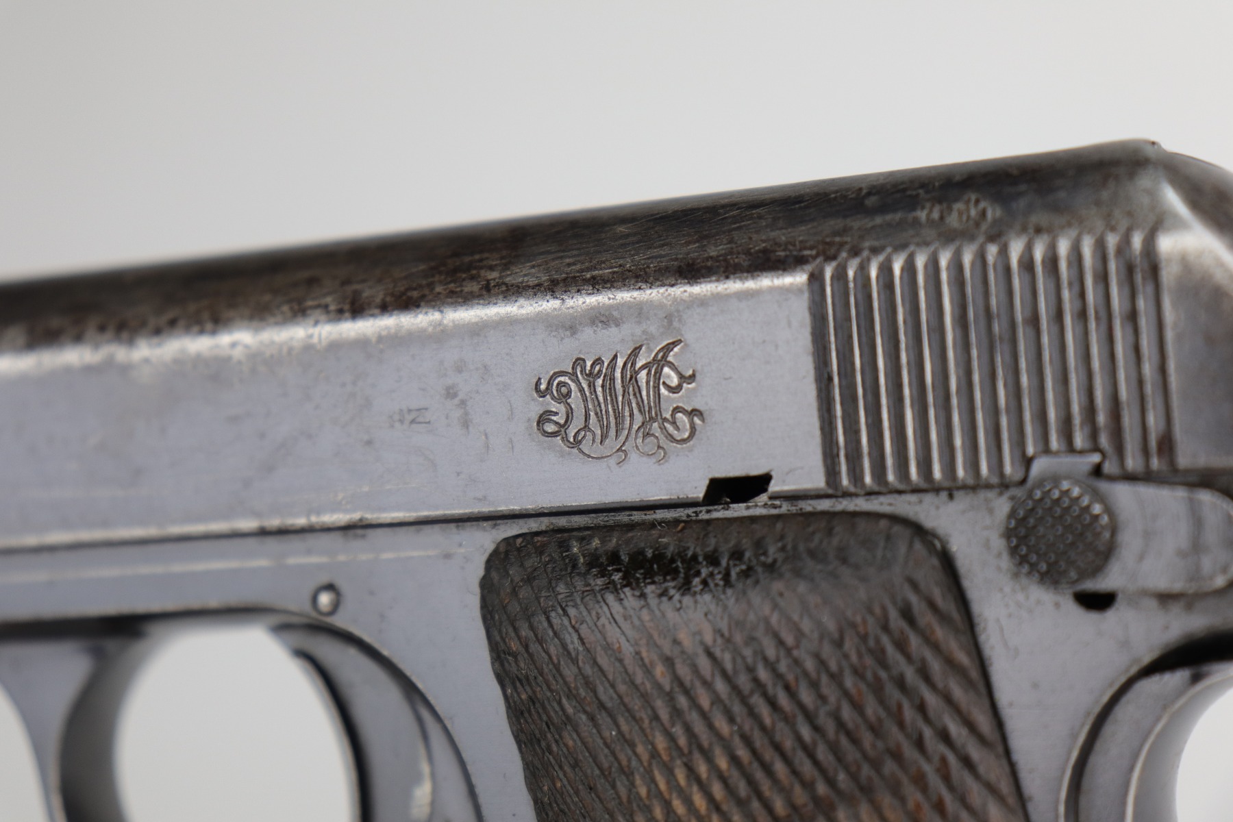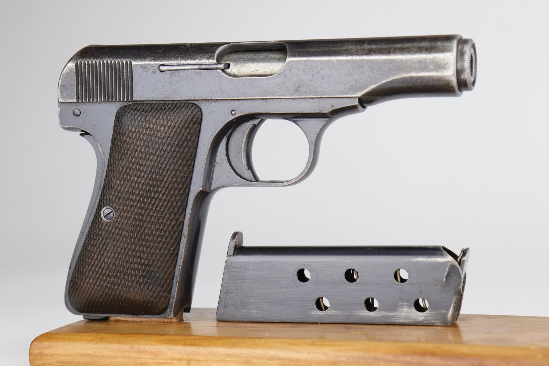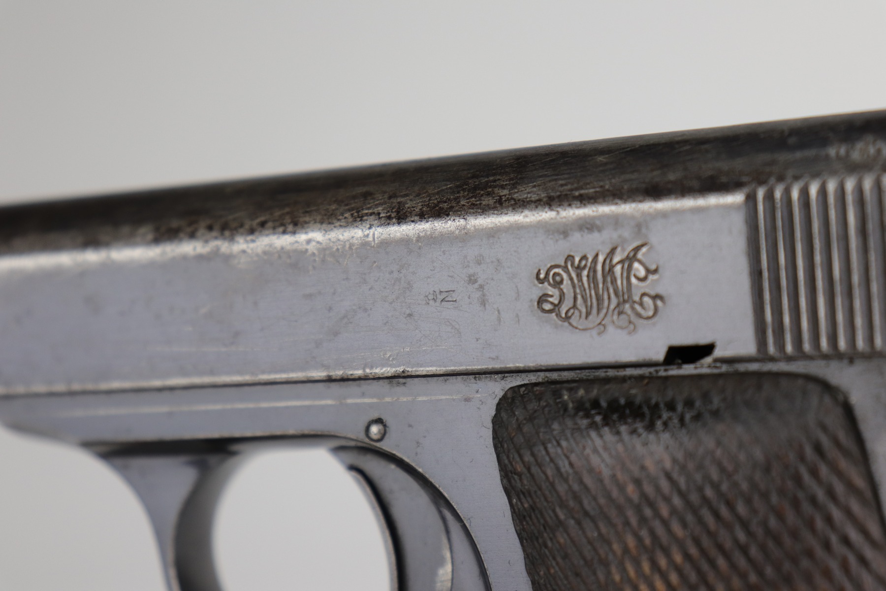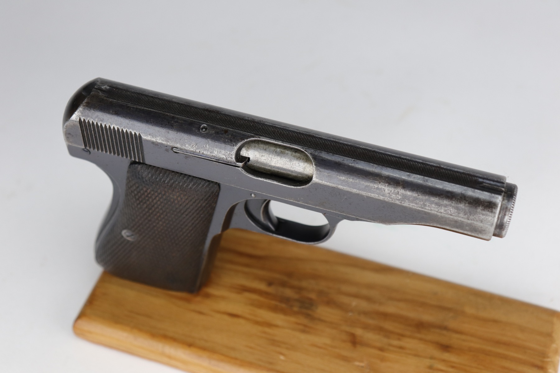 11/5/20 – This is a fairly rare DWM 7.65mm pistol manufactured between 1921 and 1931. With only around 40,000 produced total, DWM made this pistol and allegedly was sued by Browning for stealing their model 1910 patent. The pistol is a pretty unique piece of history made for commercial use. It has a very early “86” serial number. It has retained roughly 65% of its original finish. There is significant wear around the muzzle and on both sides of the slide. A couple of small areas of wear on the back strap. There are small dings and scratches along the length of the slide. There is spotty oxidation on the slide and both straps. It comes with nice grips that are slightly worn and one period-correct magazine. The bore has good rifling, but there is minor pin-pricking in the grooves.