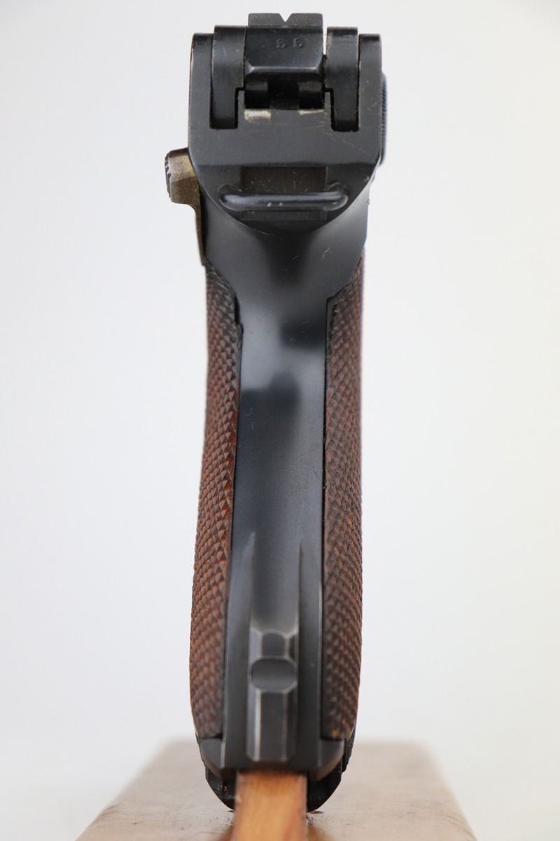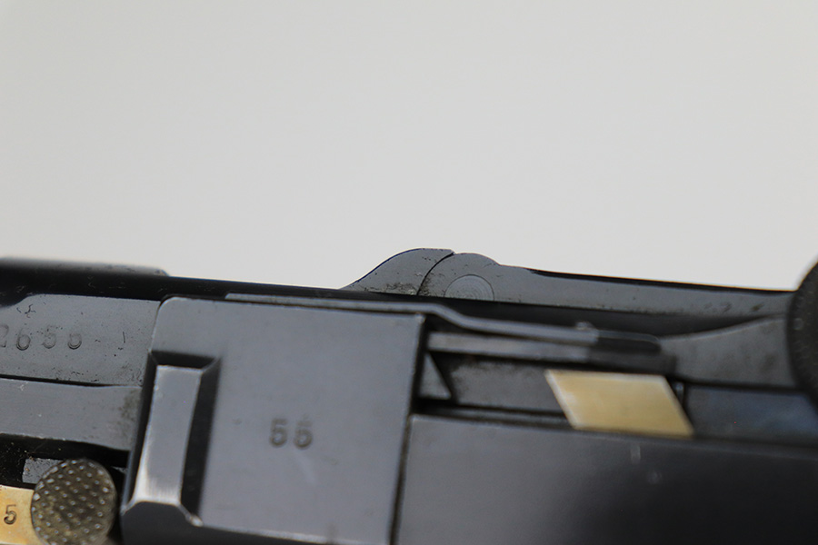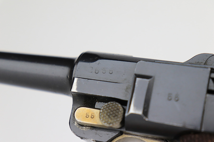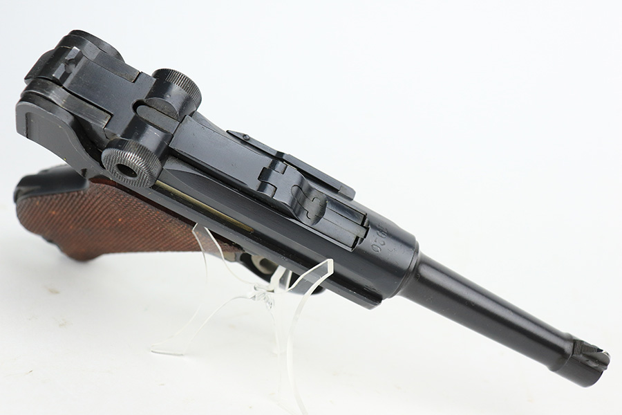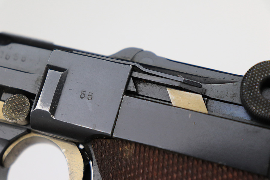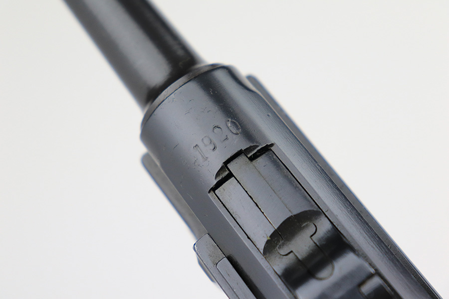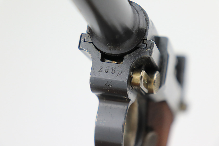 6/2/23 – This is a scarce DWM military “sneak” Luger from the Weimar period. These are typically termed Sneak Lugers based on the lack of any identifying manufactures markings and proof marks, which the Nazis did to disguise their early rearmament efforts. This one has a blank toggle and originally had no chamber date. It does have a “1920” marking, but this is a government property marking, likely an indication it went to a police arsenal. All numbered parts are matching. Weimar-era proofs on the right side of the slide. There is a police sear safety and a unit marking on the front strap. The entire gun has been refinished, so the bluing is really nice. There is just minor muzzle wear and hints of wear on the side plate and front edges of the side rails. Some very minor dulling on the back strap and tiny handling marks on the front strap. Fitted with minty un-numbered wood grips and comes with a mismatched magazine. Mint bore.