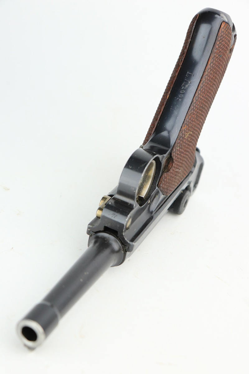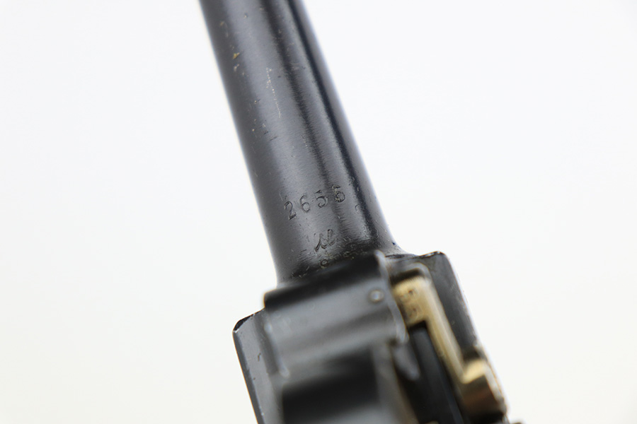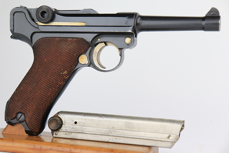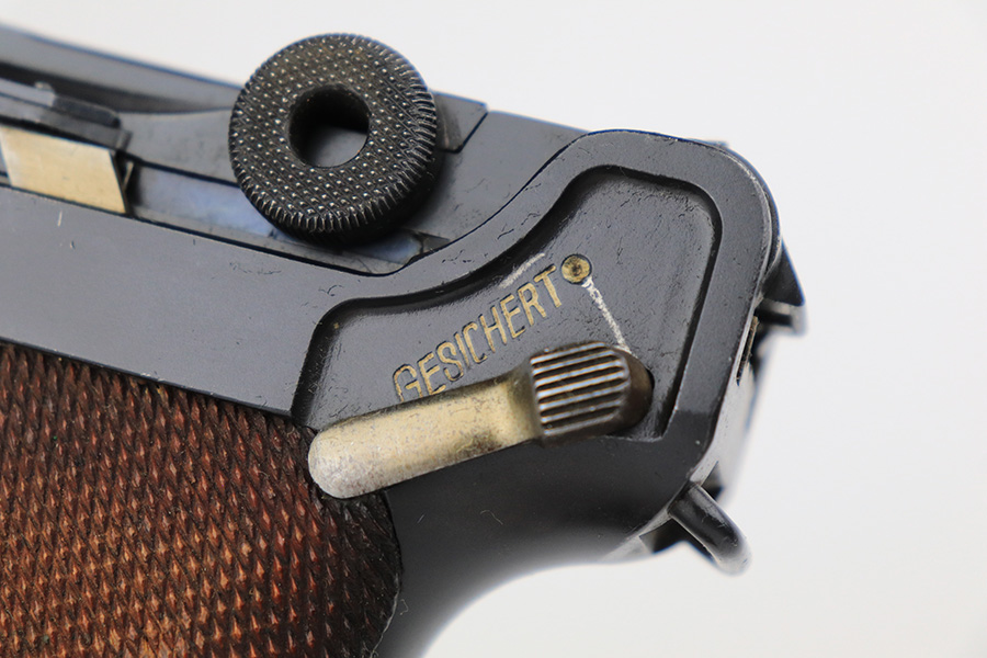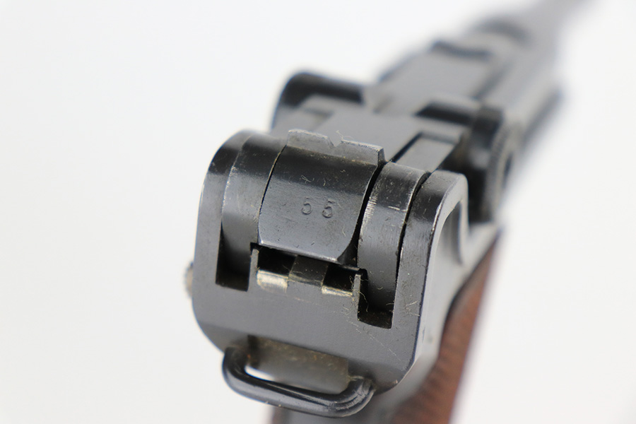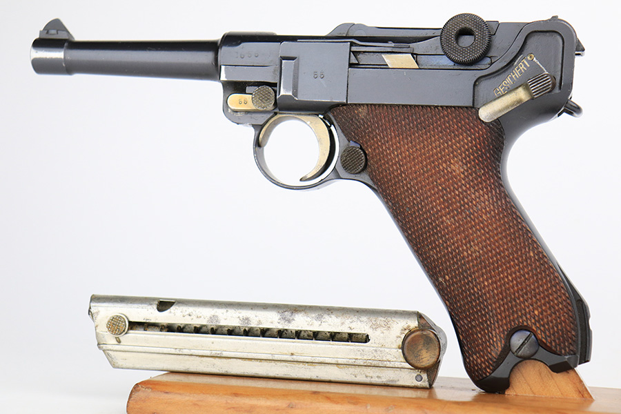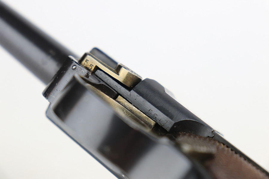 6/2/23 – This is a scarce DWM military “sneak” Luger from the Weimar period. These are typically termed Sneak Lugers based on the lack of any identifying manufactures markings and proof marks, which the Nazis did to disguise their early rearmament efforts. This one has a blank toggle and originally had no chamber date. It does have a “1920” marking, but this is a government property marking, likely an indication it went to a police arsenal. All numbered parts are matching. Weimar-era proofs on the right side of the slide. There is a police sear safety and a unit marking on the front strap. The entire gun has been refinished, so the bluing is really nice. There is just minor muzzle wear and hints of wear on the side plate and front edges of the side rails. Some very minor dulling on the back strap and tiny handling marks on the front strap. Fitted with minty un-numbered wood grips and comes with a mismatched magazine. Mint bore.