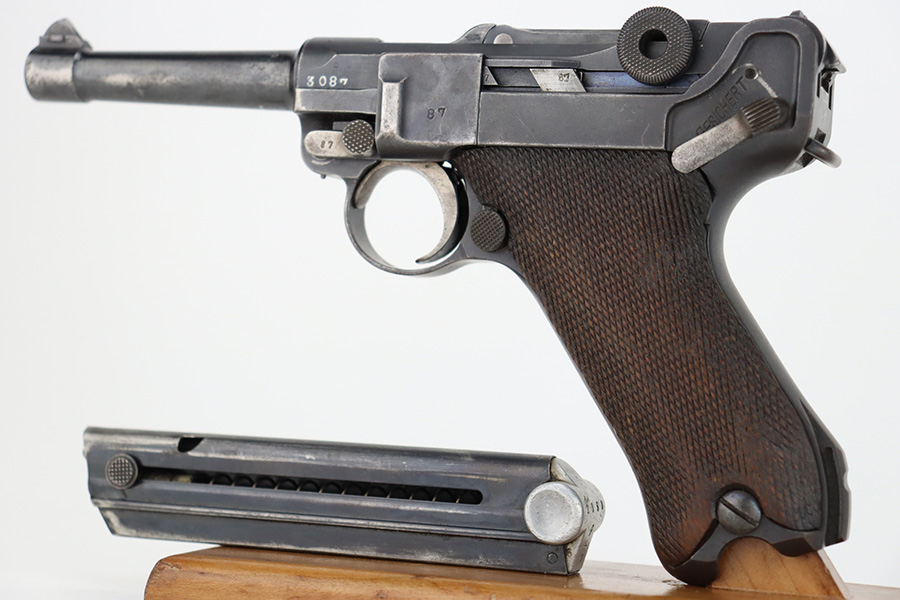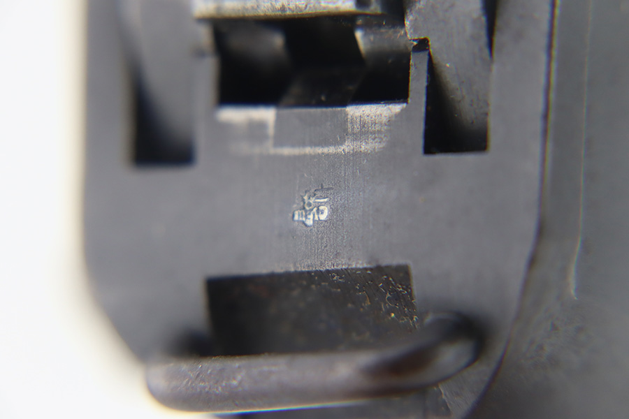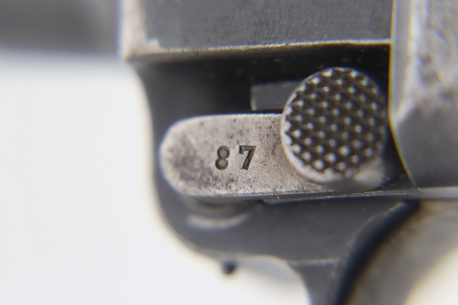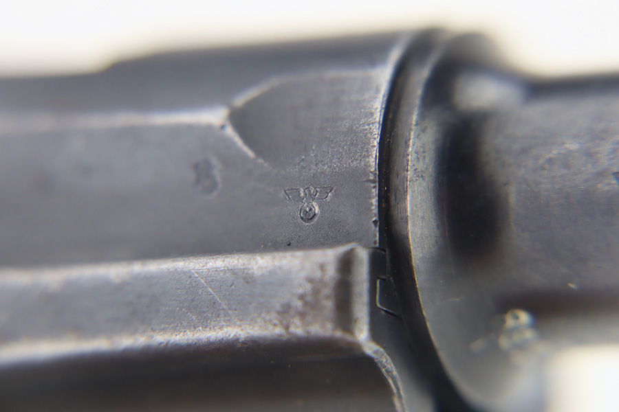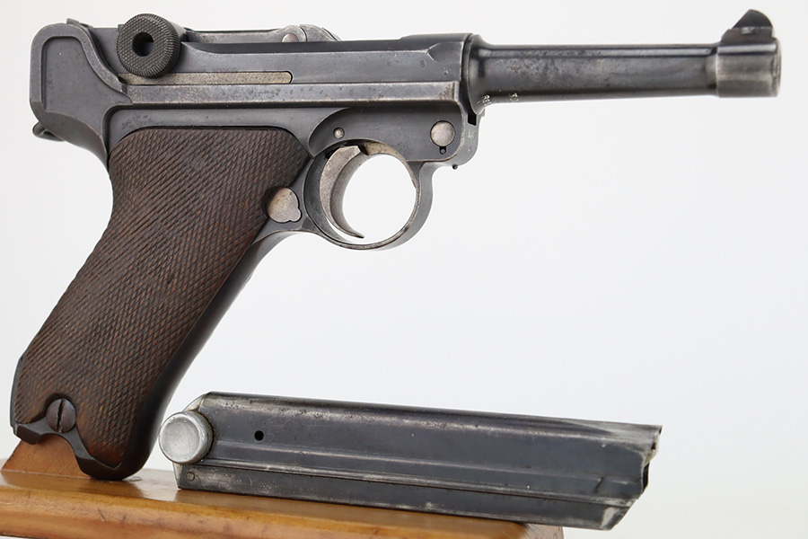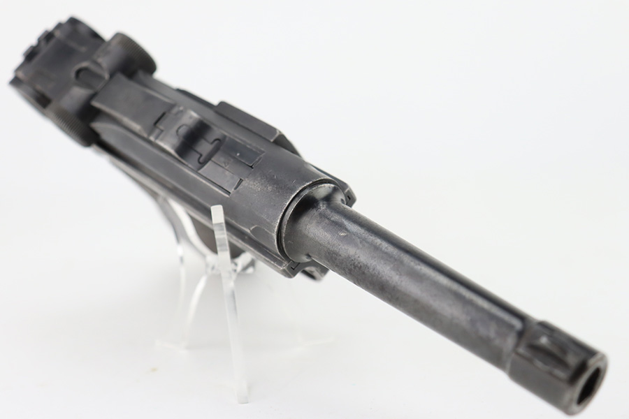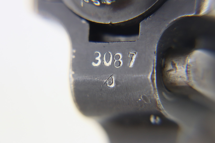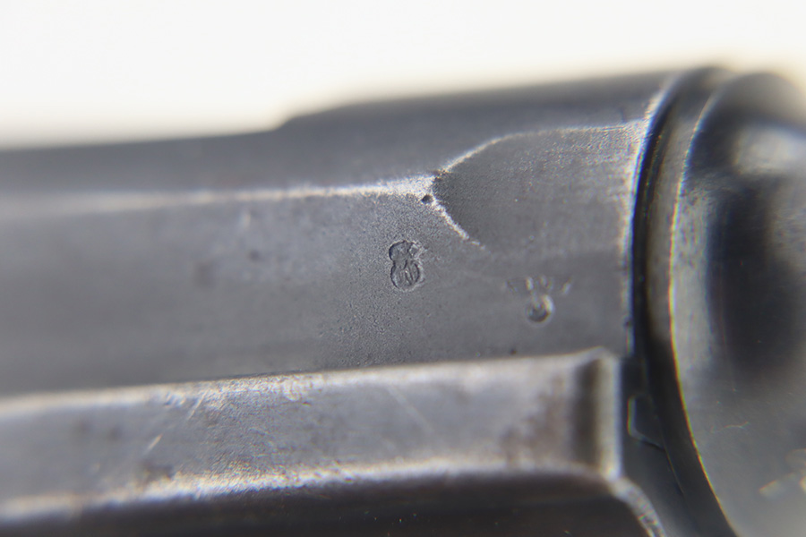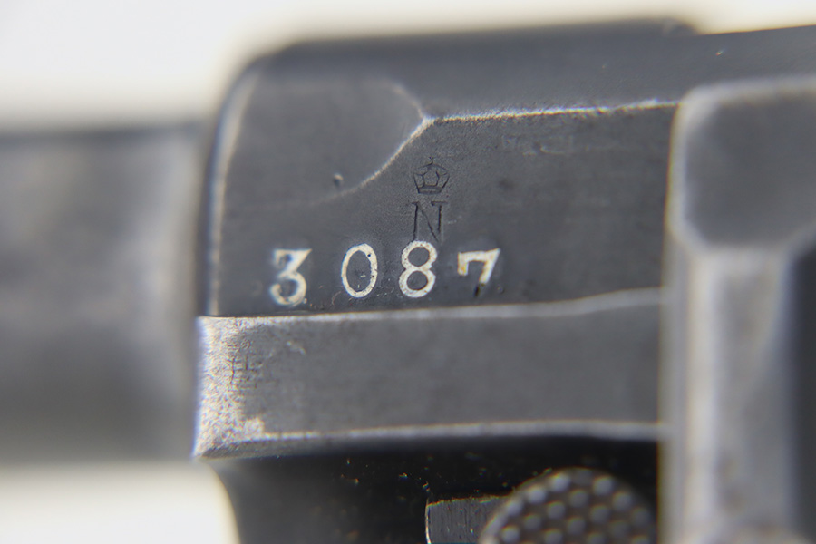 2/27/24 – This is a scarce DWM military “sneak” Luger from the Weimar period. These are typically termed Sneak Lugers based on the lack of any identifying manufactures markings and proof marks, which the Nazis did to disguise their early rearmament efforts. This one has a blank chamber and Nazi-era test Eagle proofs on the right side of the slide, barrel, and on the tang. All numbered parts are matching. Its finish rates somewhere between 85-90%. The majority of the finish loss is on the barrel and on the side plate. Brown patina on the grip straps. Light spotty oxidation along the barrel. Fitted with matching-numbered grips – there is a name scratched on the inside of the left panel. Comes with a mismatched “Eagle 83” magazine. Very nice bore.