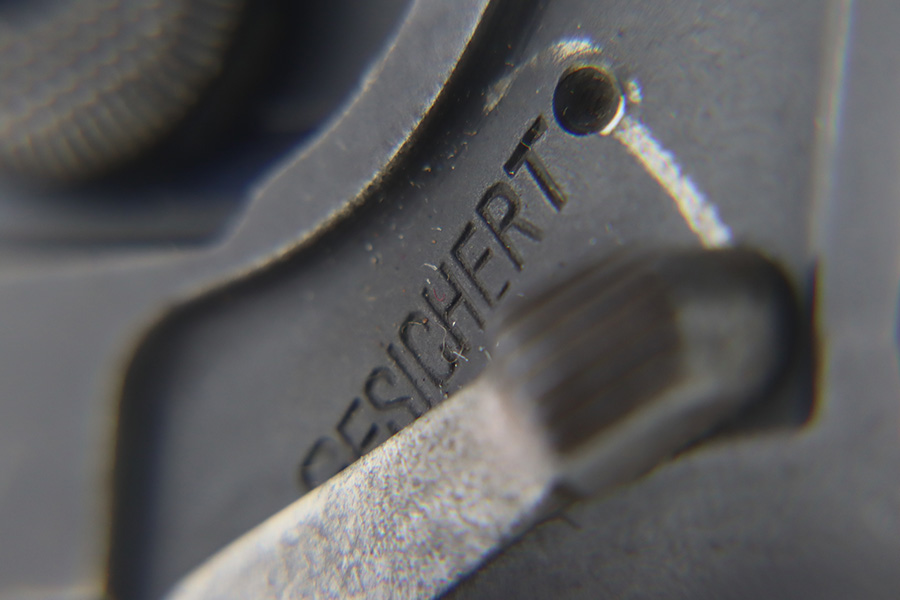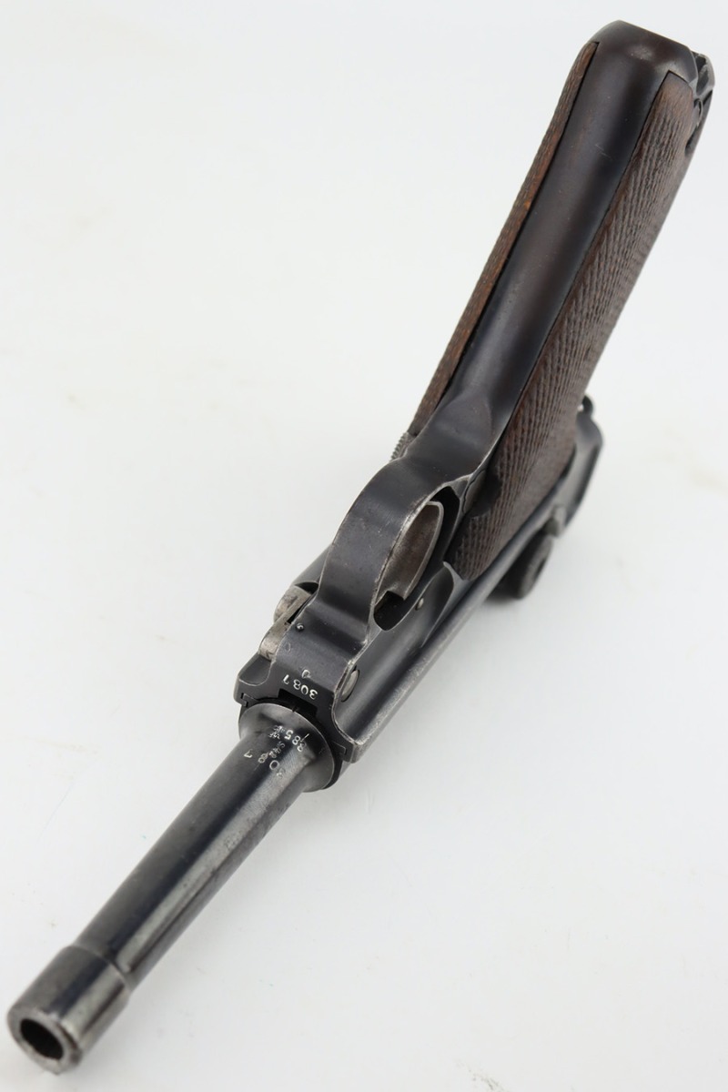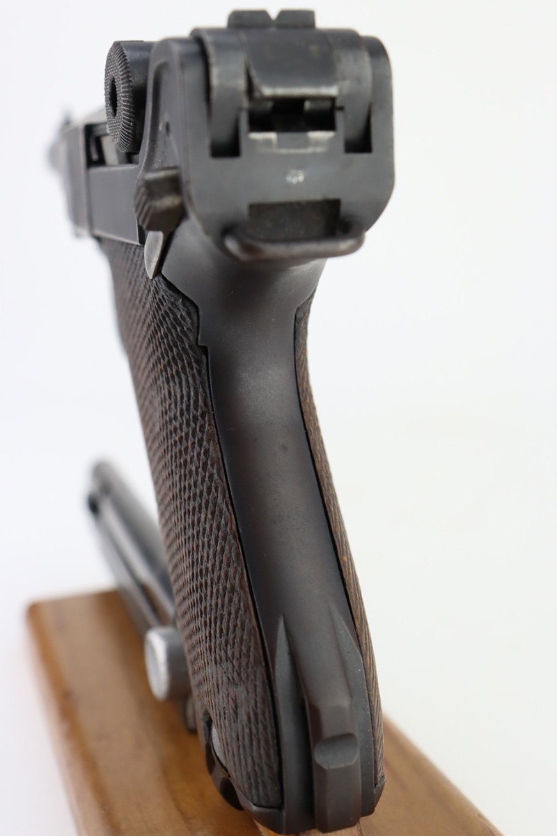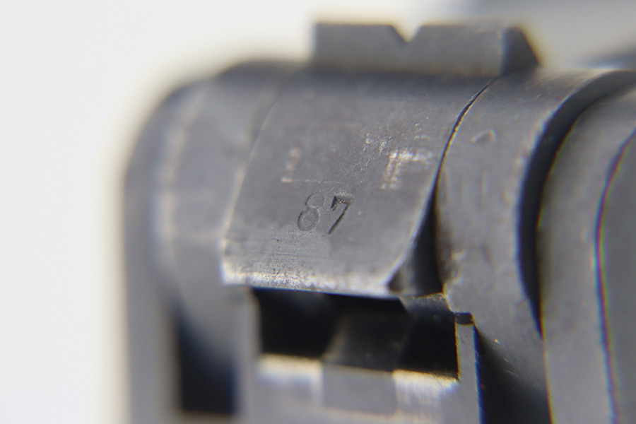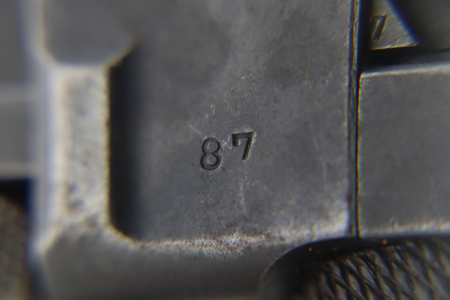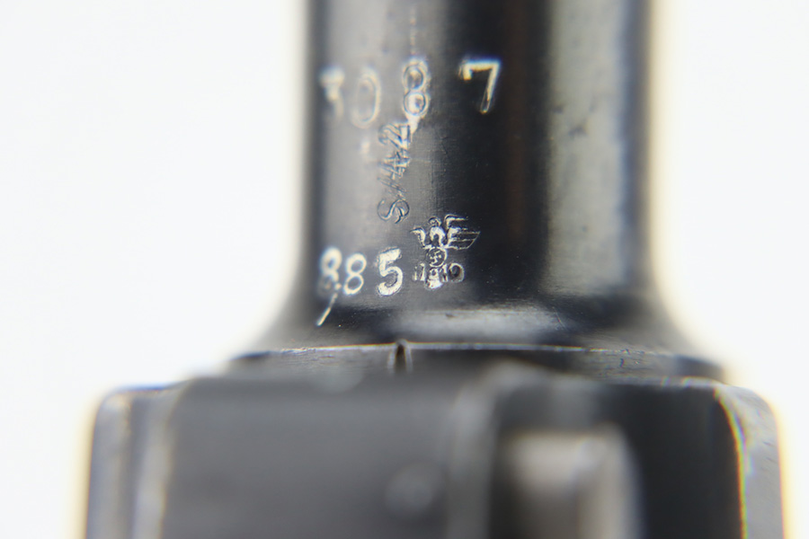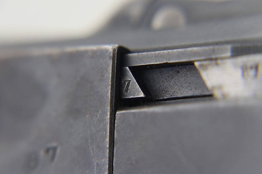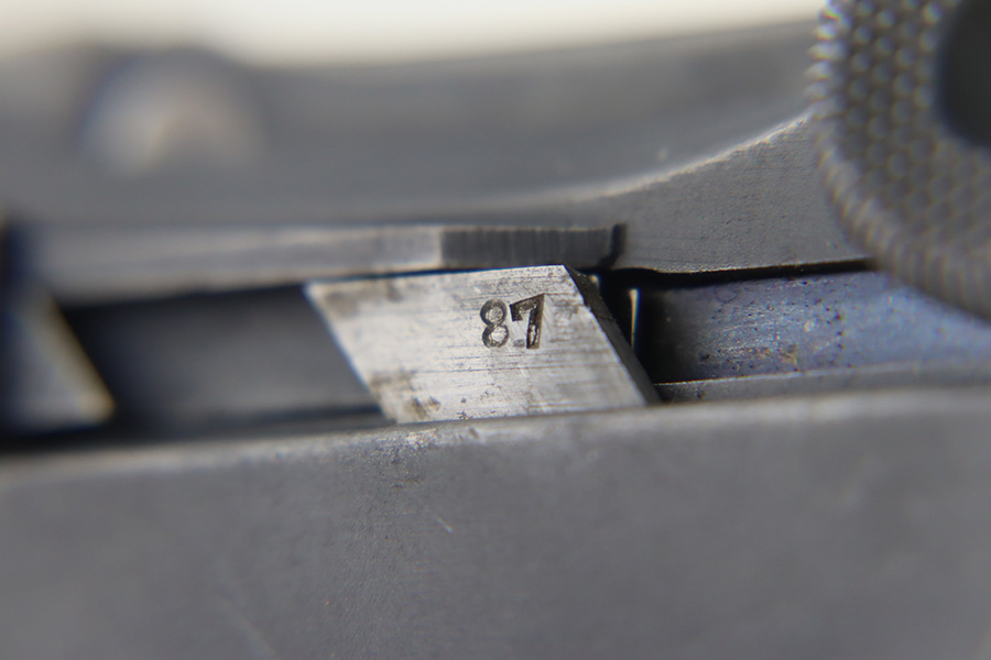 2/27/24 – This is a scarce DWM military “sneak” Luger from the Weimar period. These are typically termed Sneak Lugers based on the lack of any identifying manufactures markings and proof marks, which the Nazis did to disguise their early rearmament efforts. This one has a blank chamber and Nazi-era test Eagle proofs on the right side of the slide, barrel, and on the tang. All numbered parts are matching. Its finish rates somewhere between 85-90%. The majority of the finish loss is on the barrel and on the side plate. Brown patina on the grip straps. Light spotty oxidation along the barrel. Fitted with matching-numbered grips – there is a name scratched on the inside of the left panel. Comes with a mismatched “Eagle 83” magazine. Very nice bore.