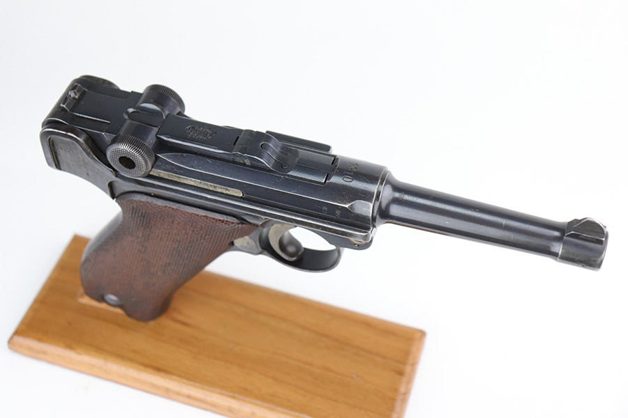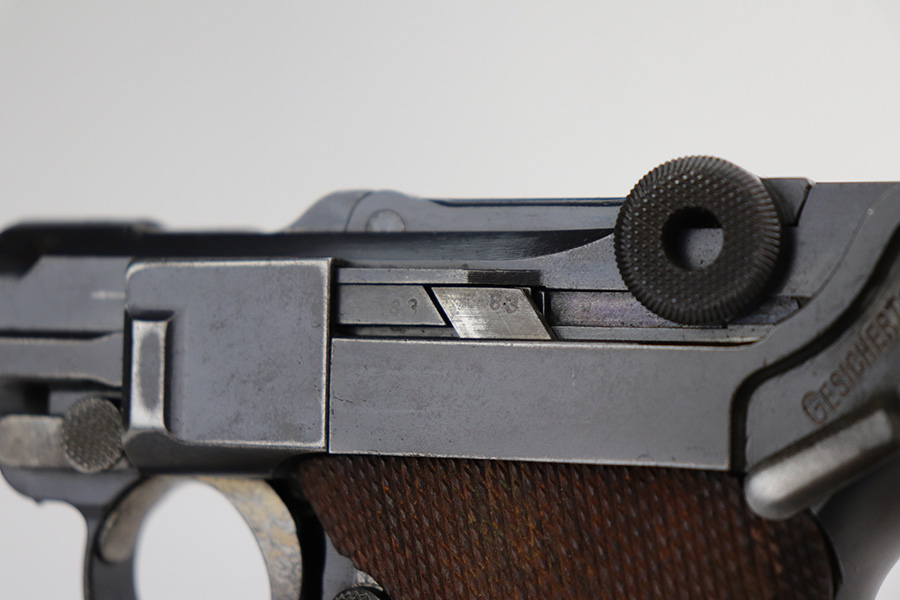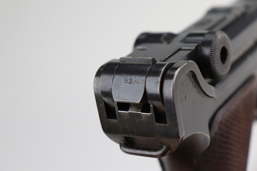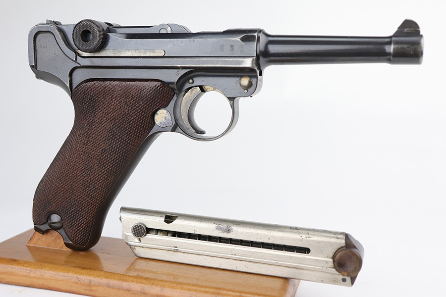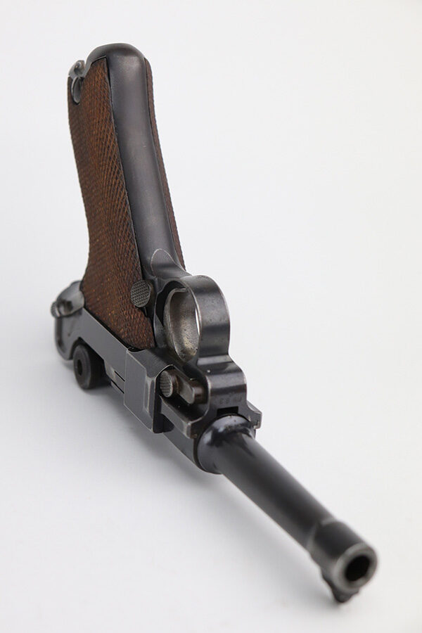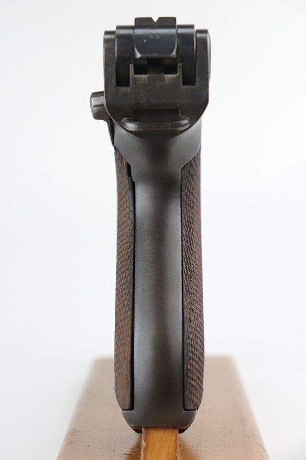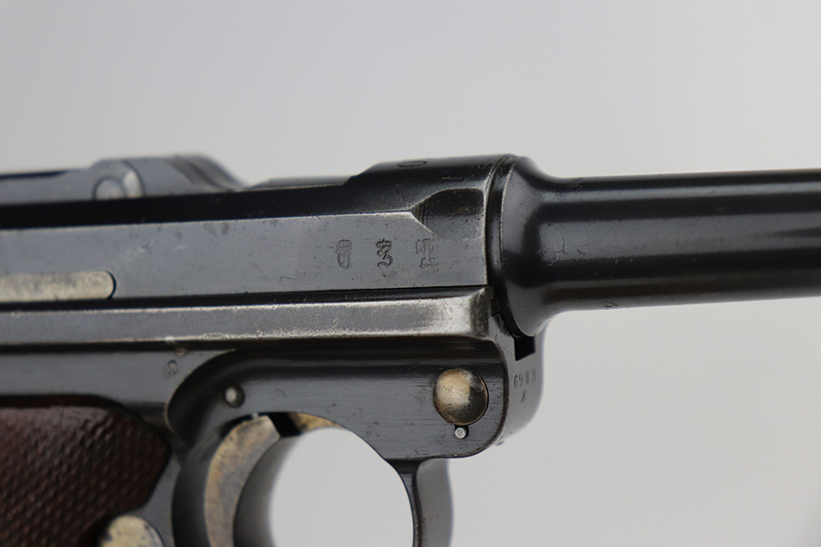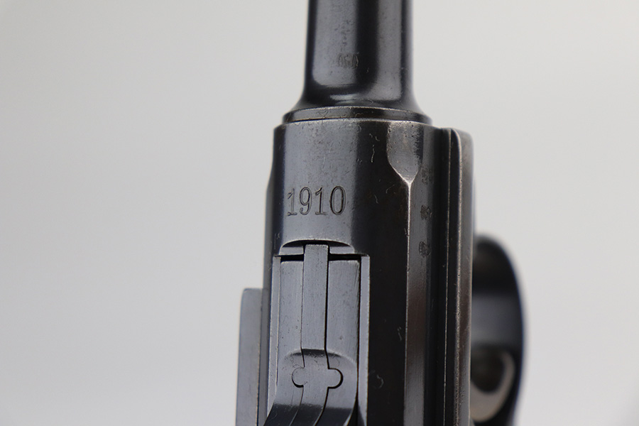 9/17/21 – This is a very nice example of a scarce early DWM Luger manufactured in 1910 and issued to the Imperial German Military. It is all matching and has the proper Imperial proofs. It has early features such as no stock lug and originally had no hold-open but one has been added. The gun has retained about 93% of its original finish. There is minor wear on the side plate, side rails, and around the muzzle. There is tiny pin-pricking throughout and brown patina on the straps. An area of minor pitting around the muzzle. Comes with excellent wood grips – one is un-numbered, the other is numbered but mismatched. Also comes with a mismatched WW1-era magazine that has the proper early-style numbering (small chip in the bottom). Very nice bore with good rifling.