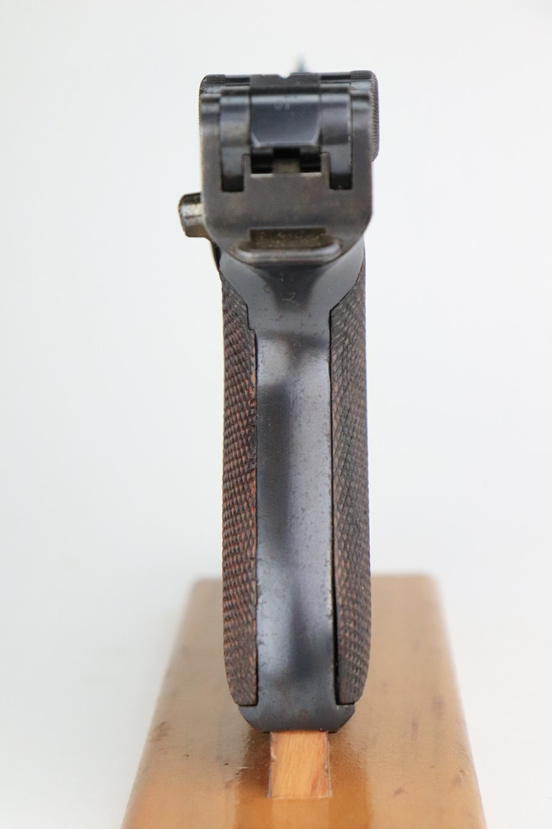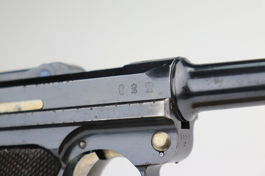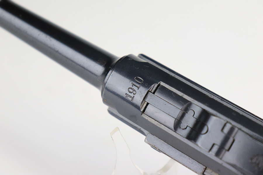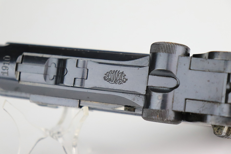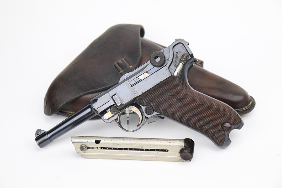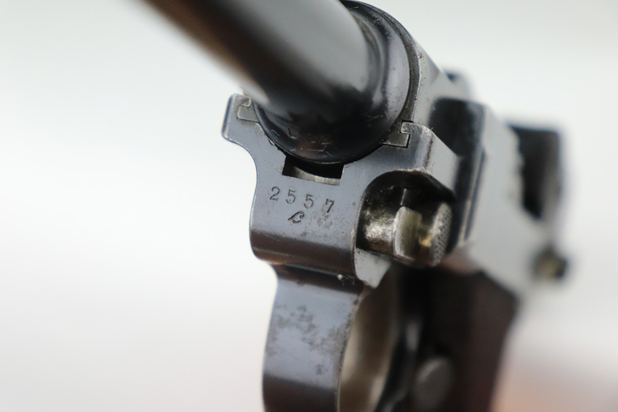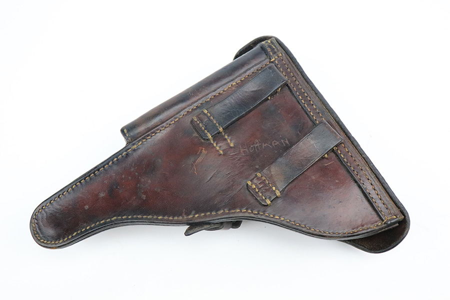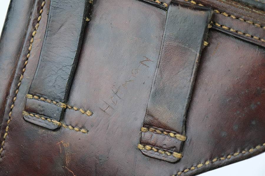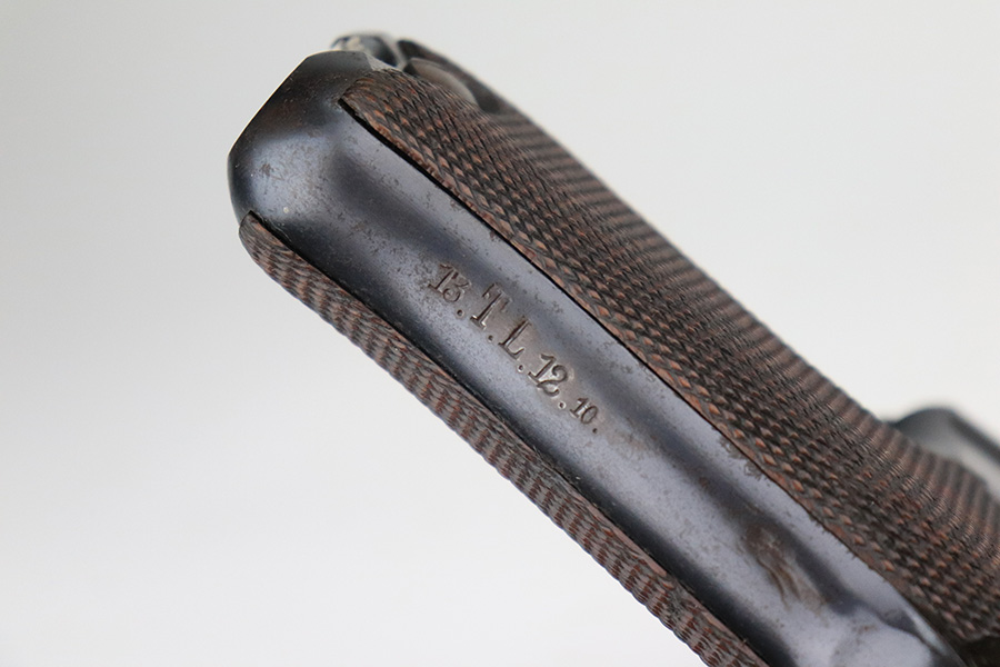 6/22/22 – This is a scarce, early DWM Luger from 1910 with a “13.T.L.12.10.” military unit marking on the front strap. There were only 20,000 military produced DWM Lugers that year, and only about 20% of those are estimated to be unit marked. The majority of the unit-marked 1910 DWM Lugers went to the cavalry. This one has all matching numbers, including the original grips. It comes as a rig with a 1911-dated holster and an early wood bottom magazine that is mismatched to the gun. The leather of the holster is fairly dry and starting to crack is some areas. The name “Hoffman” is lightly scratched on the back. The gun itself has retained about 96% of its original finish. Very minor wear on the side plate, side rails, and around the muzzle. There is some light scratchy wear and a small dent on the front strap. While there is not much actual finish loss, there are tiny dots of oxidation throughout, most noticeable on the grip straps. The bore has good rifling with minor frosting in the grooves. No added hold-open.