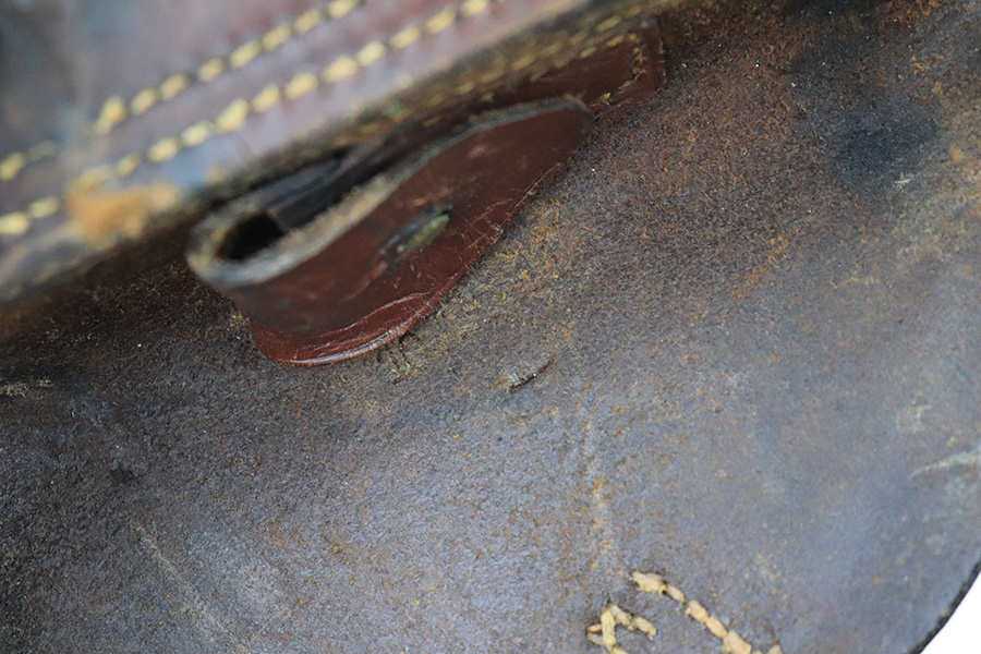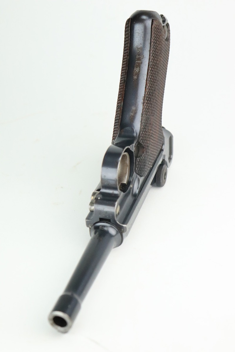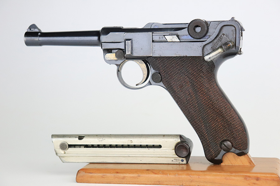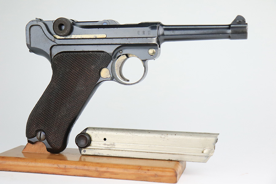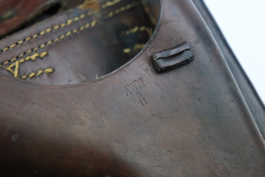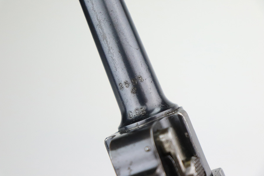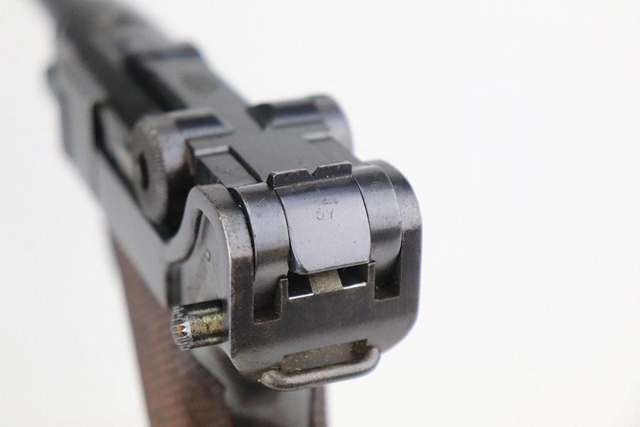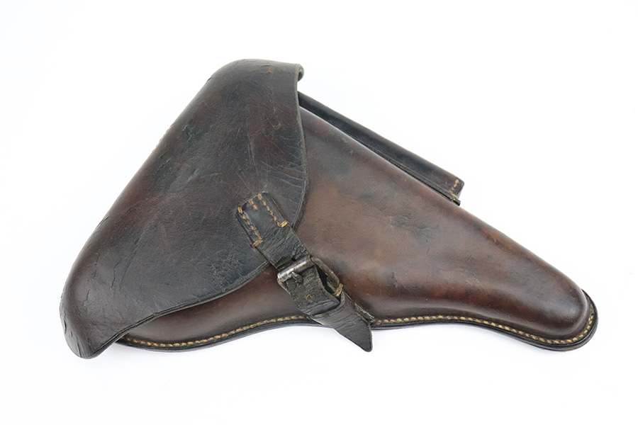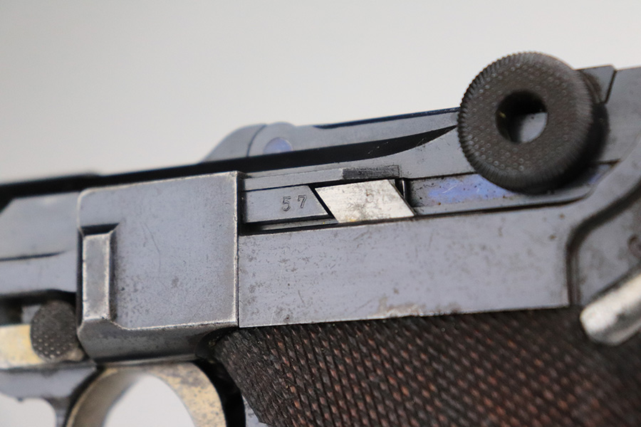 6/22/22 – This is a scarce, early DWM Luger from 1910 with a “13.T.L.12.10.” military unit marking on the front strap. There were only 20,000 military produced DWM Lugers that year, and only about 20% of those are estimated to be unit marked. The majority of the unit-marked 1910 DWM Lugers went to the cavalry. This one has all matching numbers, including the original grips. It comes as a rig with a 1911-dated holster and an early wood bottom magazine that is mismatched to the gun. The leather of the holster is fairly dry and starting to crack is some areas. The name “Hoffman” is lightly scratched on the back. The gun itself has retained about 96% of its original finish. Very minor wear on the side plate, side rails, and around the muzzle. There is some light scratchy wear and a small dent on the front strap. While there is not much actual finish loss, there are tiny dots of oxidation throughout, most noticeable on the grip straps. The bore has good rifling with minor frosting in the grooves. No added hold-open.