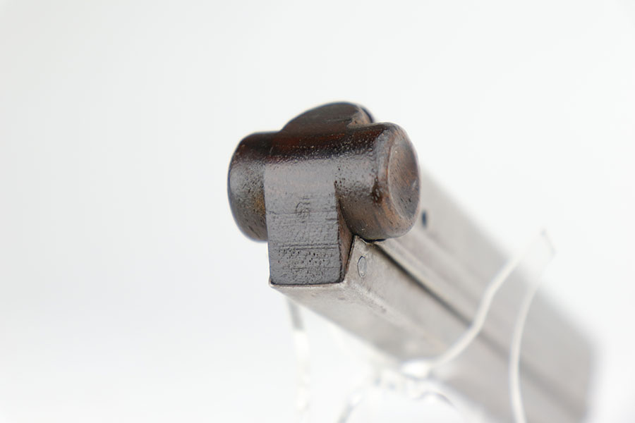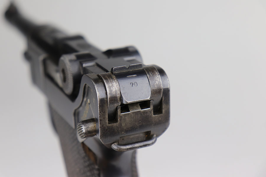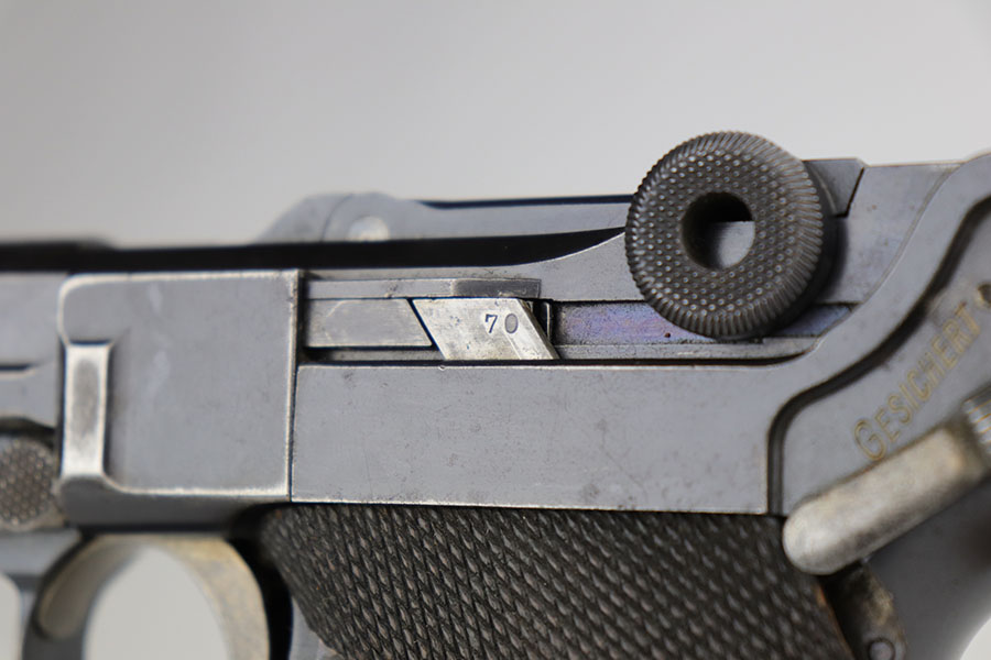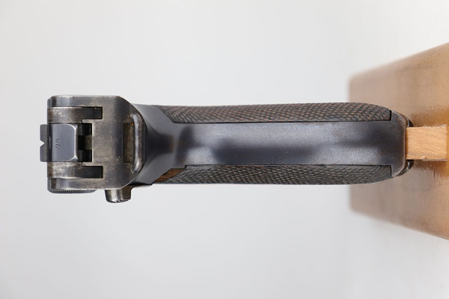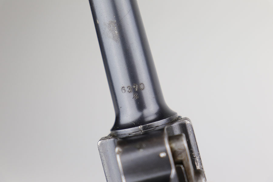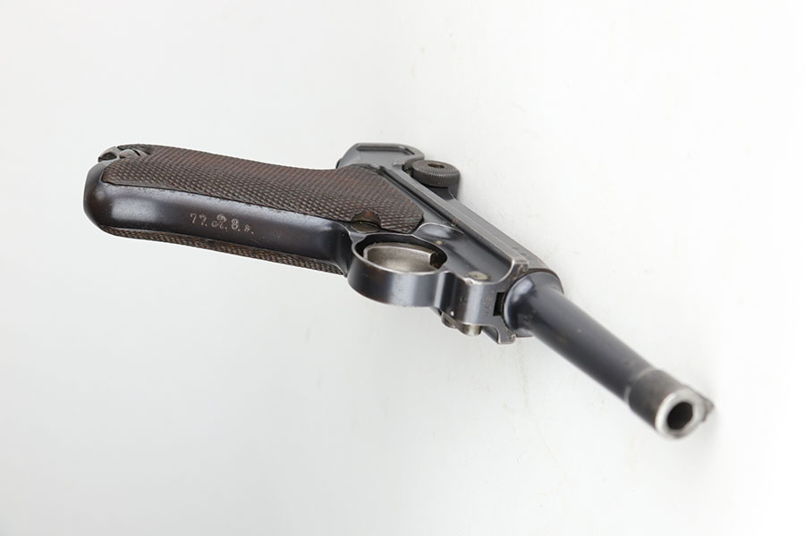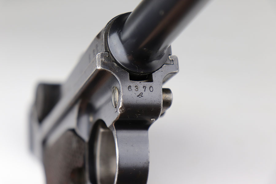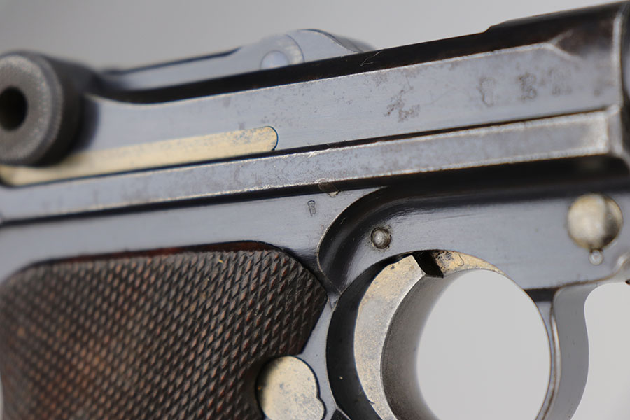 8/12/20 – This is a scarce, early DWM Luger from 1910 with military unit marking on the front strap. There were only 20,000 military produced DWM Lugers that year, and only about 20% of those are estimated to be unit marked. This one has all matching numbers, including the original grips. There’s wear on each side of the muzzle, and more on the sideplate and back of frame. There’s also some oxidation on the straps and right side of pistol. Front strap is unit marked ’77.R.8.2′, which I believe would mean ’77th Infantry, Company 8, Weapon 2. Grips show some smoothing and the left panel has the common safety chip. Bore is fairly worn. There’s some rifling left but frost and freckling throughout. Magazine has imperial marking but otherwise unnumbered.