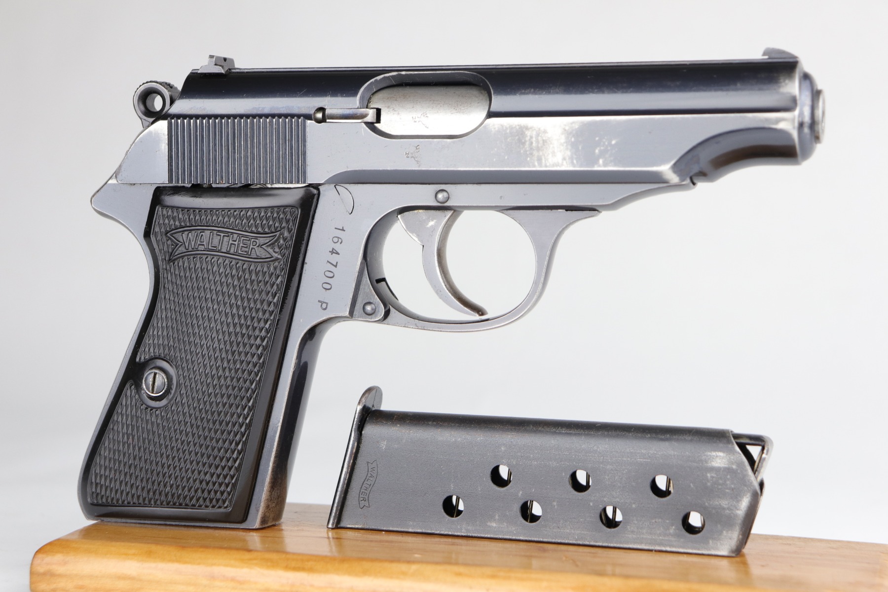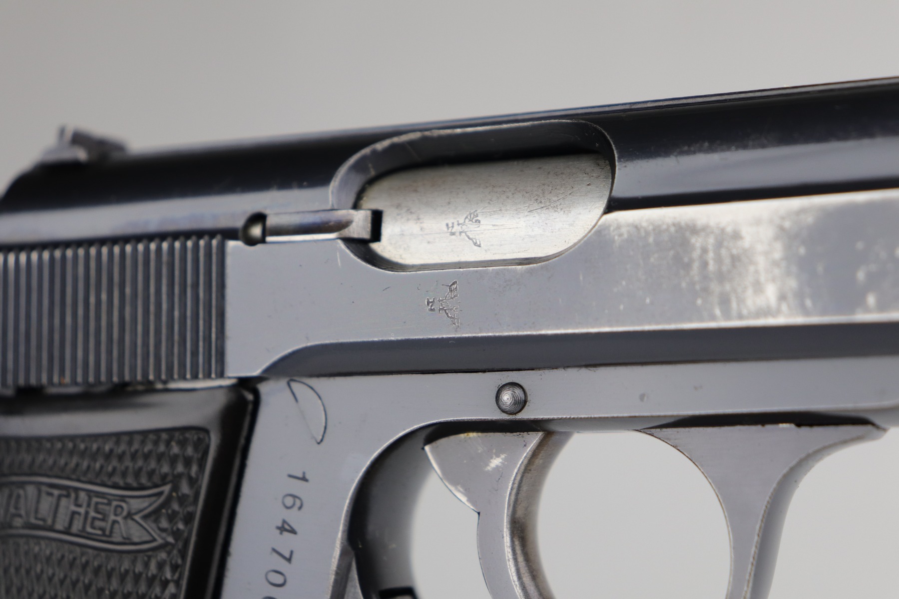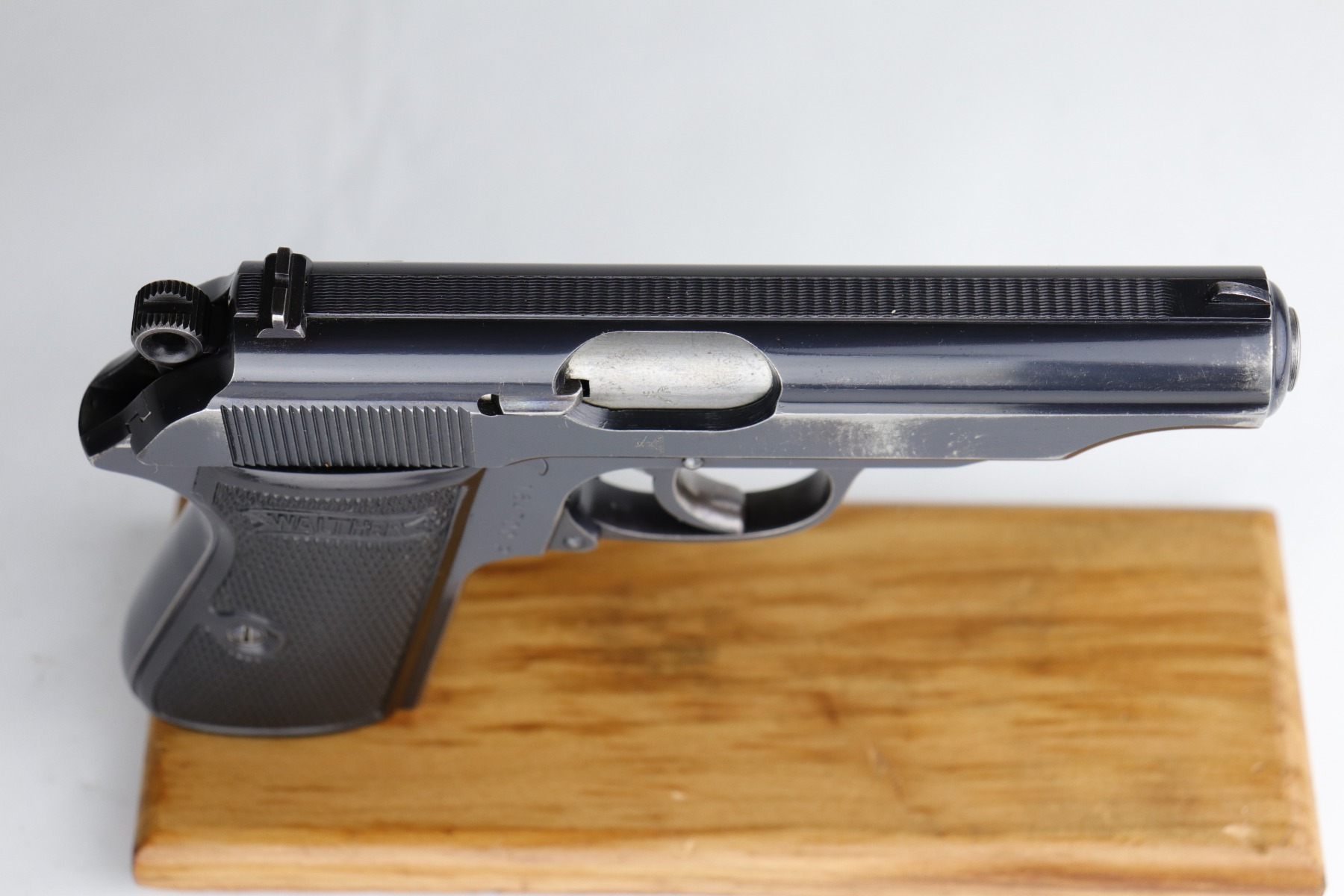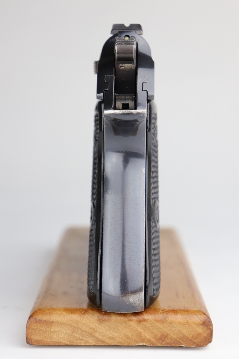 4/25/20 – This is a scarce, first-variation Nazi military-issued Walther PP pistol, manufactured in 1940. It is an early, high-polish finish. It has “Eagle 359” military acceptance proofs on the frame and on the slide, near the tang. The gun is completely original. It has retained about 92-93% of its original bluing. There is high edge wear on the slide, near the muzzle. There are also small areas of wear on the straps, near the magazine. The largest area of wear is on the right side of the slide. Slight wear on the high edges near the tang. The gun is fully functional. It comes with a Walther banner magazine. Excellent original grips. The bore is excellent – shiny with strong rifling, but very minor frosting.