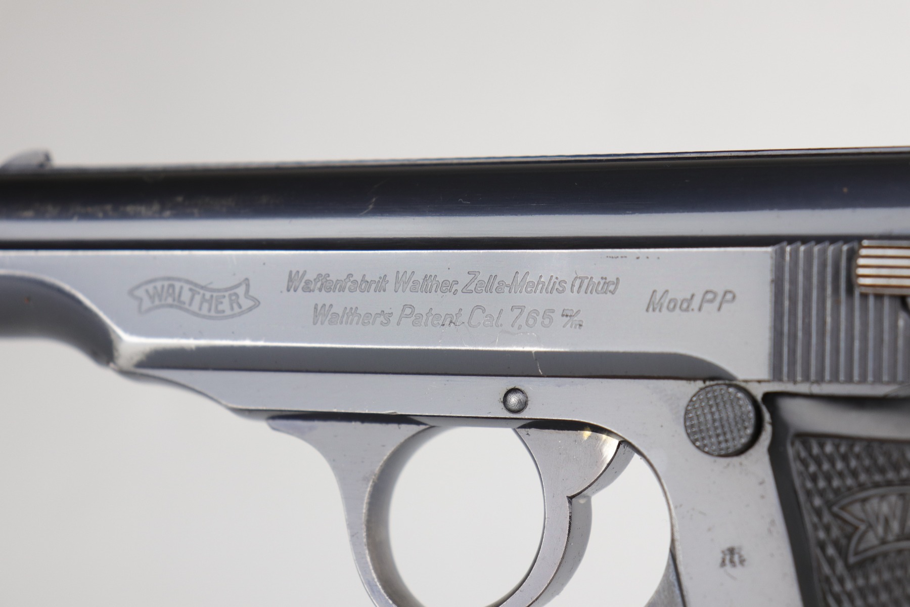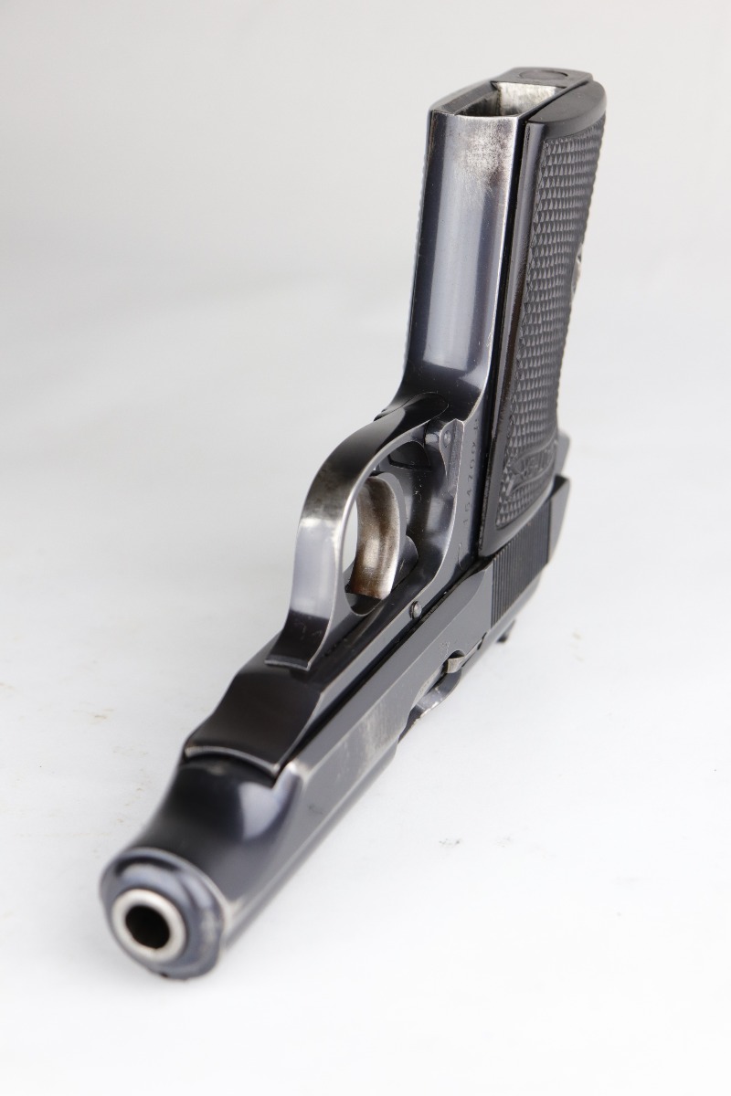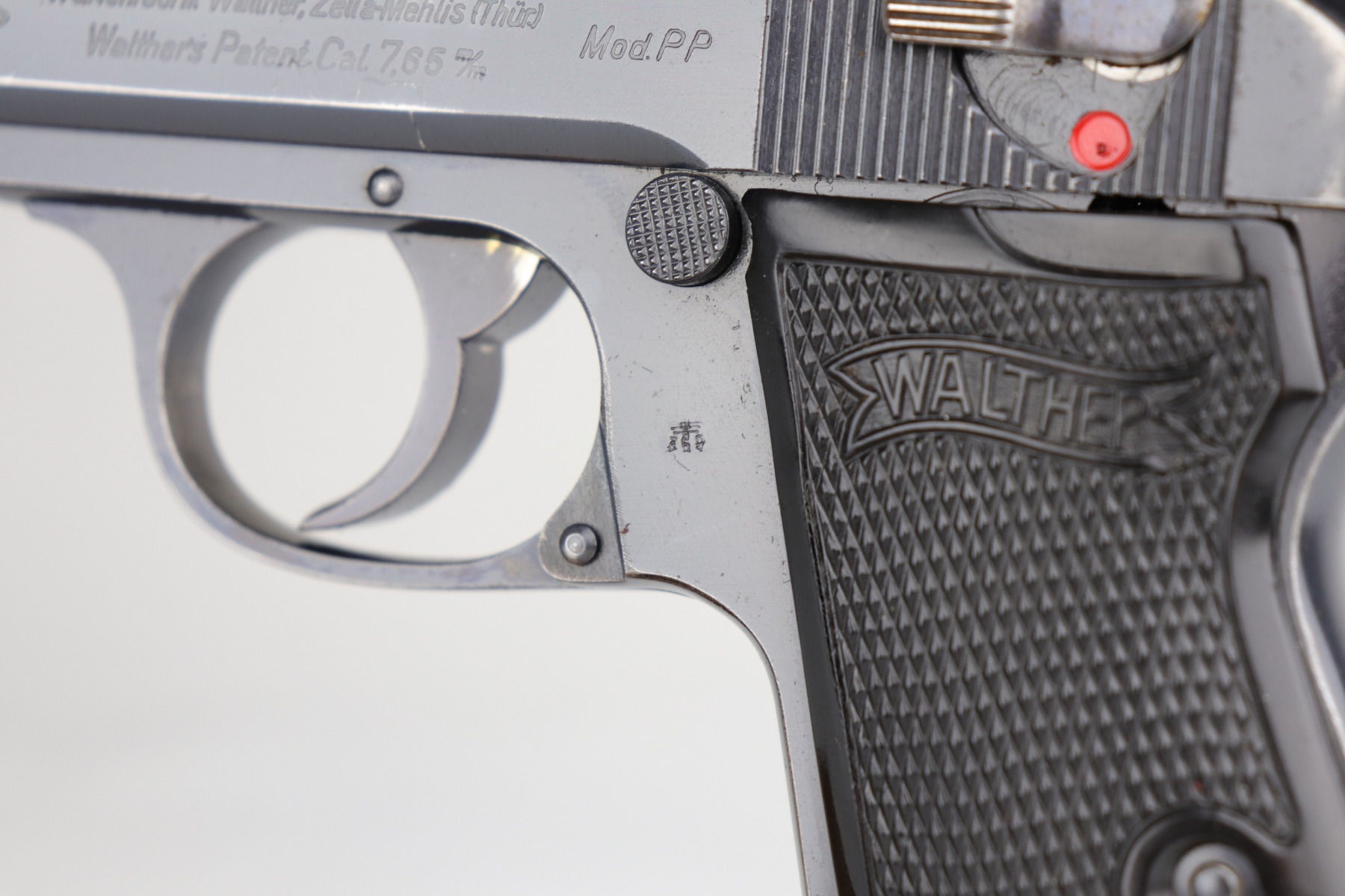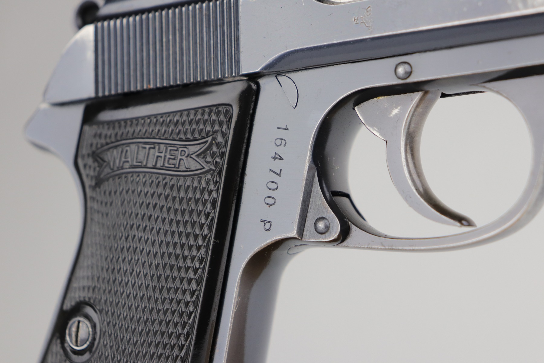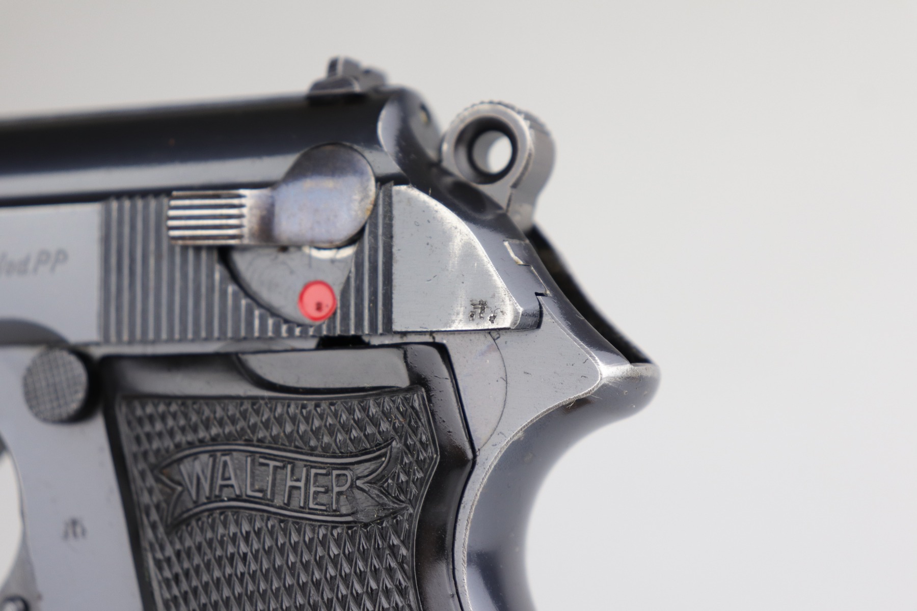 4/25/20 – This is a scarce, first-variation Nazi military-issued Walther PP pistol, manufactured in 1940. It is an early, high-polish finish. It has “Eagle 359” military acceptance proofs on the frame and on the slide, near the tang. The gun is completely original. It has retained about 92-93% of its original bluing. There is high edge wear on the slide, near the muzzle. There are also small areas of wear on the straps, near the magazine. The largest area of wear is on the right side of the slide. Slight wear on the high edges near the tang. The gun is fully functional. It comes with a Walther banner magazine. Excellent original grips. The bore is excellent – shiny with strong rifling, but very minor frosting.