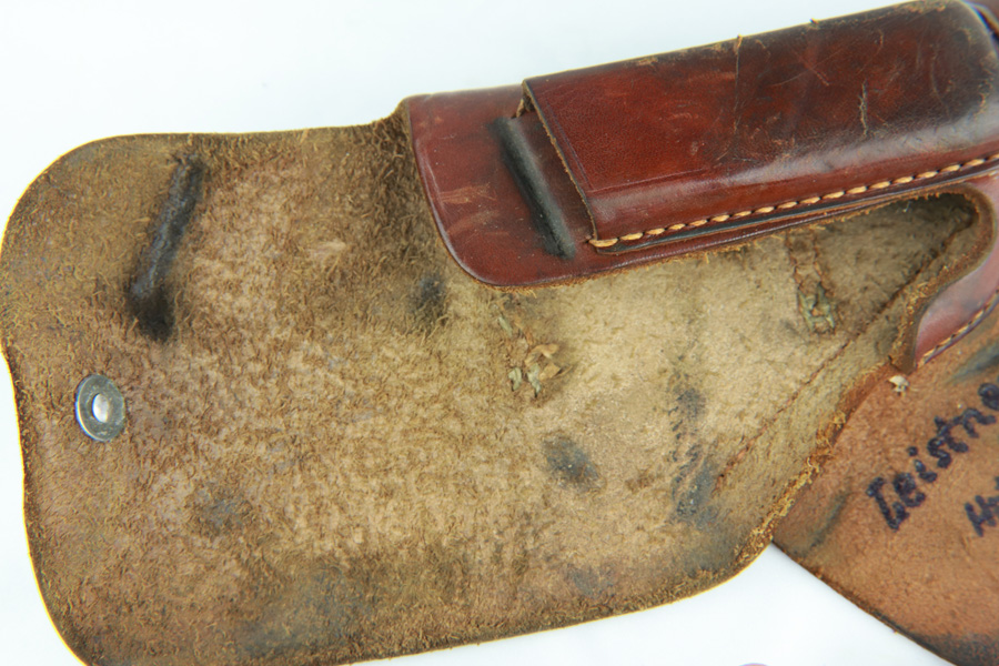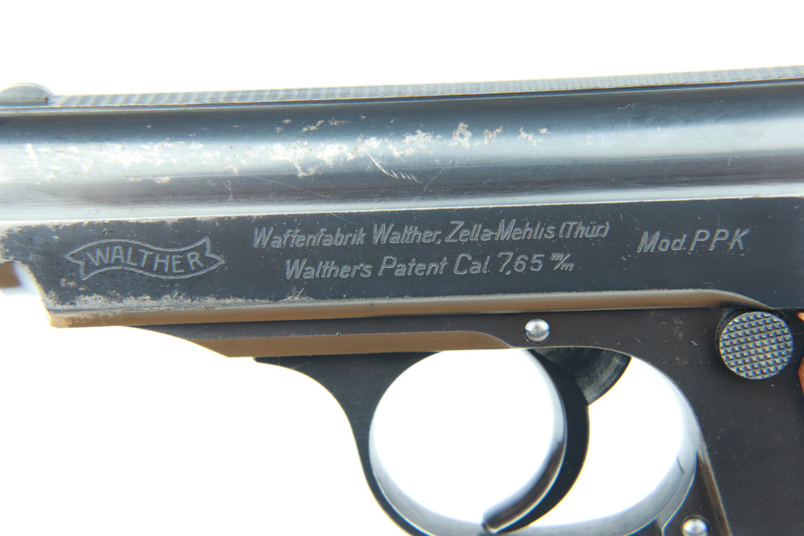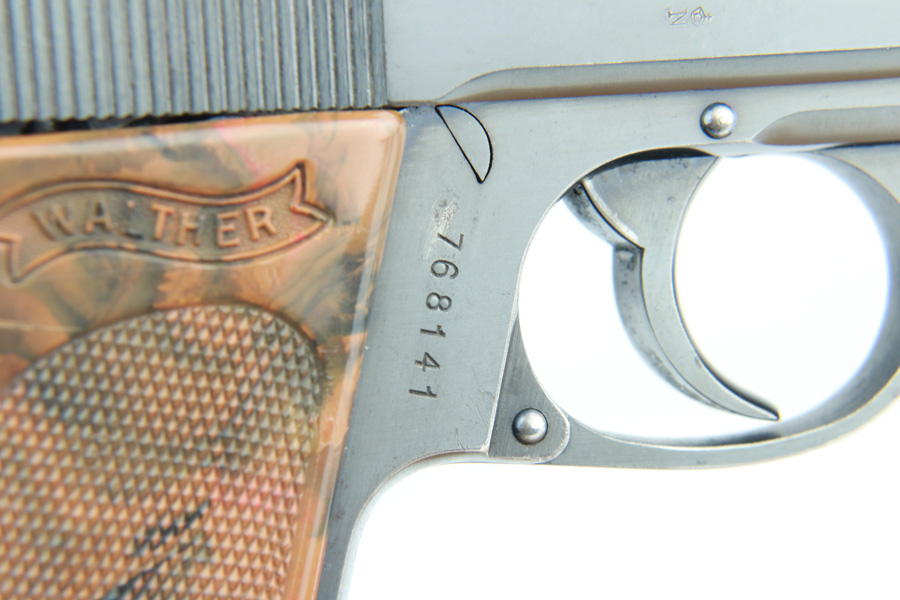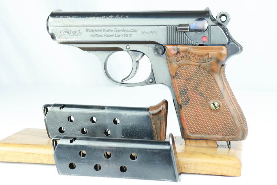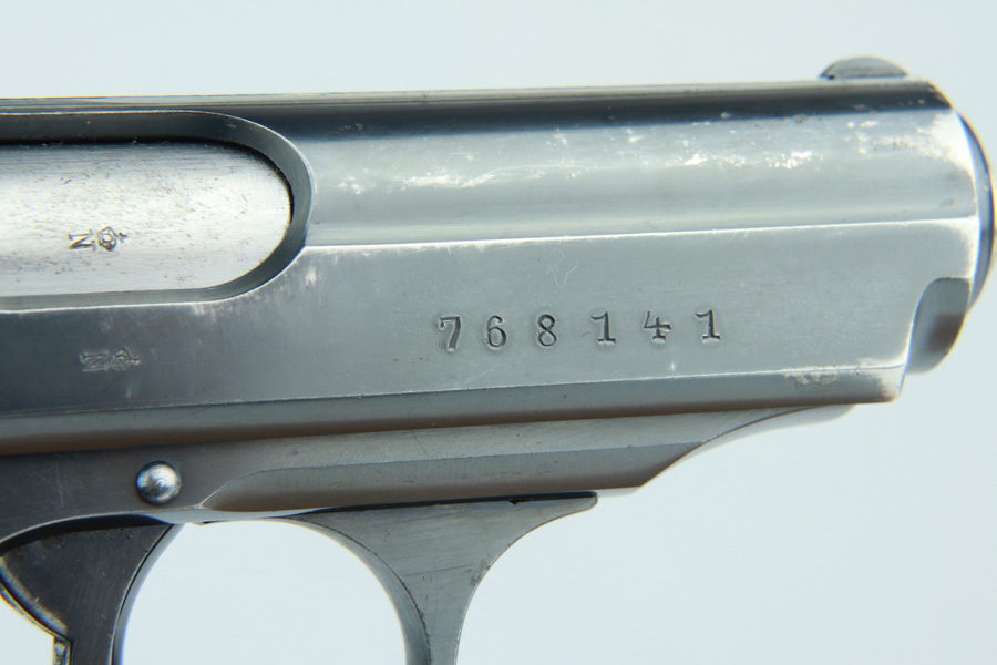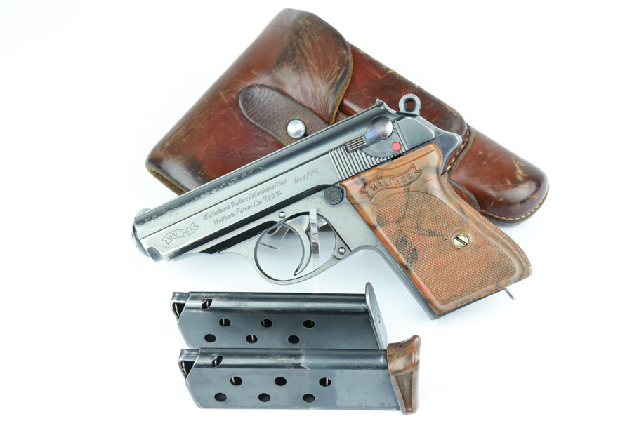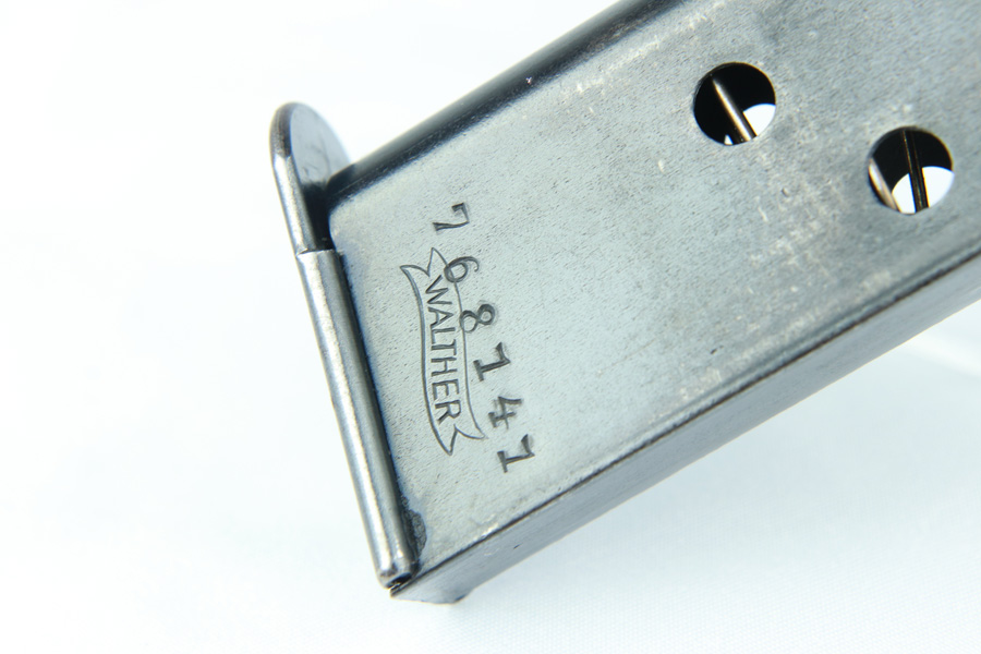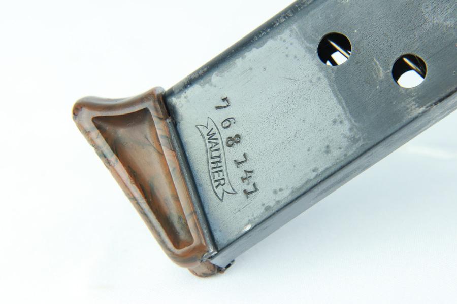 11/12/18 – This is a very early Walther PPK rig with two matching numbered magazines. From our research, it is likely a Railway issued rig based off the font of the numbering on the slide. Both magazines are numbered to the gun on the body – this is non-factory but likely done at the arsenal. The gun is all original with 92-93% high-polish blue. Early 90 degree safety. Majority of finish loss is on the rounded portions of the slide, and along the trigger guard. Grips has a few scratches and thin cracks. Finger extension on one magazine is in very good condition with only minor dings. Nice, shiny bore. Comes in an original Akah marked holster that shows age and handling wear but no major flaws.