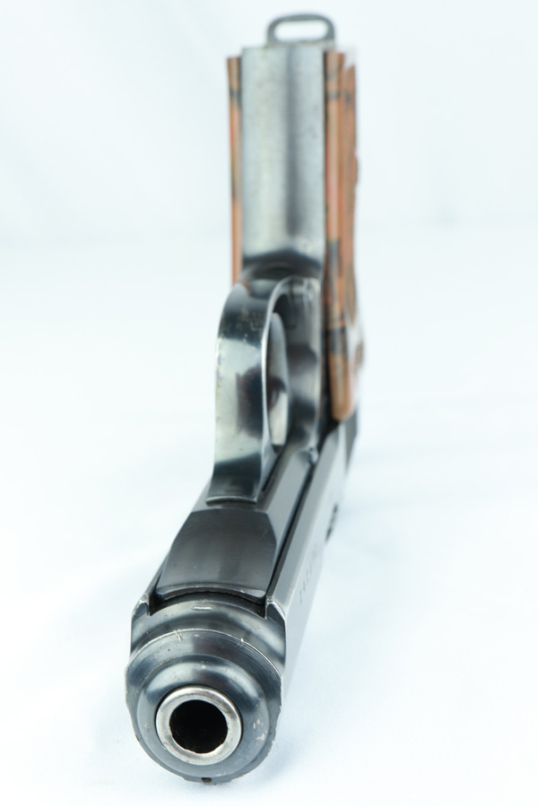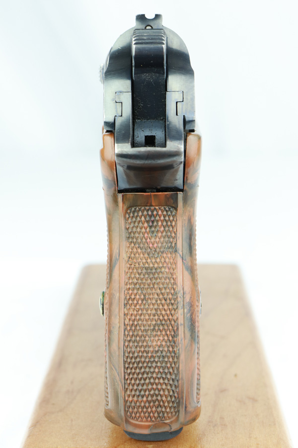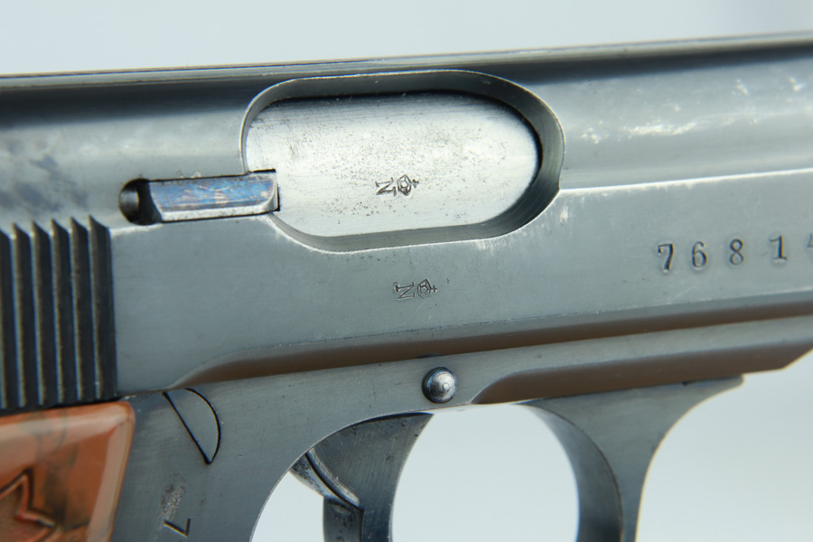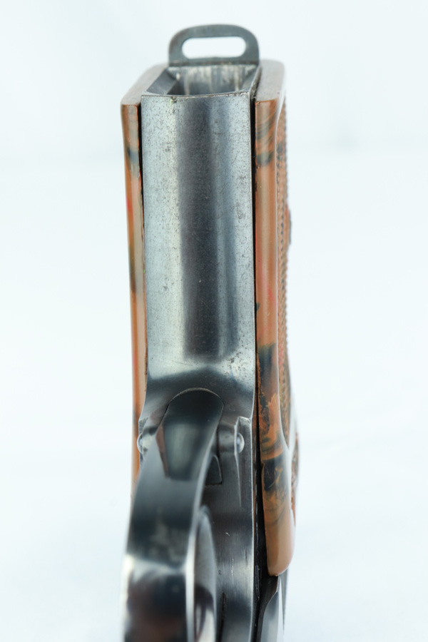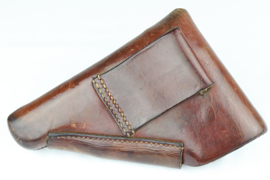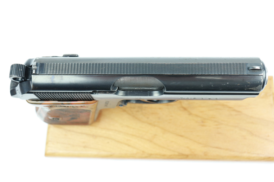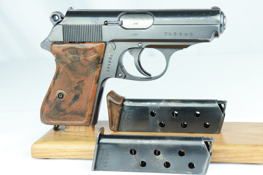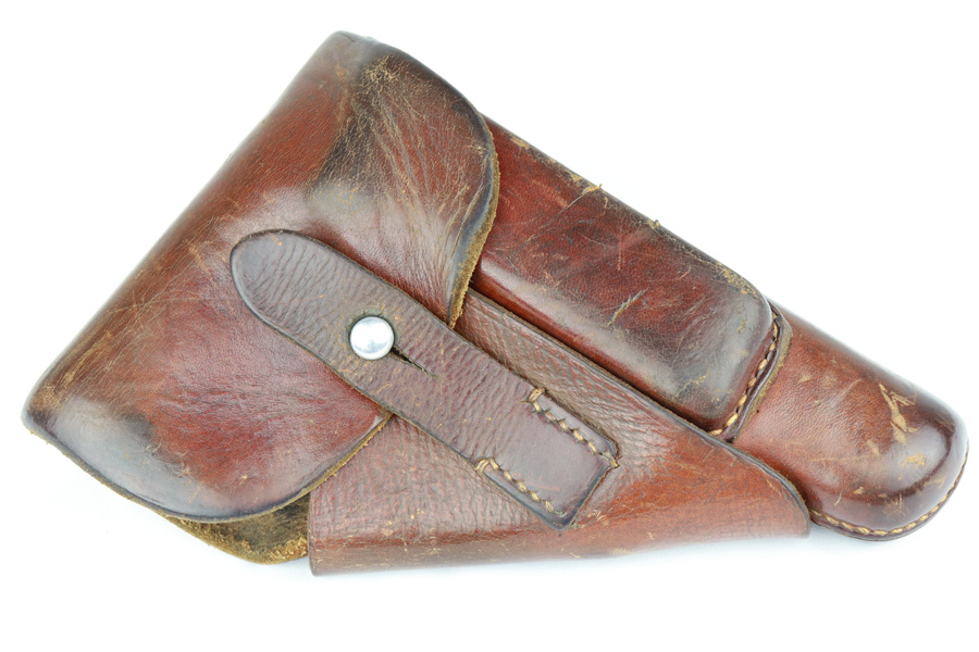 11/12/18 – This is a very early Walther PPK rig with two matching numbered magazines. From our research, it is likely a Railway issued rig based off the font of the numbering on the slide. Both magazines are numbered to the gun on the body – this is non-factory but likely done at the arsenal. The gun is all original with 92-93% high-polish blue. Early 90 degree safety. Majority of finish loss is on the rounded portions of the slide, and along the trigger guard. Grips has a few scratches and thin cracks. Finger extension on one magazine is in very good condition with only minor dings. Nice, shiny bore. Comes in an original Akah marked holster that shows age and handling wear but no major flaws.