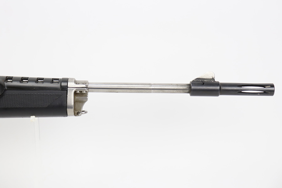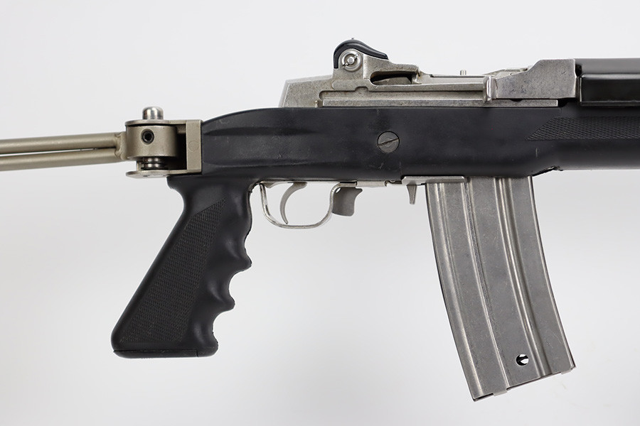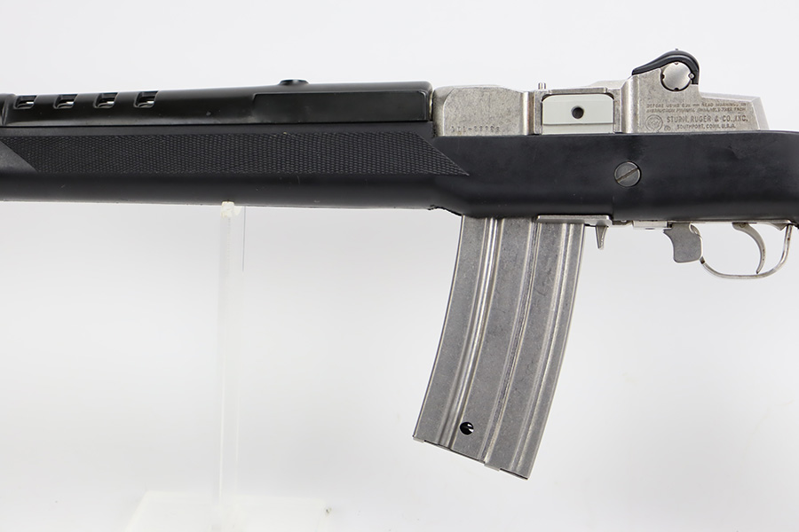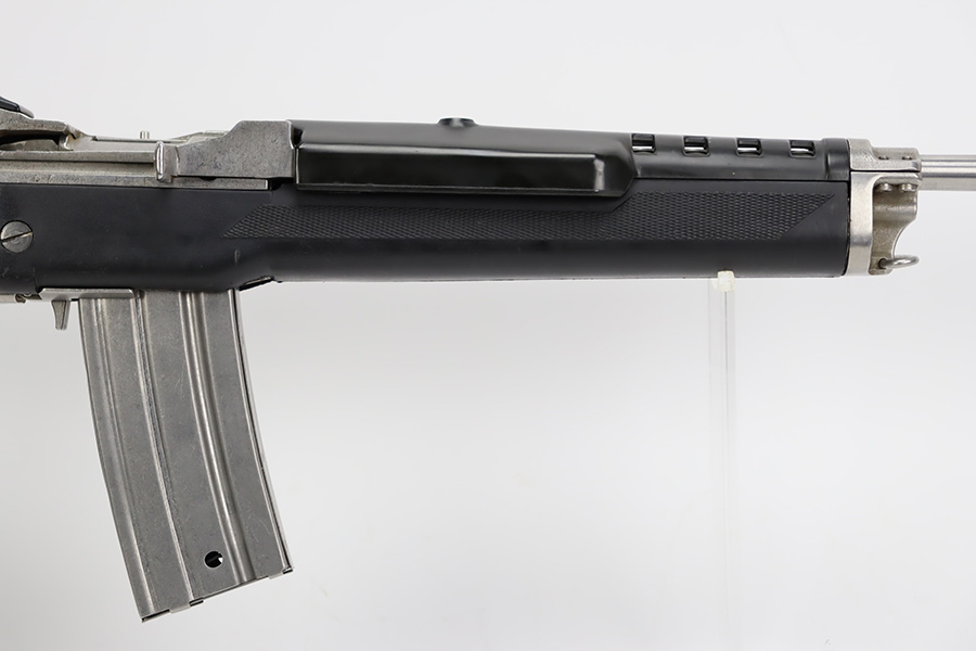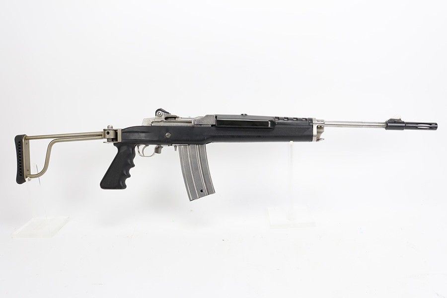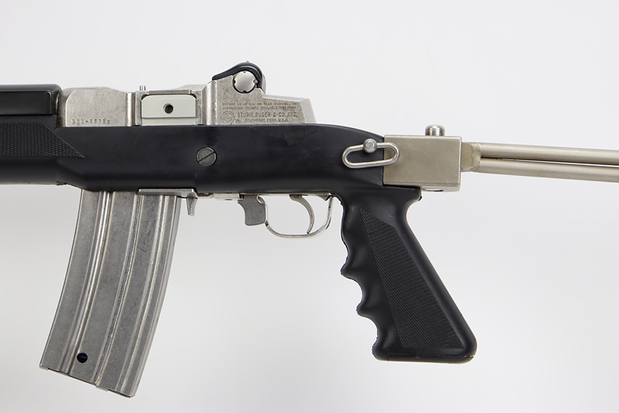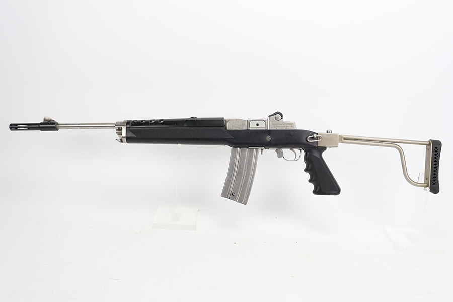 9/20/23 – This is a scarce Ruger Mini-14 that was made in 1980. It features a stainless steel finish and the tactical folding buttstock. The finish shows some oxidation/age but the rifle is in good condition overall with shiny bore and good mechanics. 20rd magazine. Introduced in 1973, the Mini-14 design was outwardly based on the M14 rifle and is, in appearance, a scaled-down version chambered in 5.56×45mm NATO, though with its own gas system design.