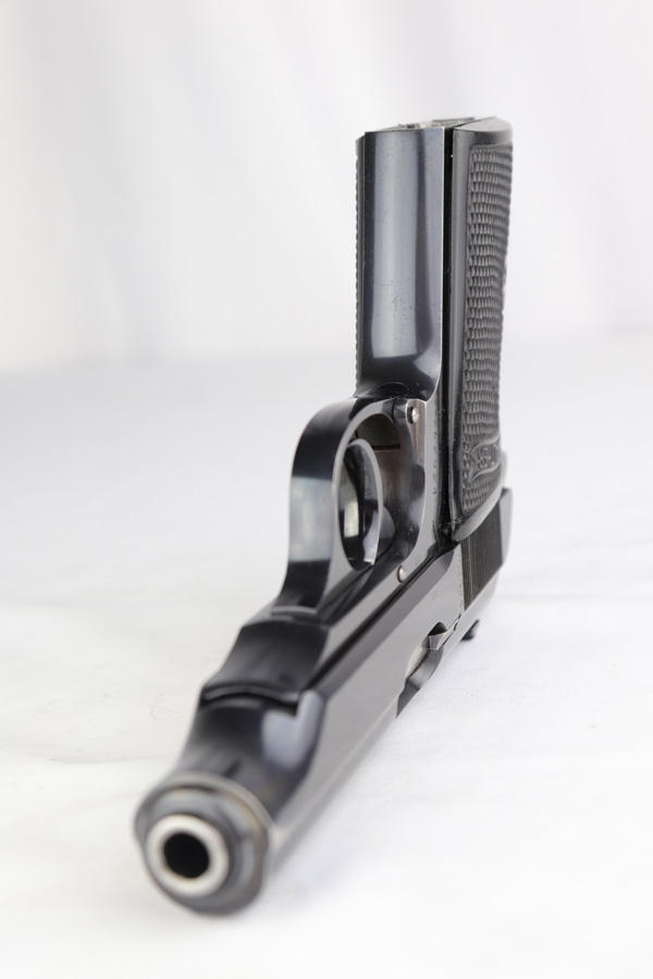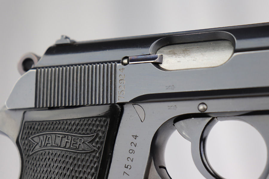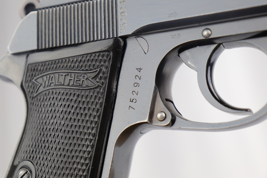 3/11/19 – This is an excellent and super early Reichsbank Walther PP, with early slab side magazine. PP production started at S/N 750,000 – making this the 2924th PP ever manufactured! These were issued to the bank arsenal where slide numbering and the matching magazine were added. The magazine with this pistol is correct but not numbered. The original finish rates at about 97%, with minor muzzle wear on each side of the slide, and minor finish loss on the bottom of the back strap. Other correct early features found on this pistol include the split firing pin, extended barrel and weighted grips. While the slide is cut for the 90 degree safety, a 60 degree safety is present. The left grip panel does have a crack, which is common on the weighted PP grips as the weighted portion pulls away from the edges and can cause these cracks. Excellent bore. Comes with a period original holster that has an ‘LPN’ marking under the strap.