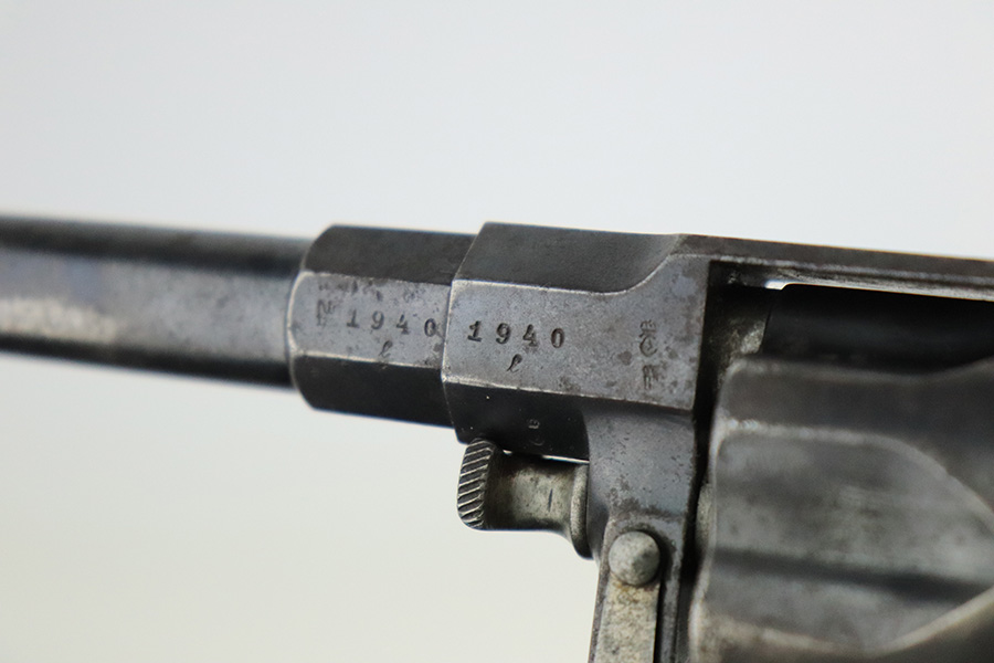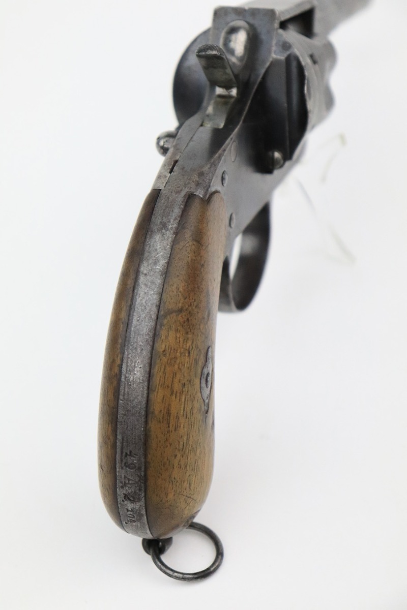 7/21/22 – This is a scarce Erfurt M1883 Reichsrevolver in all matching and original condition.  All numbered parts of this revolver match, including frame, cylinder latch, barrel, cylinder, grips and even the grip and frame screws!  The finish shows thinning and browning throughout, with a few areas of minor freckling. The frame is marked “49.A.2.104”, which may indicate an artillery regiment.  The frame is dated 1894, meaning this antique requires no license.  Bore is actually pretty shiny with fairly strong rifling considering the age and condition of the revolver, but there is some pitting.  Appears fully functional.