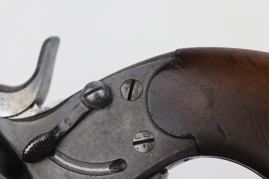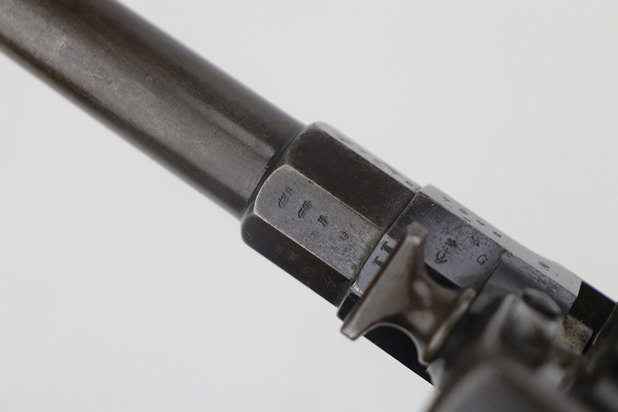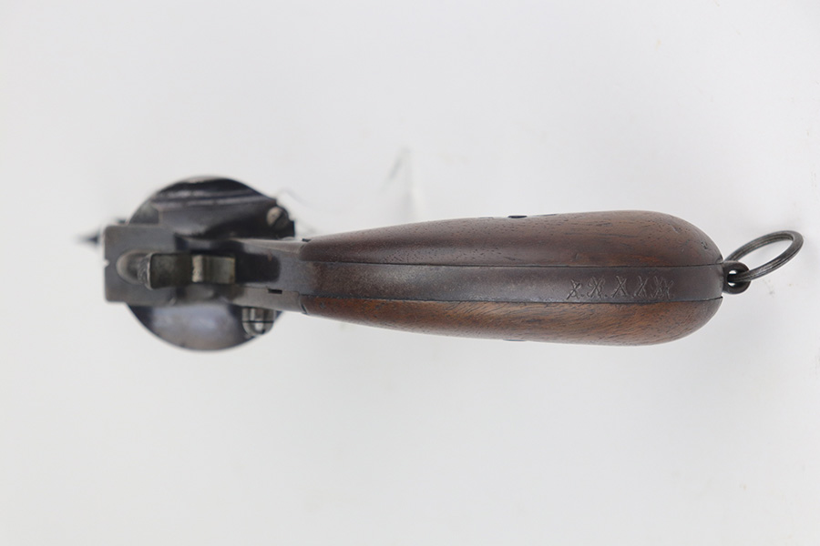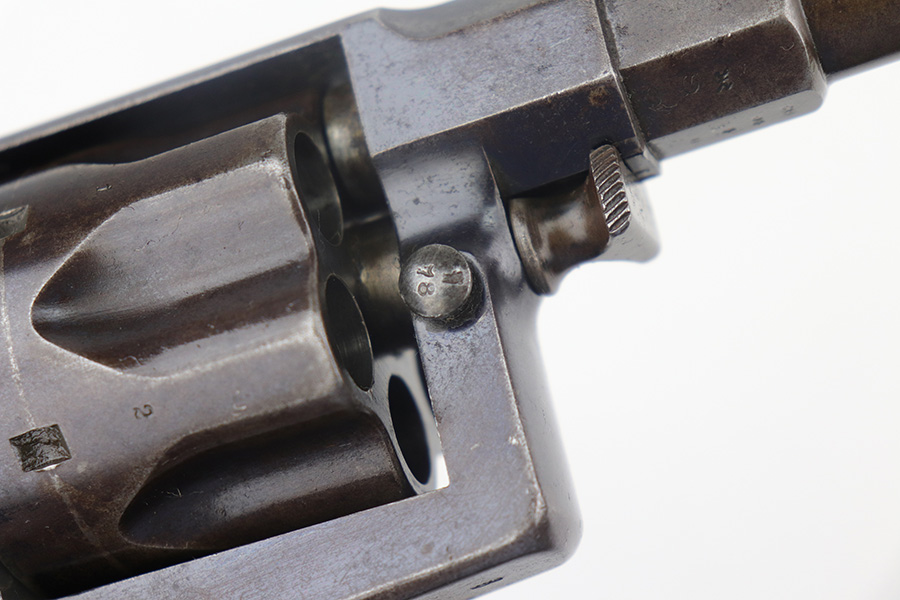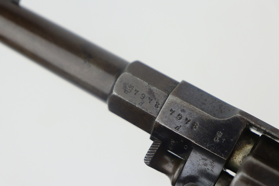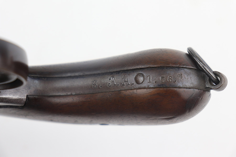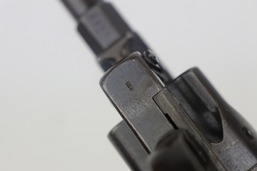 11/23/21 – This is a scarce Erfurt M1883 Reichsrevolver in all matching and original condition.  All numbered parts of this revolver match, including frame, cylinder latch, barrel, cylinder, grips and even the grip and frame screws!  The finish shows thinning and browning throughout, but with no pitting. The frame is marked “6.R.A.1.56”, which means it went to the 6th infantry.  The frame is dated 1894, meaning this antique requires no license.  Bore is actually pretty shiny with fairly strong rifling considering the age and condition of the revolver, but there is some freckling.  Appears fully functional.