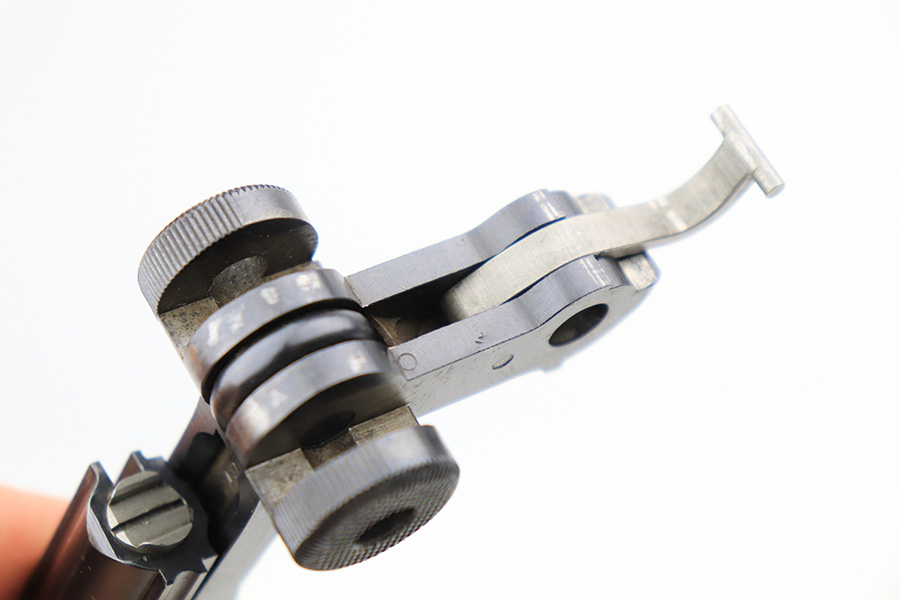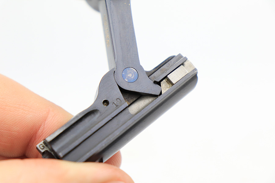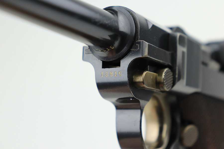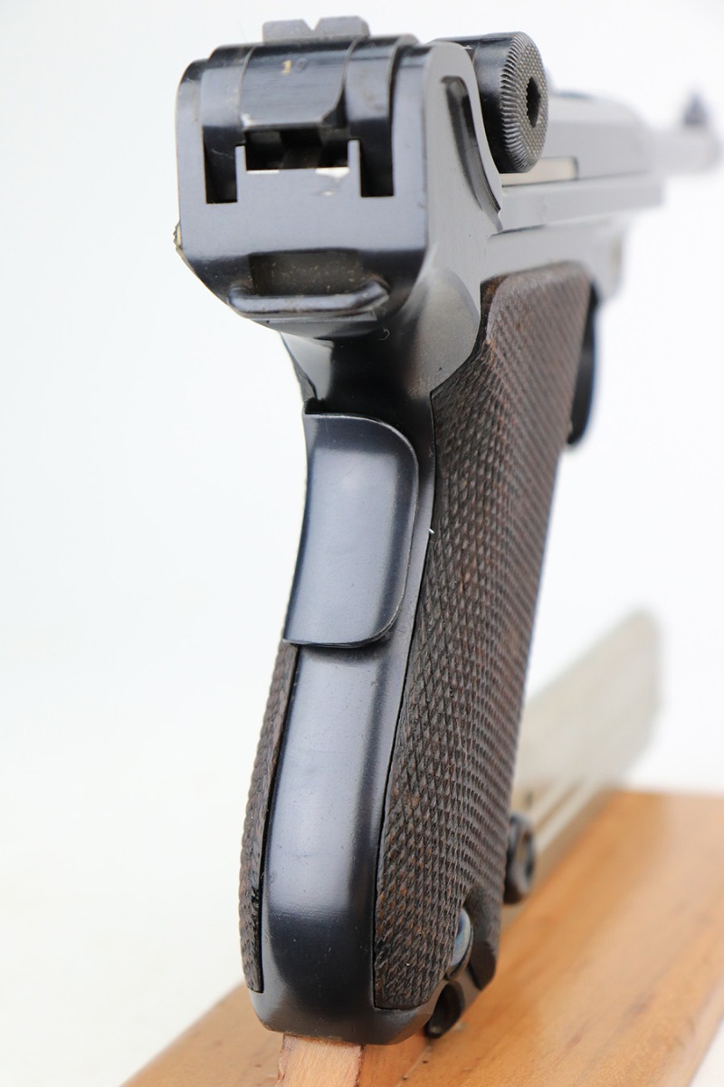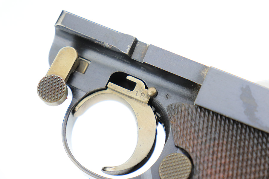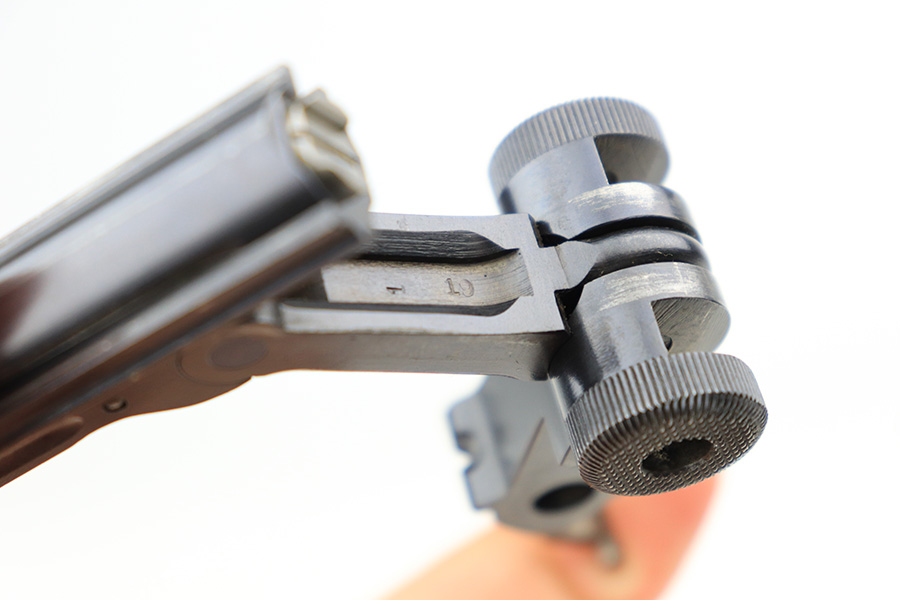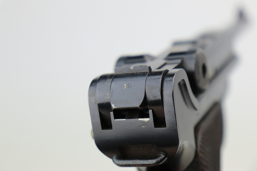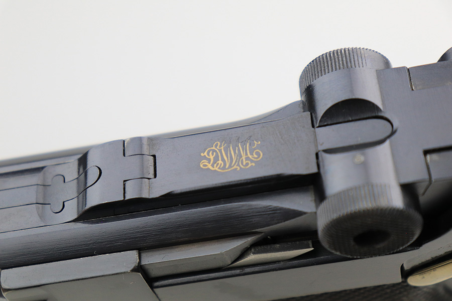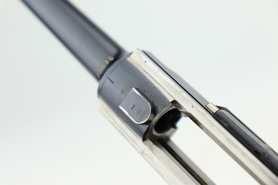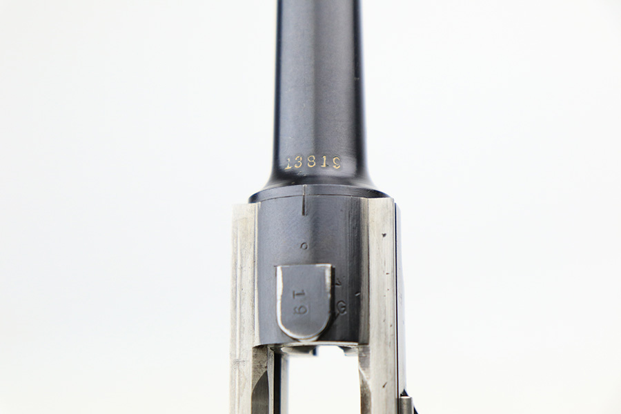5/6/22 – This is a rare and original 1906 Swiss DWM Luger in excellent condition. Only a few thousand of these produced, and this one has about 97% of the blue remaining with a little muzzle wear and a spot of bluing loss on the bottom of the front strap. There’s also an area of discoloration on the left side of the frame. Beautiful strawed small parts and a mint bore. Excellent, unmarked grips with no chips or cracks. Correct aluminum mag with blank base.