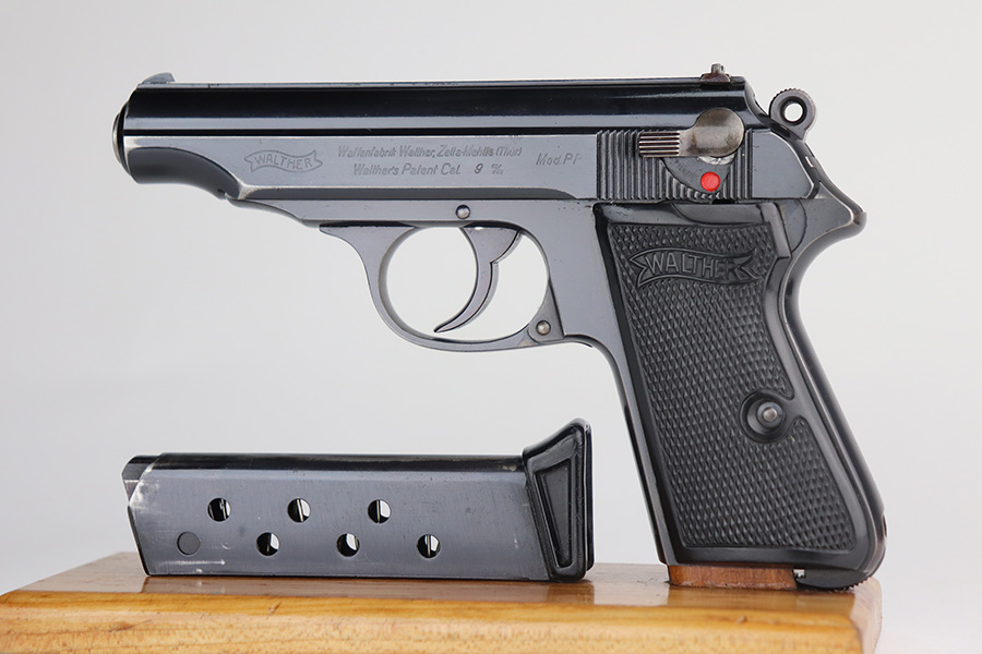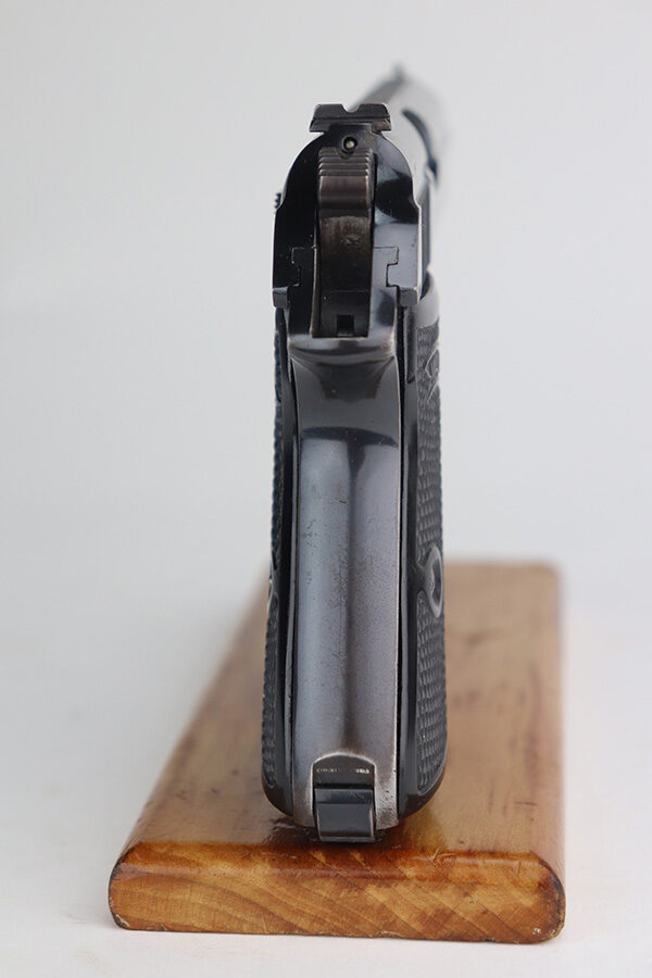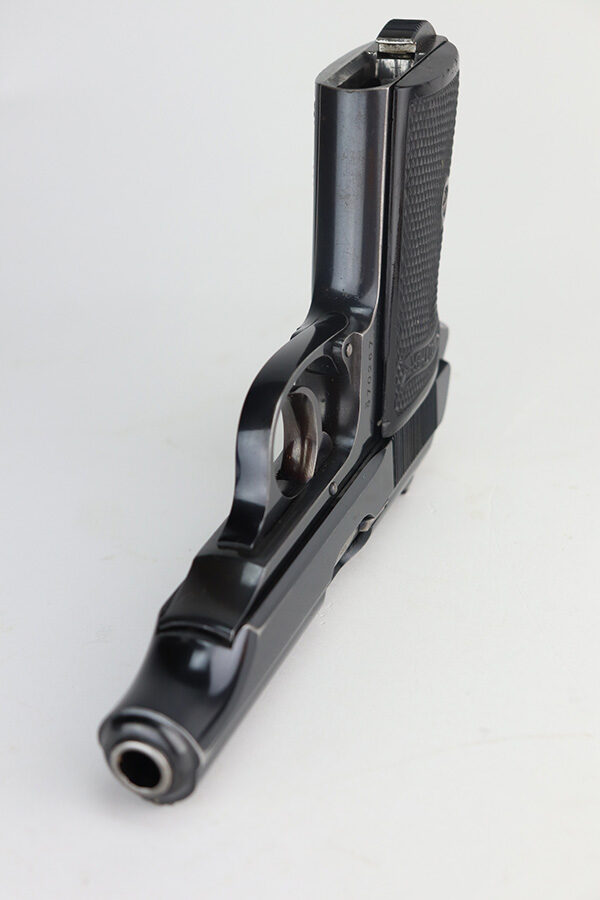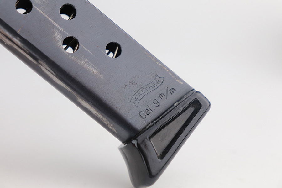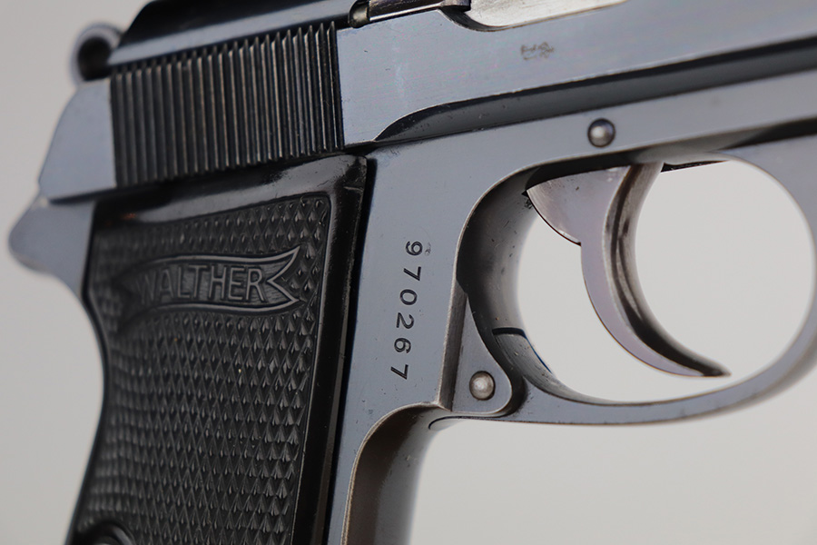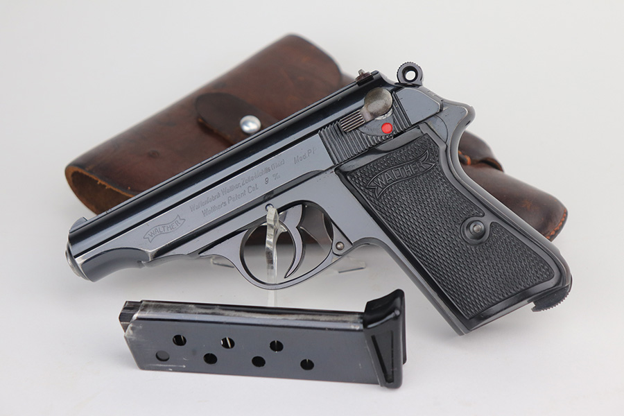 8/2/21 – This is an excellent example of a scarce 9mm Walther PP sold in the commercial market in 1937. It is all matching and has the proper “Crown N” proofs. It comes with a leading edge Akah holster (the name “Krugel” is written on the inside and outside) and one proper 9mm finger extension magazine. It has retained about 97% of its original high polish finish. There is very minor wear along the high edges of the slide and around the muzzle. Very tiny pin-pricking on the straps. Comes with excellent grips. Mint bore.