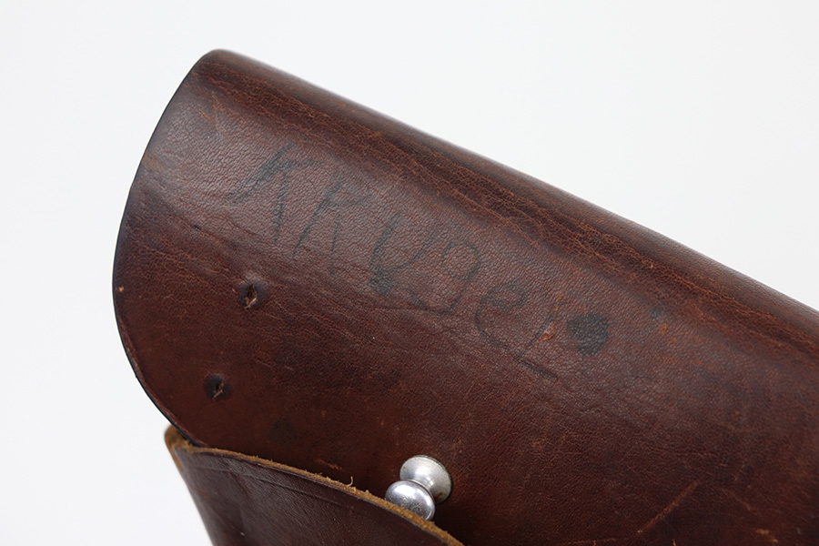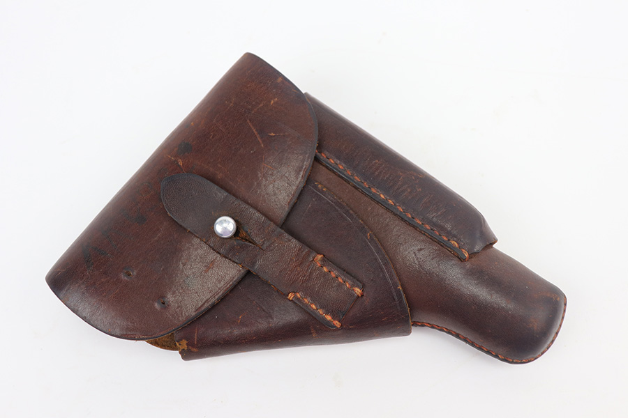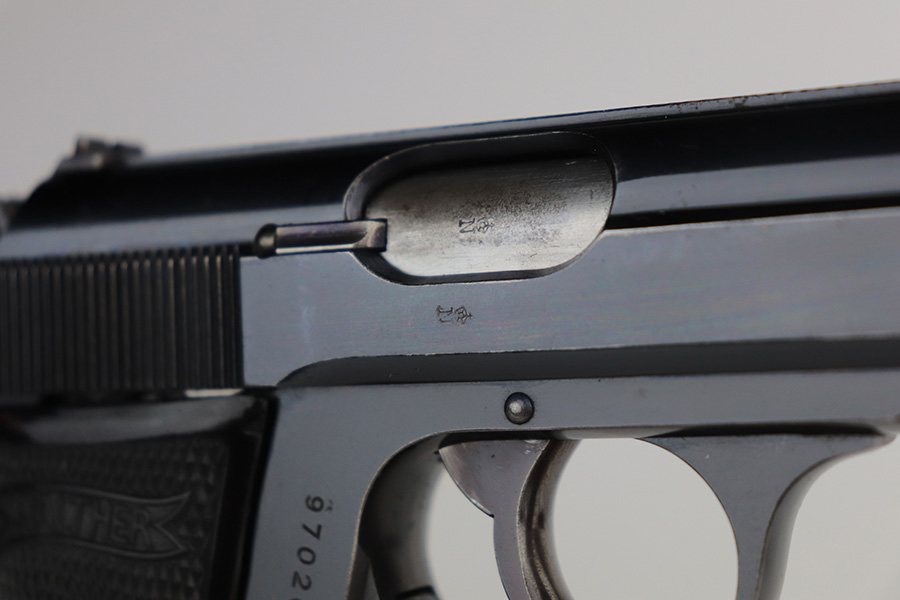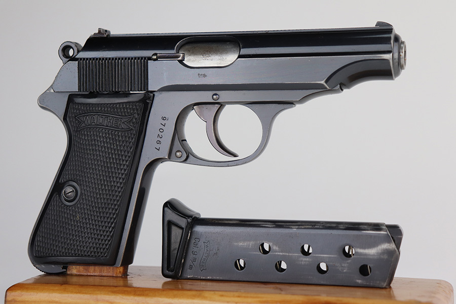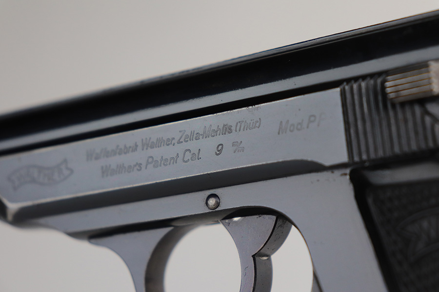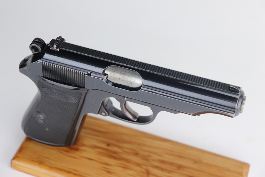 8/2/21 – This is an excellent example of a scarce 9mm Walther PP sold in the commercial market in 1937. It is all matching and has the proper “Crown N” proofs. It comes with a leading edge Akah holster (the name “Krugel” is written on the inside and outside) and one proper 9mm finger extension magazine. It has retained about 97% of its original high polish finish. There is very minor wear along the high edges of the slide and around the muzzle. Very tiny pin-pricking on the straps. Comes with excellent grips. Mint bore.