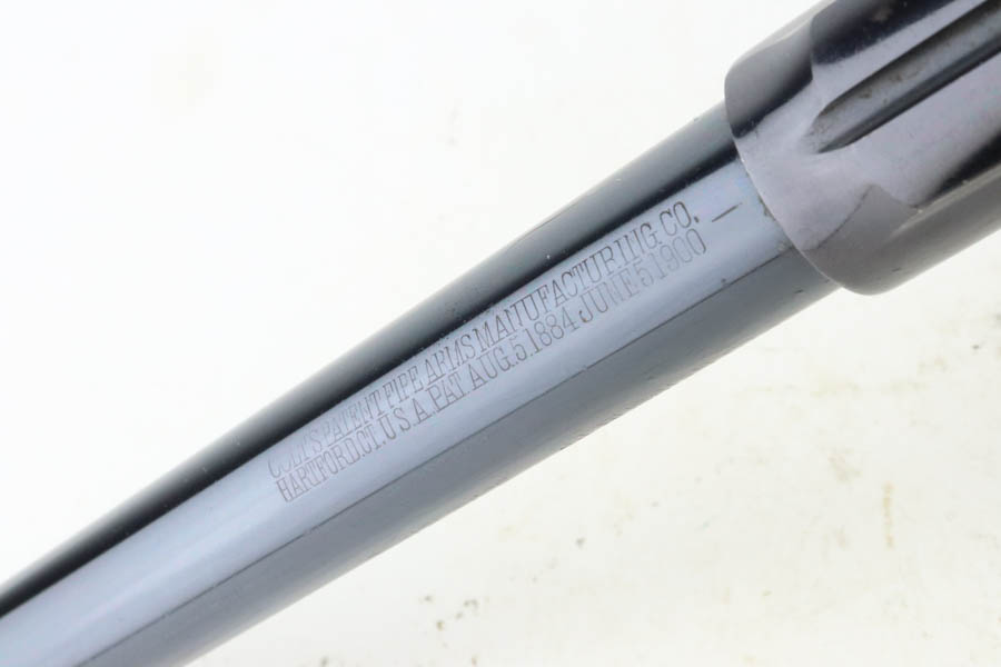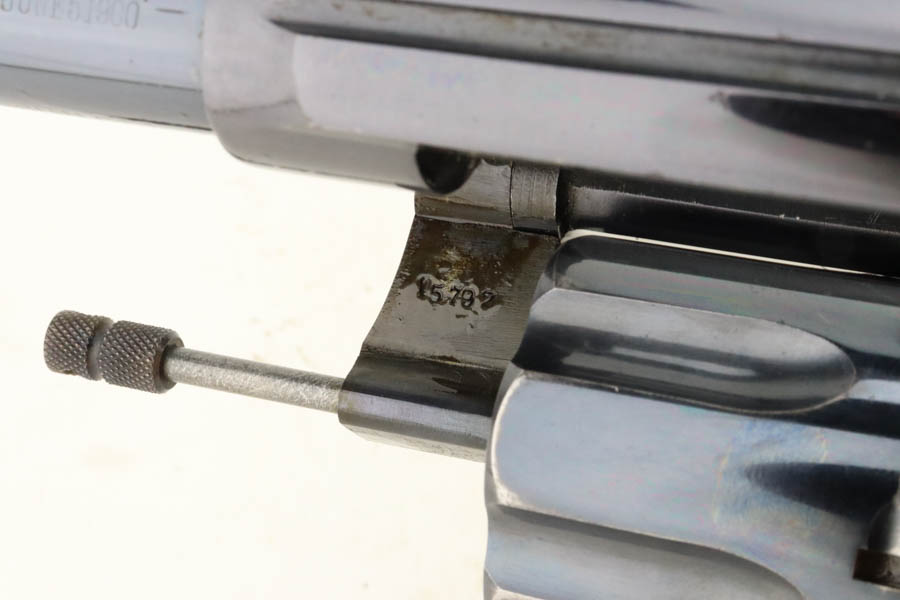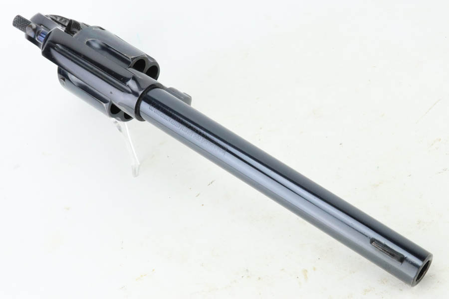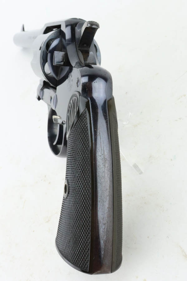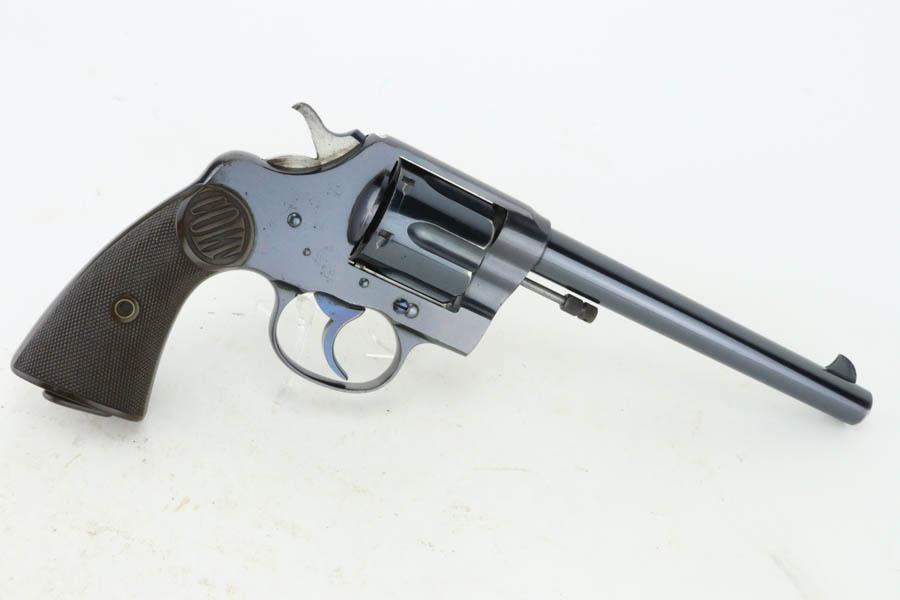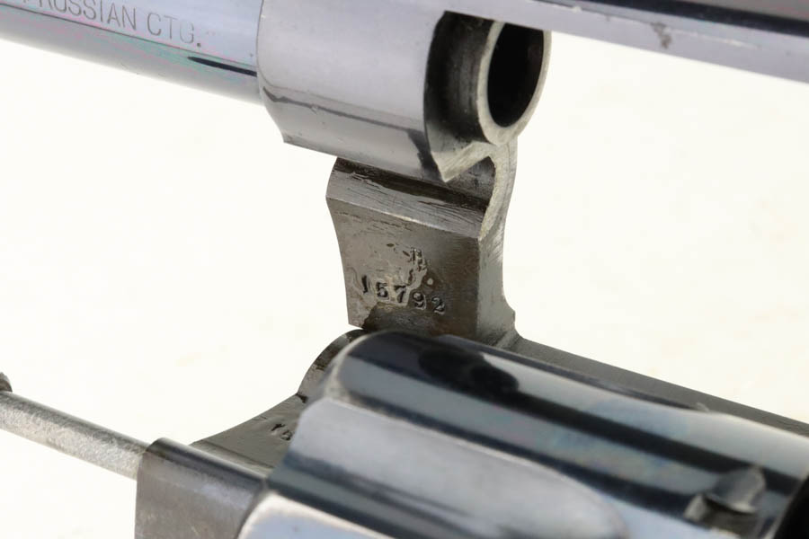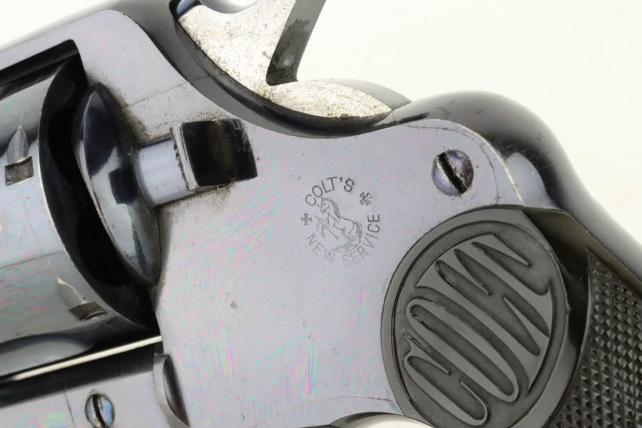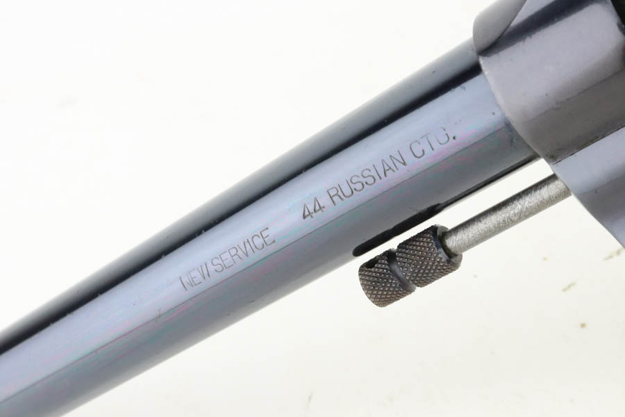 7/16/24 – This is an excellent a scarce Colt New Service Revolver from 1906. It has a 7.5 inch barrel that is marked “.44 RUSSIAN CTG” on the left side. It is matching and has retained about 95% of its original high polish finish. There is minor muzzle and high edge wear, some very light surface scratches here and there, and some flaking in the finish with light brown patina on the grip straps. Vibrant fire-bluing on the hammer, trigger, and screws. Fitted with period-correct hard rubber grips. Minty bore. Smooth action.