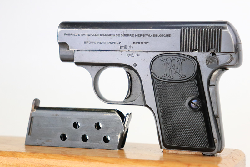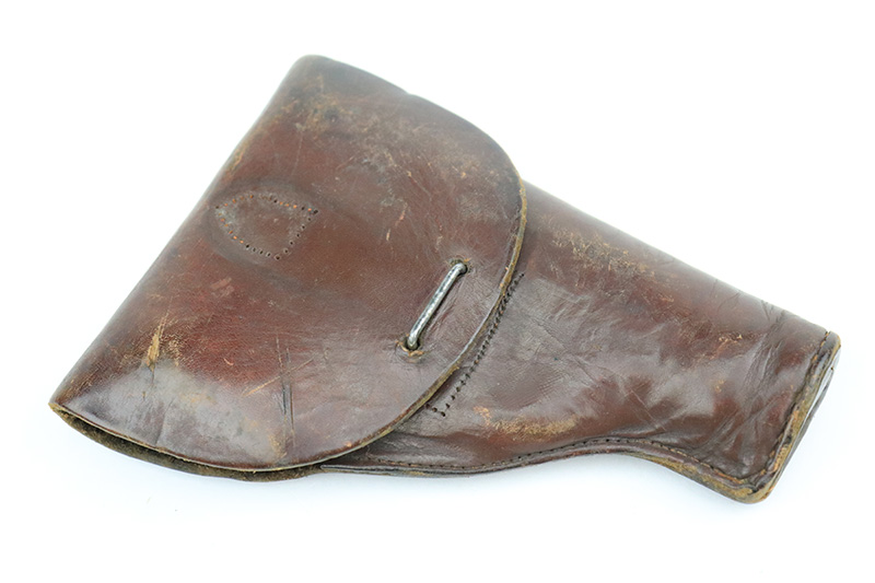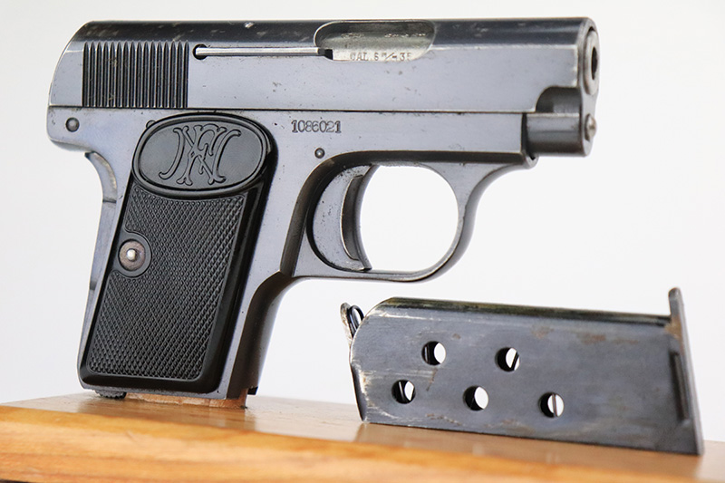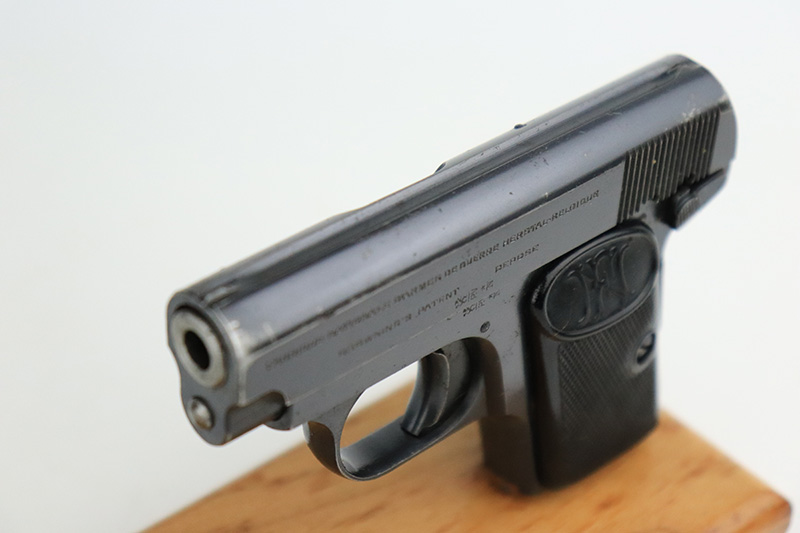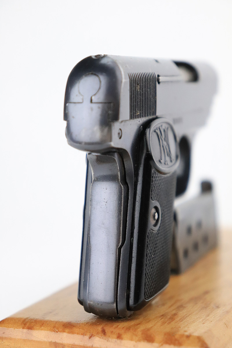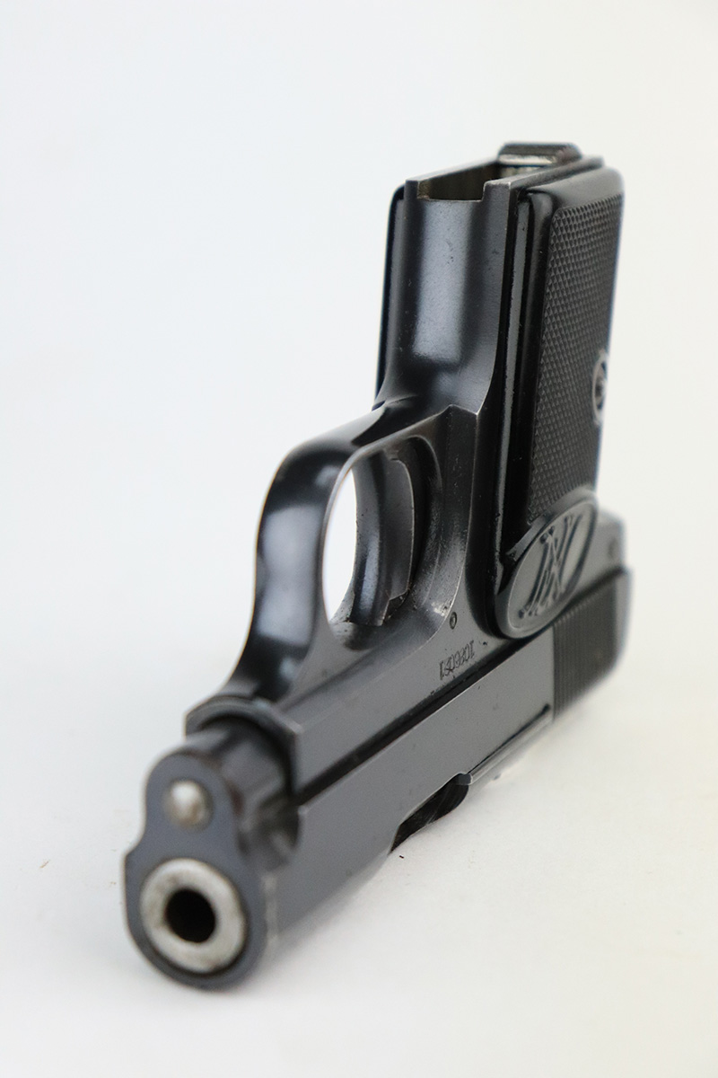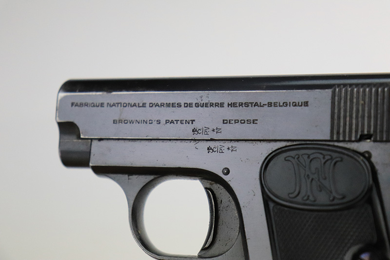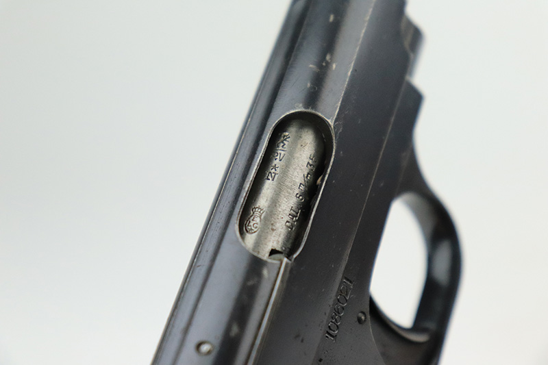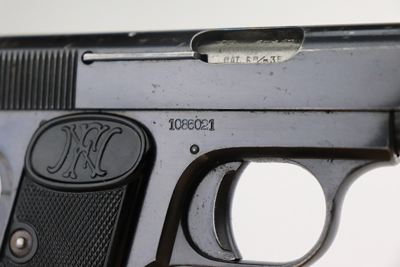8/26/22 – This is an excellent example of an FN Browning Model 1905 that was manufactured in 1940 under German occupation. A small amount of 1905’s were produced from July-August of 1940 before the arrival of the first weapons inspector. The gun is all matching and has the proper Belgian proofs. It comes as a rig with a brown leather holster (missing closure strap) and one proper magazine. It has retained about 96% of its original bluing. There is minor muzzle wear and some light spotty wear along the high edges of both sides of the slide. Comes with excellent black bakelite grips. Minty bore.