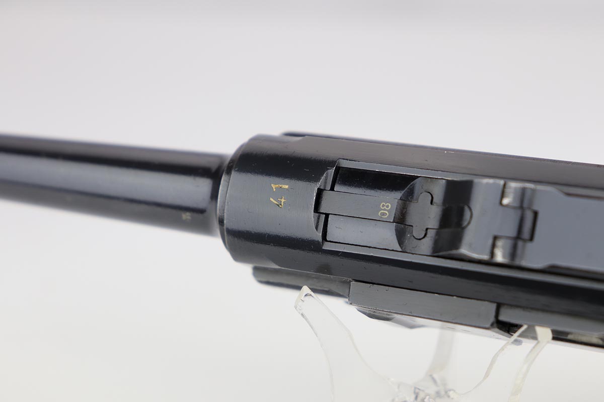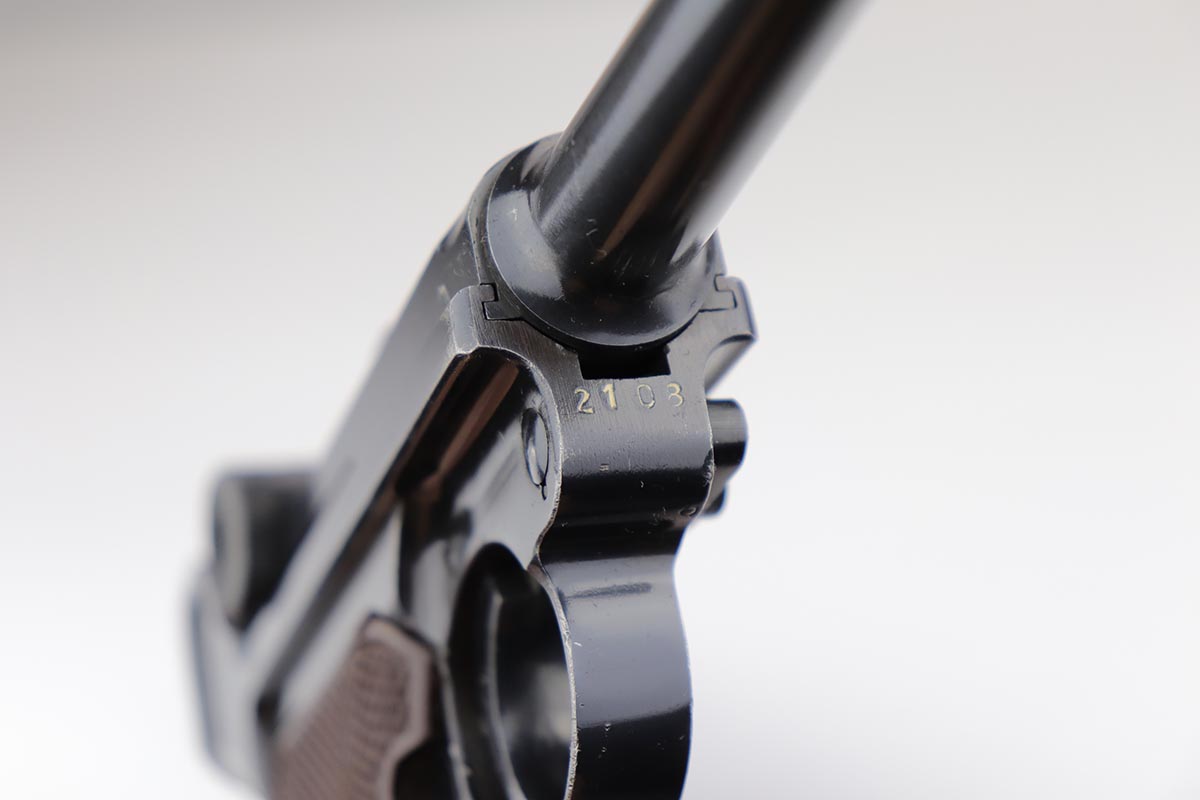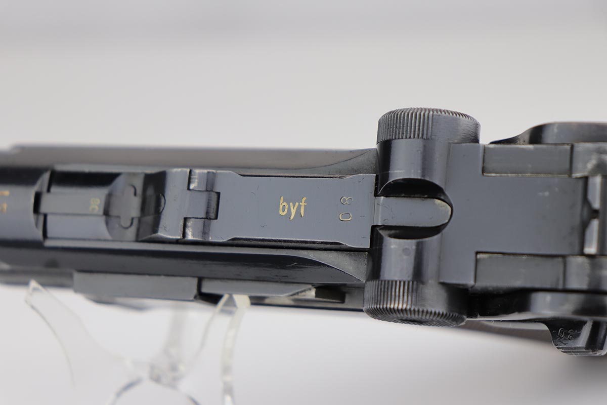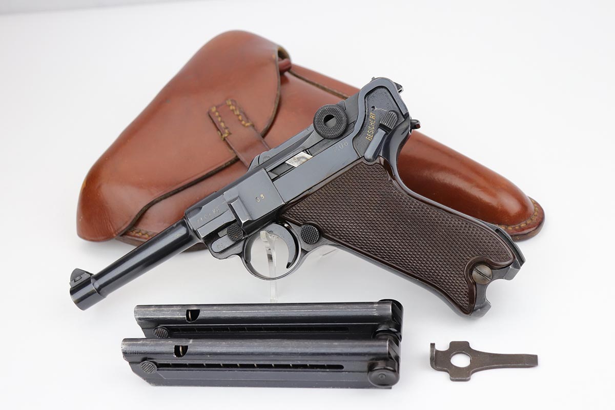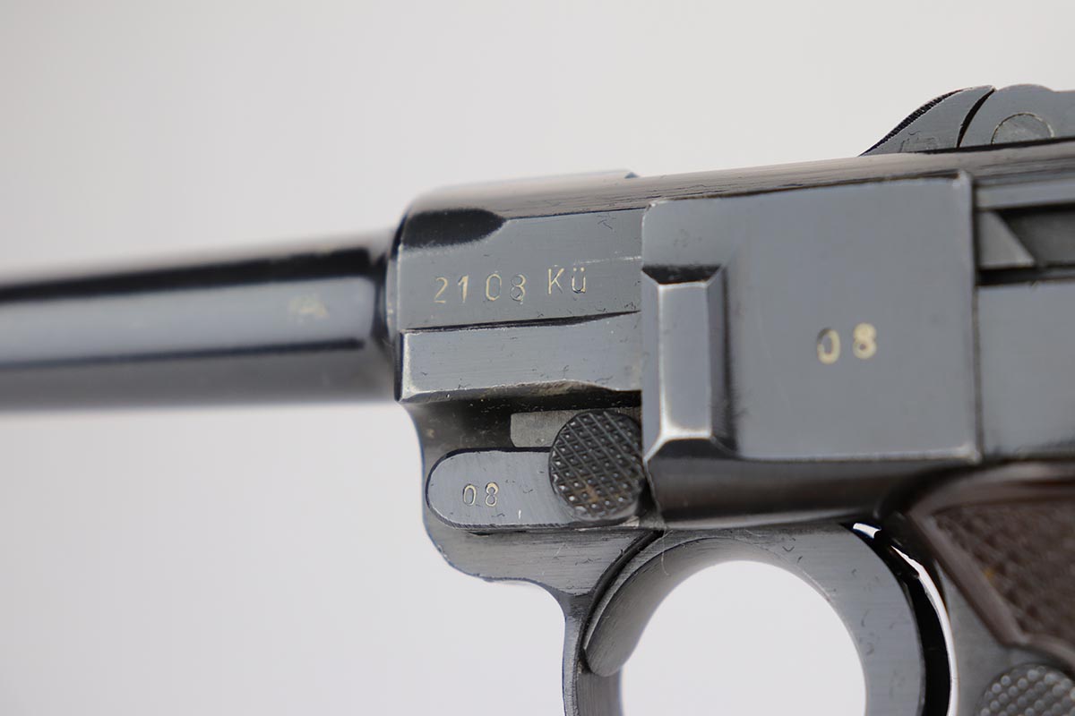 9/25/19 – This is an exceptional example of the very well known and highly sought after Luftwaffe Inspected Ku marked Luger rig. This is one of the approx 5,000 that were produced with the Ku suffix, and one of only 2,700 that were produced with ’41 date on chamber and ‘byf’ code on toggle. The pistol is completely matching and original. The grips are Krieghoff-style and in excellent condition. Black Widow style magazine is present and correct for this variation, and the rig has two total. Barrel and receiver are Luftwaffe eagle marked. The finish on the gun rates at about 98%, with only minor high edge wear on muzzle and sideplate, and a couple of thin scratches on the left side of the frame. The bore is excellent but does have minor frost. The rig includes an unmarked tool, and is completed by an exceptional and rare holster with 1944 date and ‘cdg’ maker mark. Three Luftwaffe inspection stamps and the use of replacement parts and a blue finish that was not as well done as Mauser production are all the classic signs of the Ku luger. There has been more speculation about the origin and circumstances surrounding these Lugers than any other WW2 Variant Luger. The prevailing theory is that they were assembled in very early 1943 for the Luftwaffe out of leftover Mauser parts by an unknown contractor that the code Ku stands for. This has been assumed to be the firm of Adolph Kurschner – Metalwaffenfabrik in Bavaria, but this may never be definitively verified.