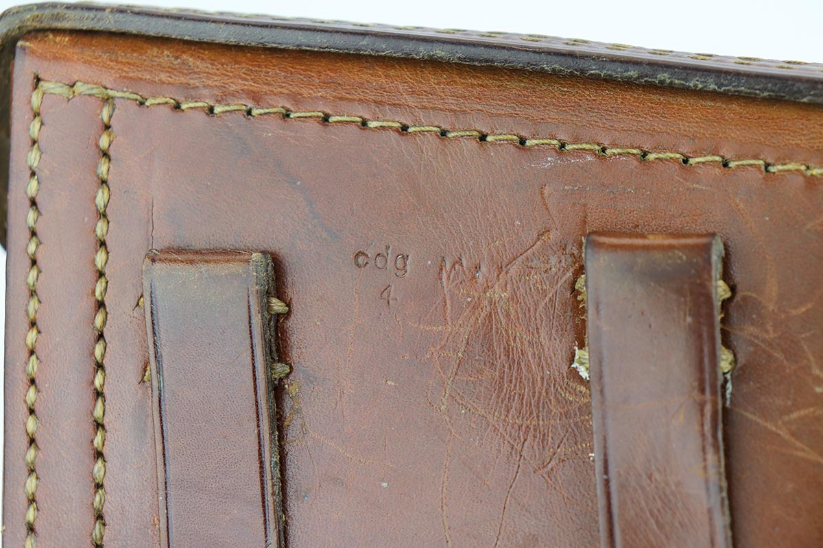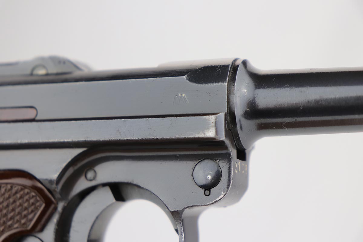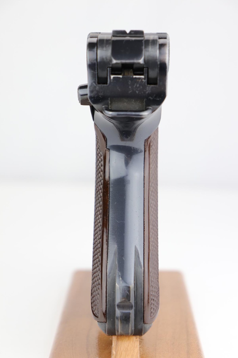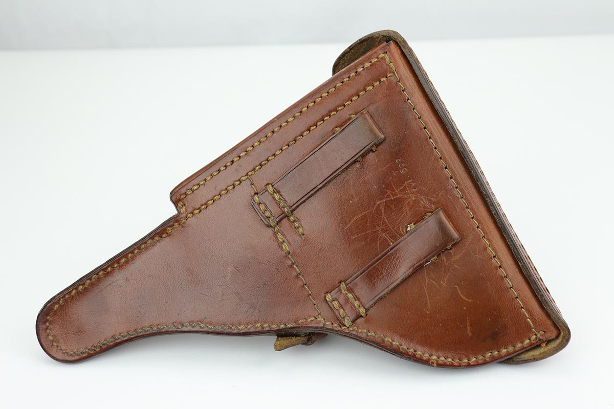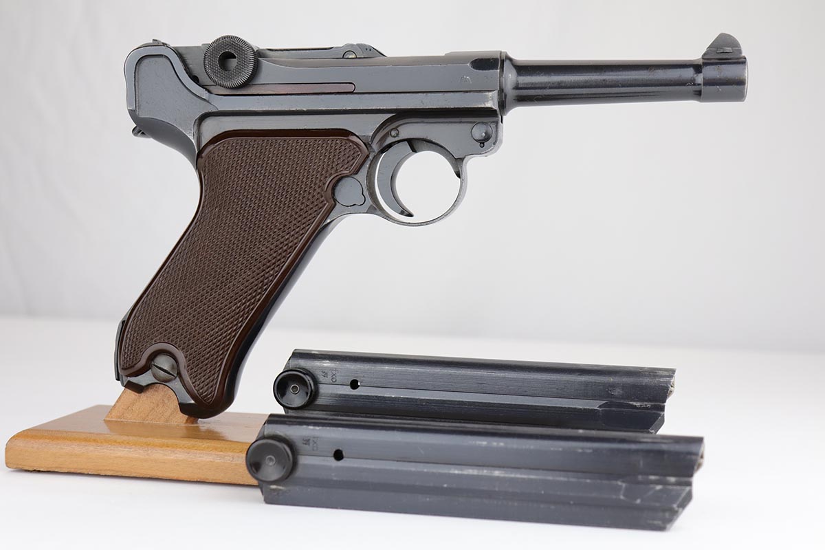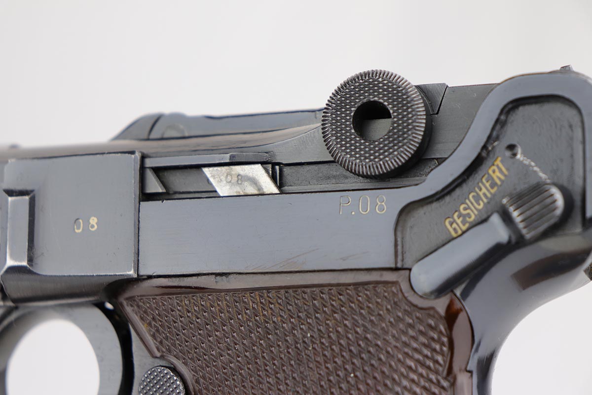 9/25/19 – This is an exceptional example of the very well known and highly sought after Luftwaffe Inspected Ku marked Luger rig. This is one of the approx 5,000 that were produced with the Ku suffix, and one of only 2,700 that were produced with ’41 date on chamber and ‘byf’ code on toggle. The pistol is completely matching and original. The grips are Krieghoff-style and in excellent condition. Black Widow style magazine is present and correct for this variation, and the rig has two total. Barrel and receiver are Luftwaffe eagle marked. The finish on the gun rates at about 98%, with only minor high edge wear on muzzle and sideplate, and a couple of thin scratches on the left side of the frame. The bore is excellent but does have minor frost. The rig includes an unmarked tool, and is completed by an exceptional and rare holster with 1944 date and ‘cdg’ maker mark. Three Luftwaffe inspection stamps and the use of replacement parts and a blue finish that was not as well done as Mauser production are all the classic signs of the Ku luger. There has been more speculation about the origin and circumstances surrounding these Lugers than any other WW2 Variant Luger. The prevailing theory is that they were assembled in very early 1943 for the Luftwaffe out of leftover Mauser parts by an unknown contractor that the code Ku stands for. This has been assumed to be the firm of Adolph Kurschner – Metalwaffenfabrik in Bavaria, but this may never be definitively verified.