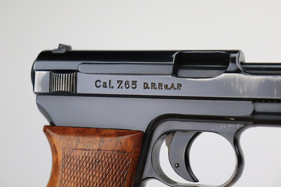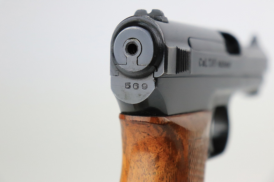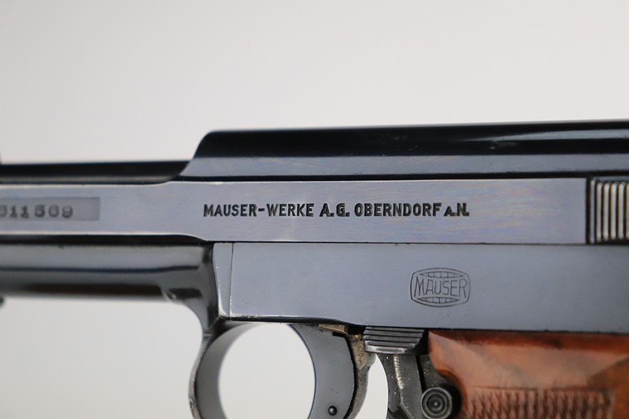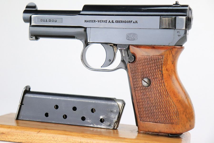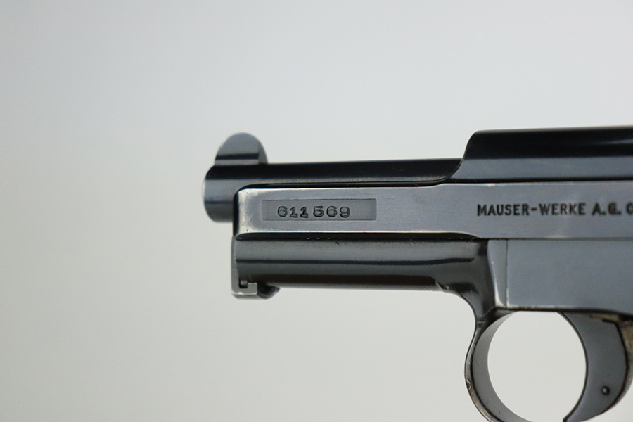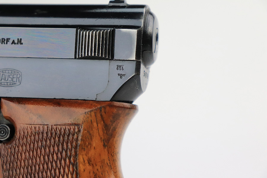 6/9/22 – This is a scarce variation Nazi army issued Mauser model 1934. This gun would have been produced just before the factory switched over to HSC production, around 1940-1941. The pistol is proofed on the back left side of the frame with Eagle/655 and a test-fire eagle stamp. There were only about 8,000 of these pistols issued in this way. It is all matching and has retained about 95% of its original high polish finish. Minor muzzle wear and very minor wear around the high edges of the slide. An area of minor wear on the right side of the slide and a few tiny spots on the top of the slide. Comes with a minty period-correct wood grip and one proper magazine. Stone-mint bore.