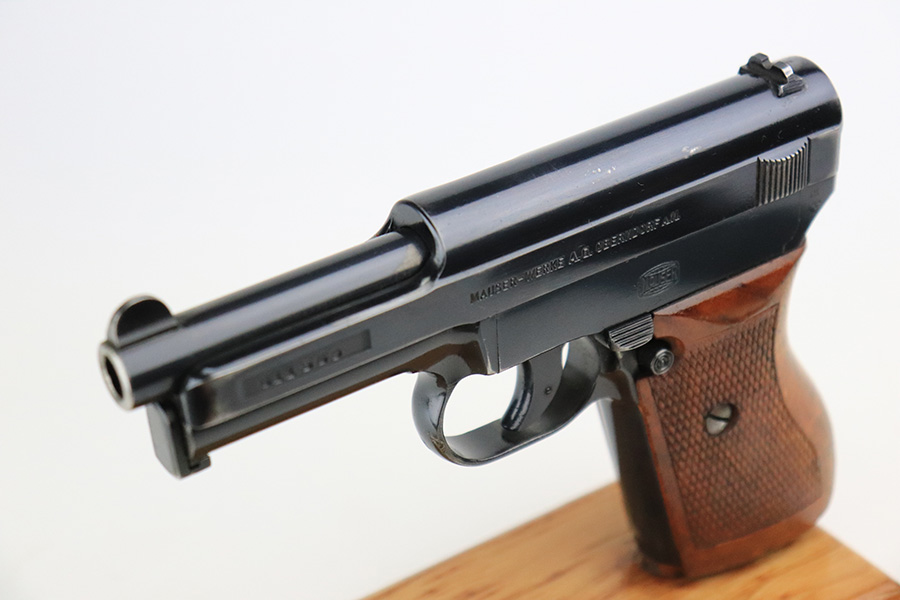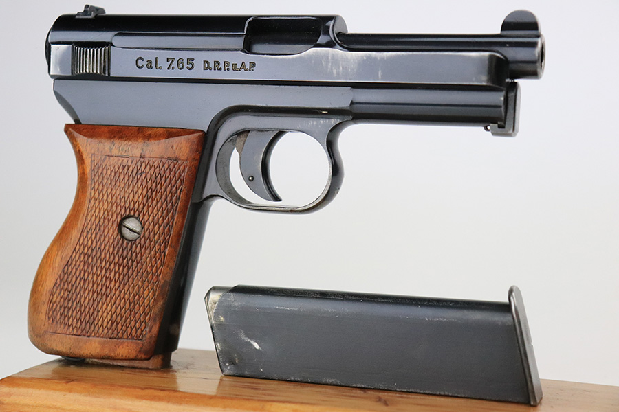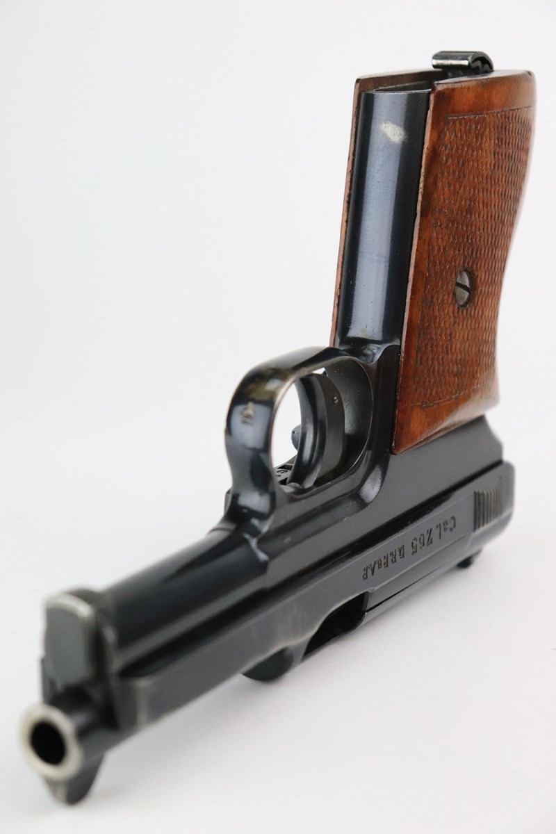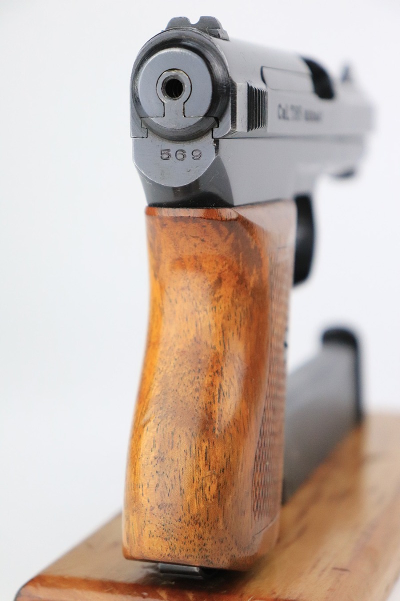 6/9/22 – This is a scarce variation Nazi army issued Mauser model 1934. This gun would have been produced just before the factory switched over to HSC production, around 1940-1941. The pistol is proofed on the back left side of the frame with Eagle/655 and a test-fire eagle stamp. There were only about 8,000 of these pistols issued in this way. It is all matching and has retained about 95% of its original high polish finish. Minor muzzle wear and very minor wear around the high edges of the slide. An area of minor wear on the right side of the slide and a few tiny spots on the top of the slide. Comes with a minty period-correct wood grip and one proper magazine. Stone-mint bore.