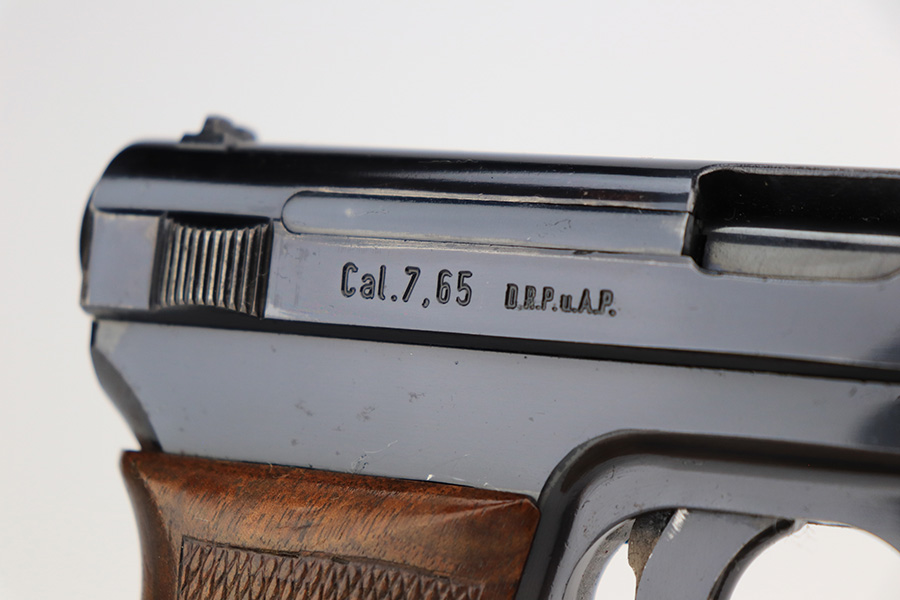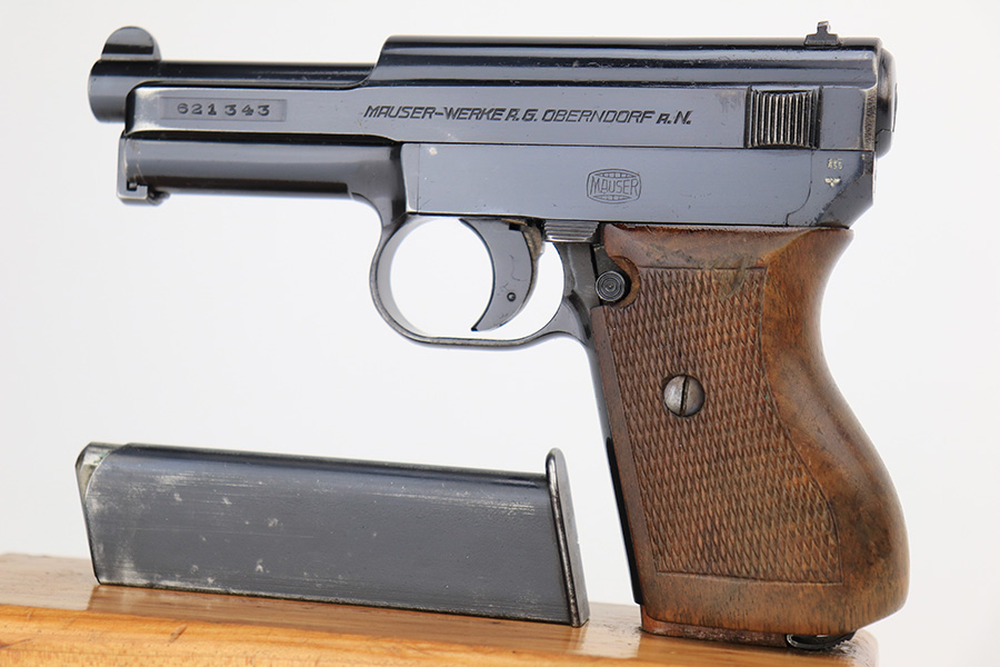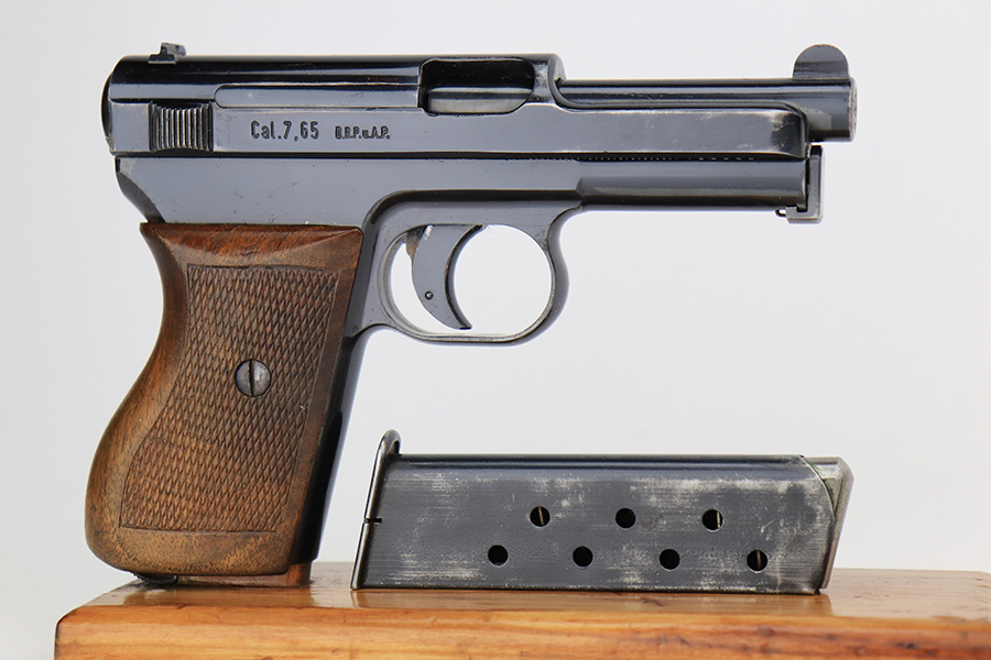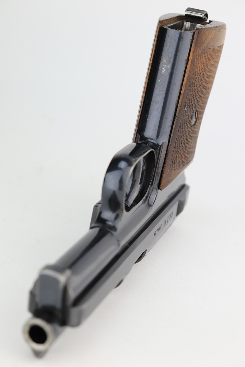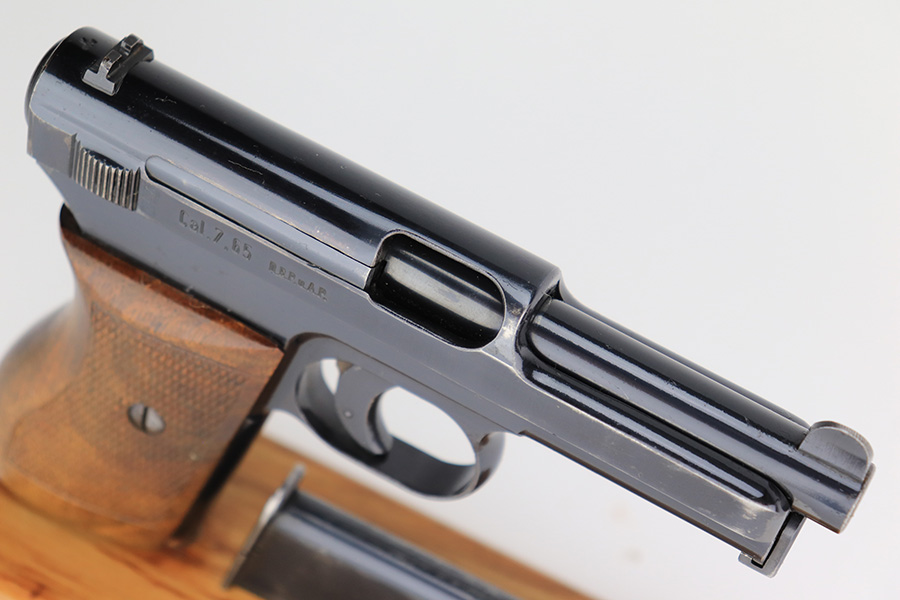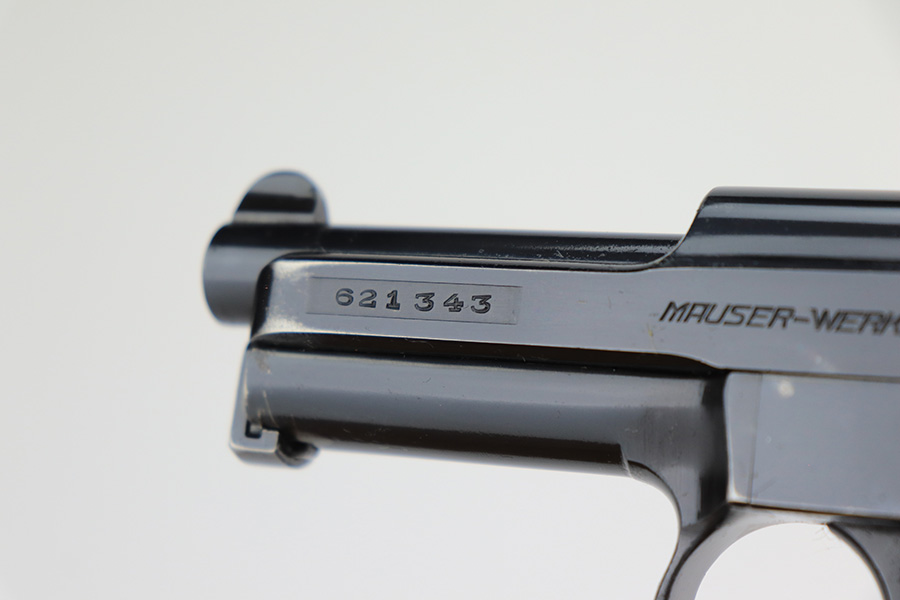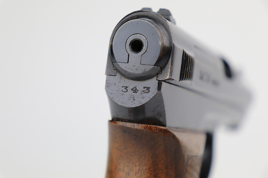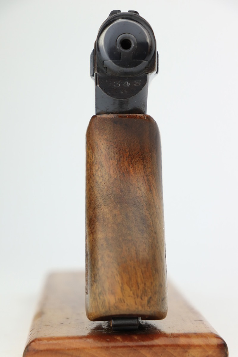 5/5/23 – This is an excellent example of a Mauser Model 1934 issued to the Nazi army during WW2. It was made around 1940. Only about 8,000 of this variation made. All matching with the proper Eagle test proof and “Eagle 655” military acceptance proof on the left side of the tang. It has retained about 95% of its original high polish finish. Very minor wear around the muzzle and on the high edges in general. A few tiny dots of discoloration on the left side of the gun. Light spotty wear on the front strap. Excellent period-correct wood grip – small bruise on the left side. Comes with a proper magazine. Mint bore.